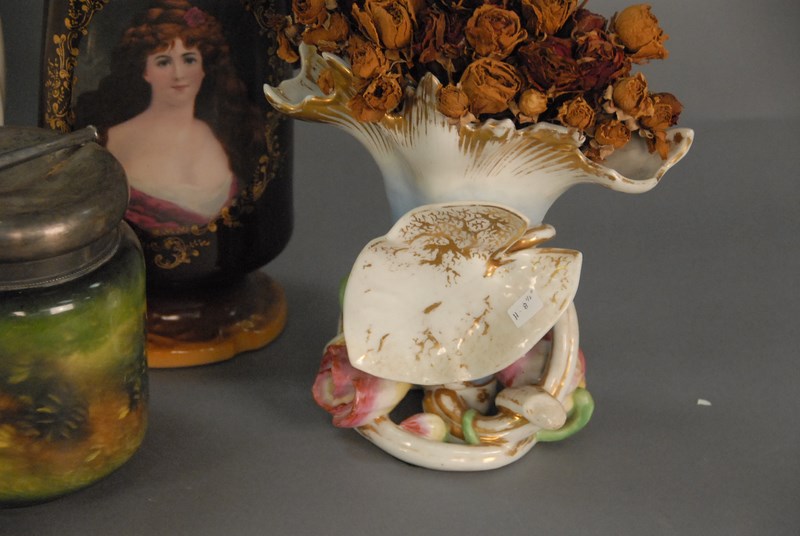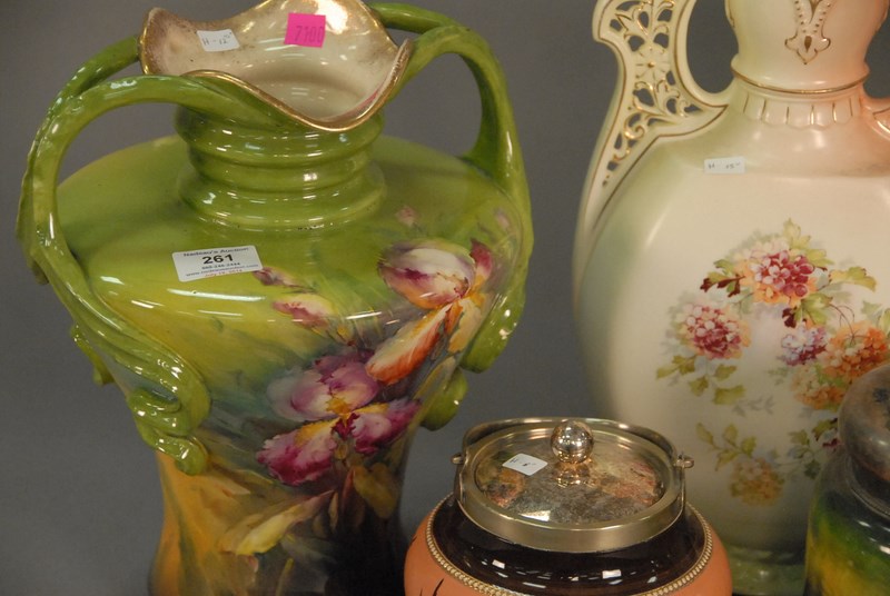 Lot 261: Five pieces to include a large Royal Bonn vase with two handles, large pitcher with painted bust of a girl, a vase, and two tobacco …