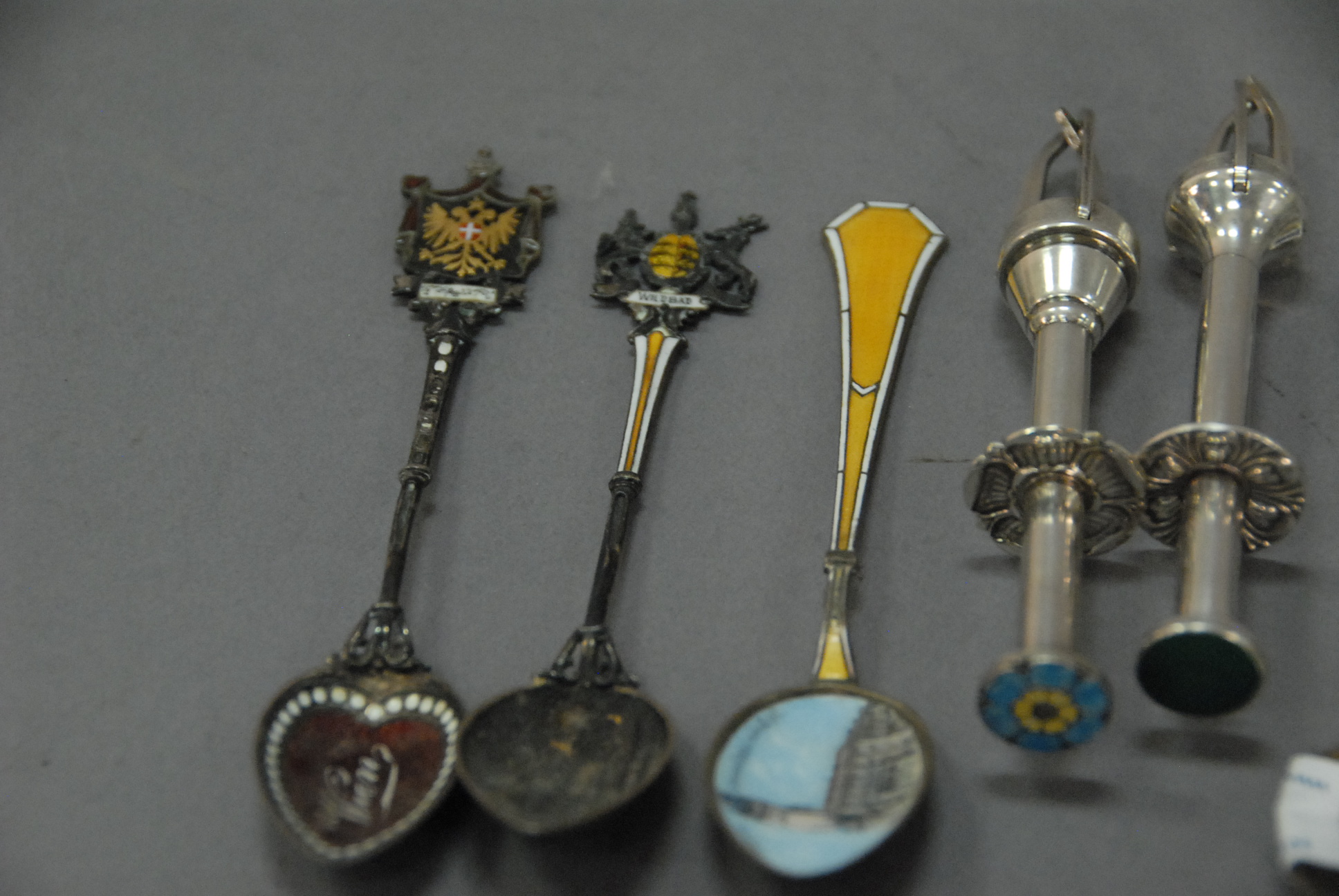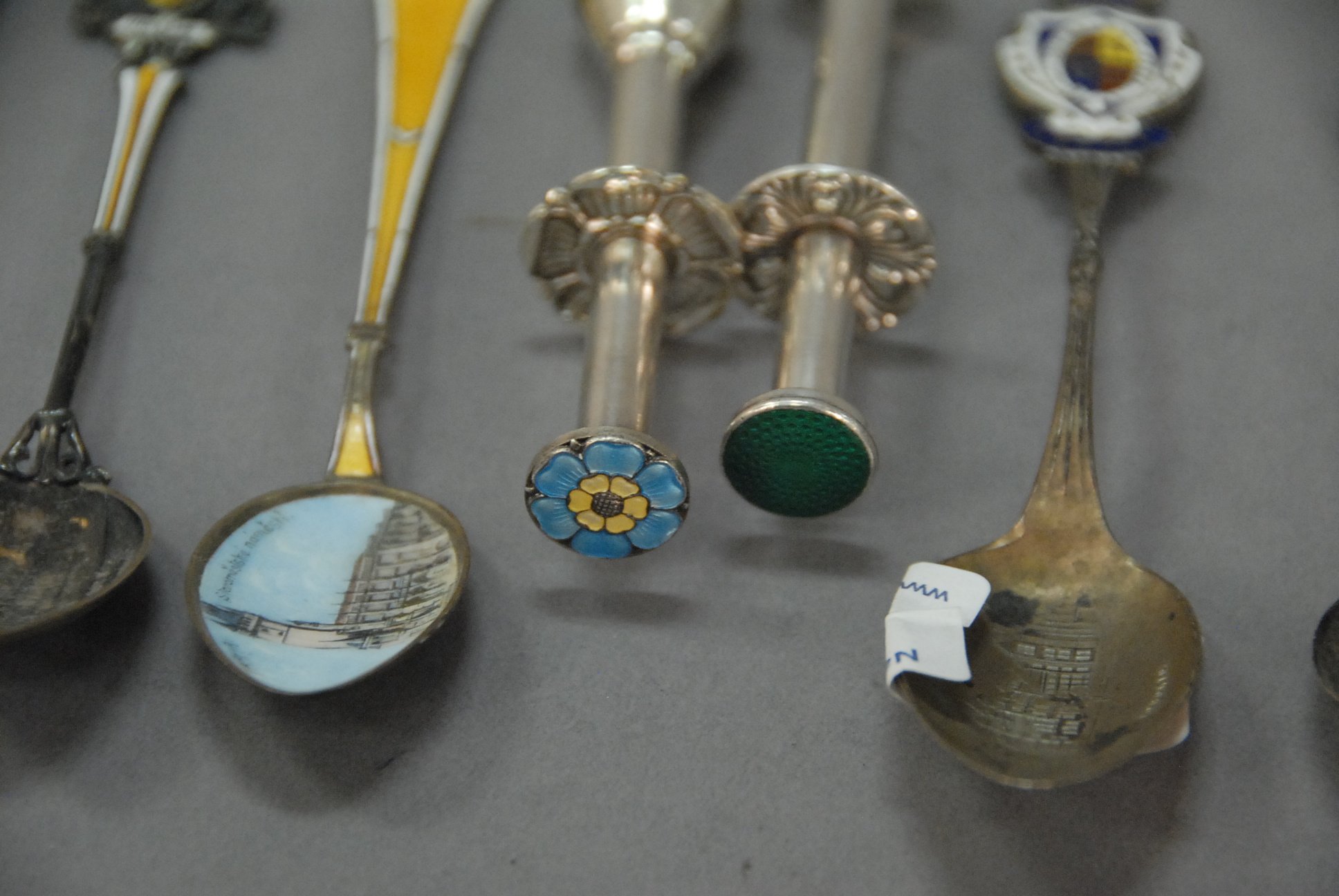 Lot 261: Group of sterling enameled souvenir spoons along with two olive servers, 4.6 t oz.