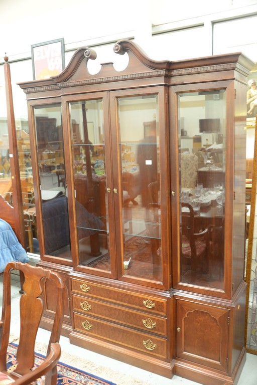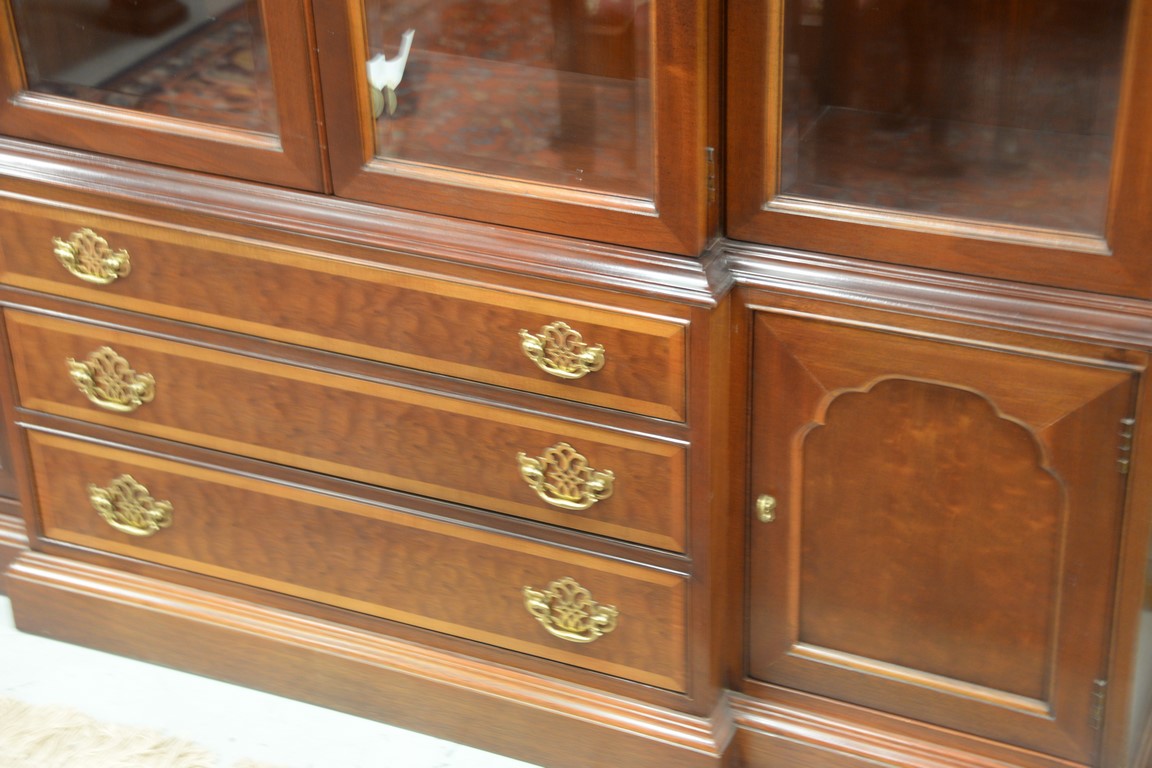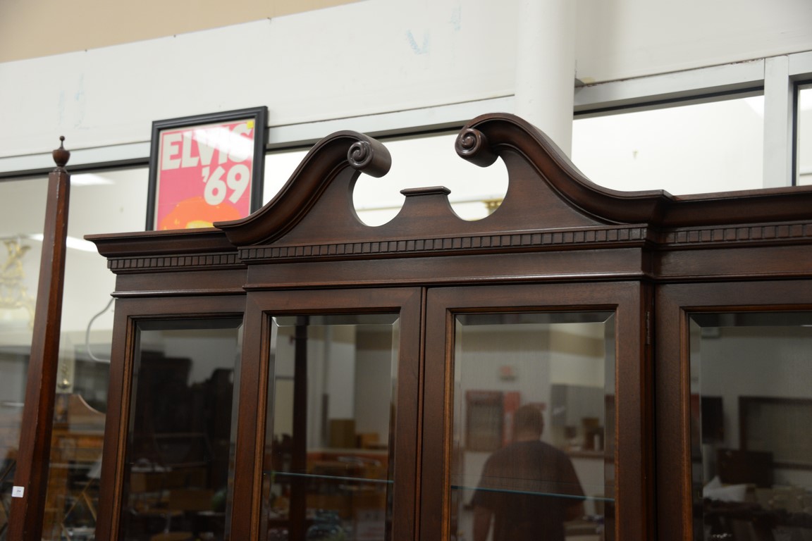 Hickory mahogany breakfront with bevel glass doors and glass shelves. ht. 86 in. wd. 64 in. dp. 15 in.