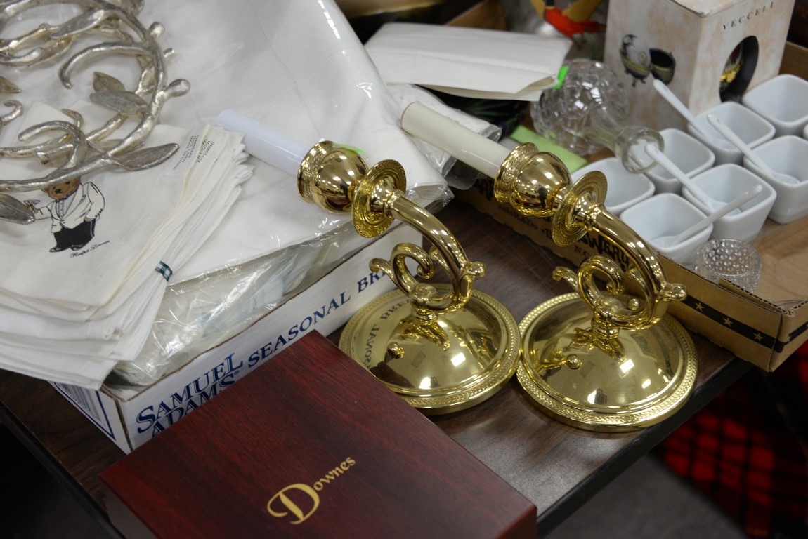 Large group of miscellaneous items to include a dartboard, decorative shelves, linens, wine travel holder, Historic Charleston brass candle sticks, etc.