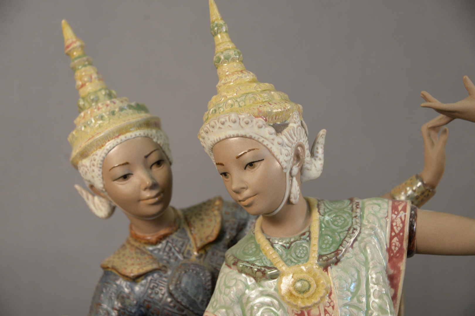 Lot 261: Lladro Porcelain Figural Group, “Thai Couple”, model 2058, marked to the underside, height 20 1/2 inches. Provenance: Estate of James Wadhams
