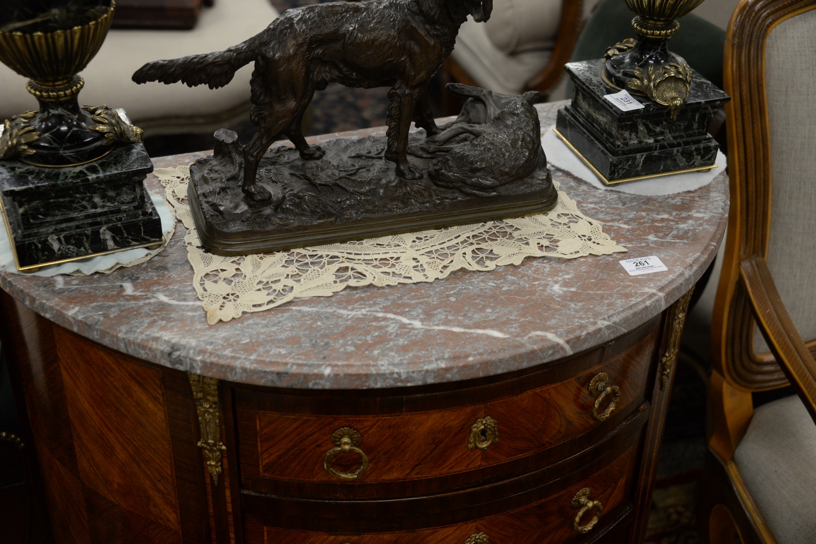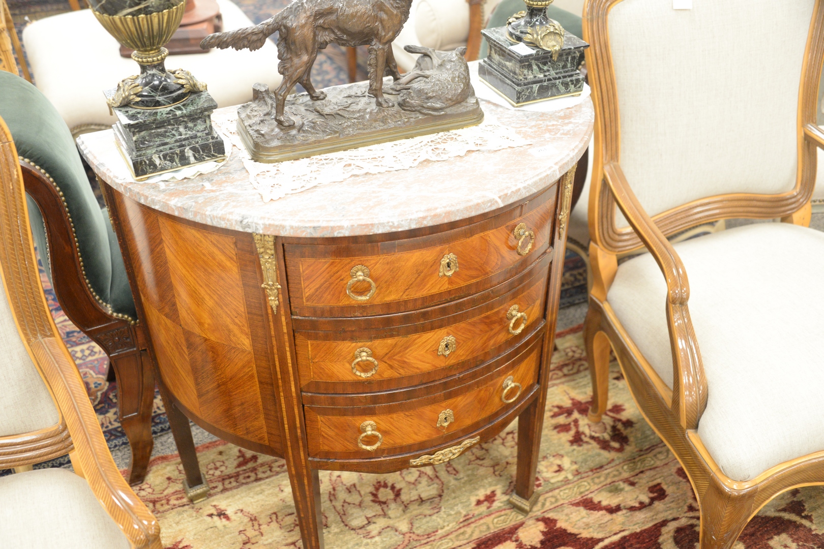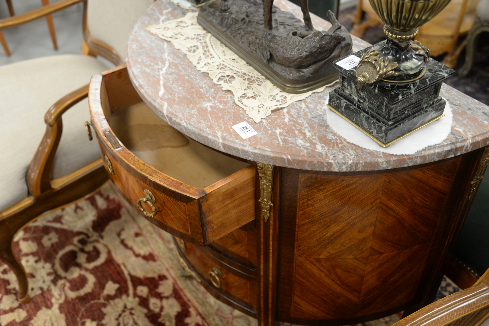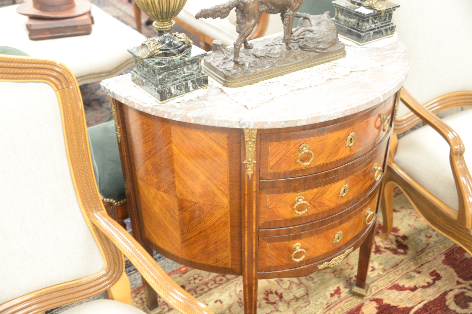 Lot 261: Louis XVI Style Demilune Commode, having marble top and bronze mounts, height 33 inches, width 32 inches, depth 17 inches.