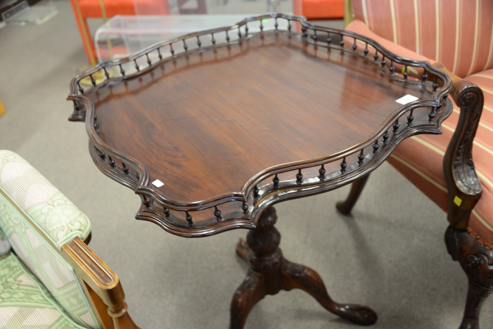 Lot 261: Mahogany gallery top tip table, late 20th century gallery loose on one side. ht. 31in., top: 32 x 32