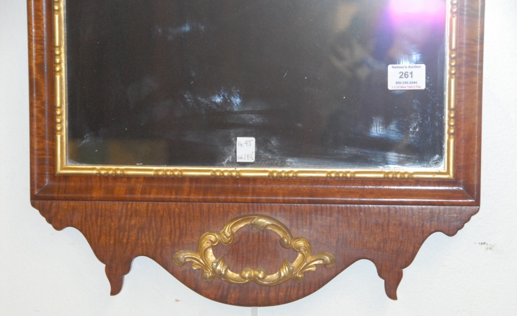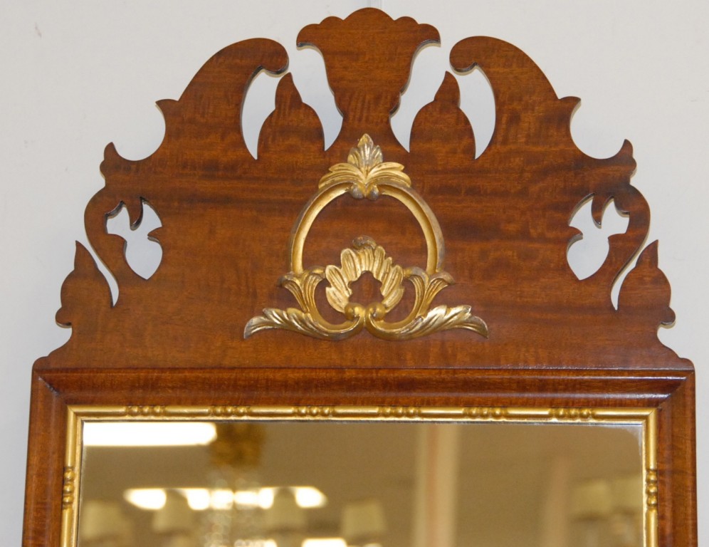 Margolis Queen Anne mirror of fiddle back mahogany. height 43in. width 18 1/2in.