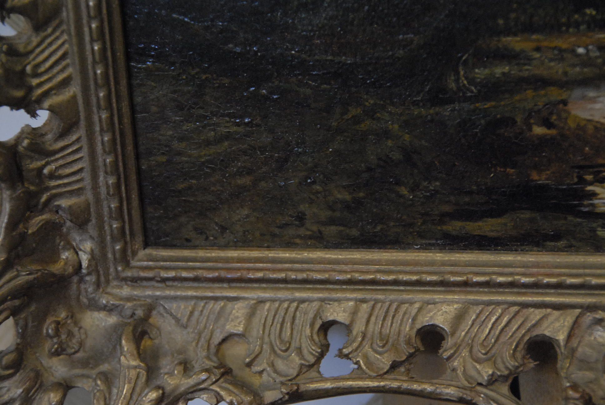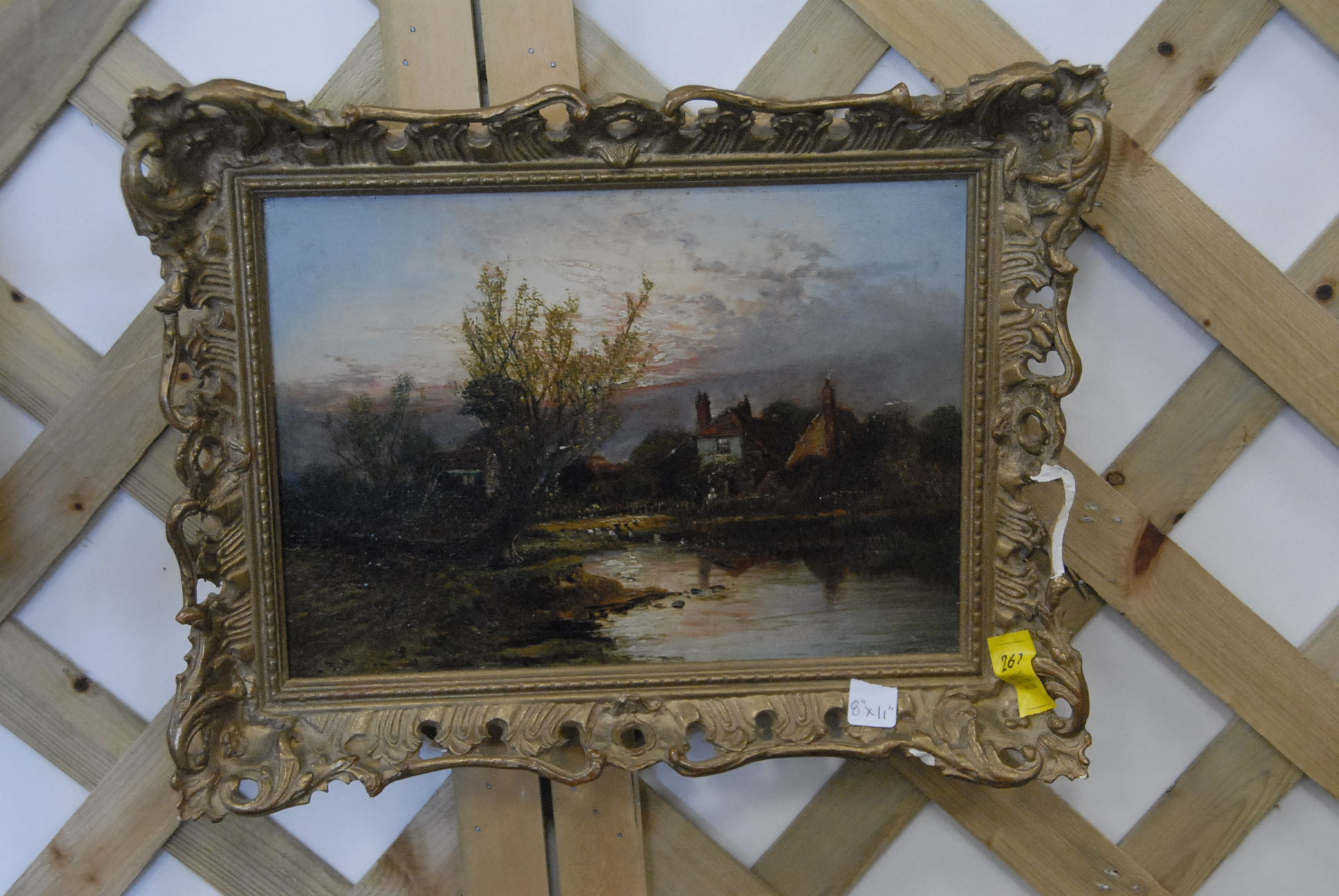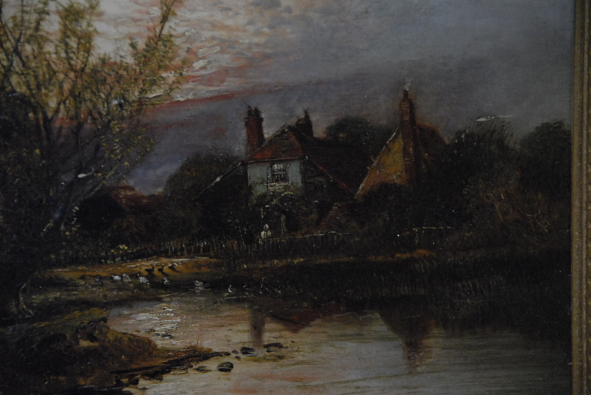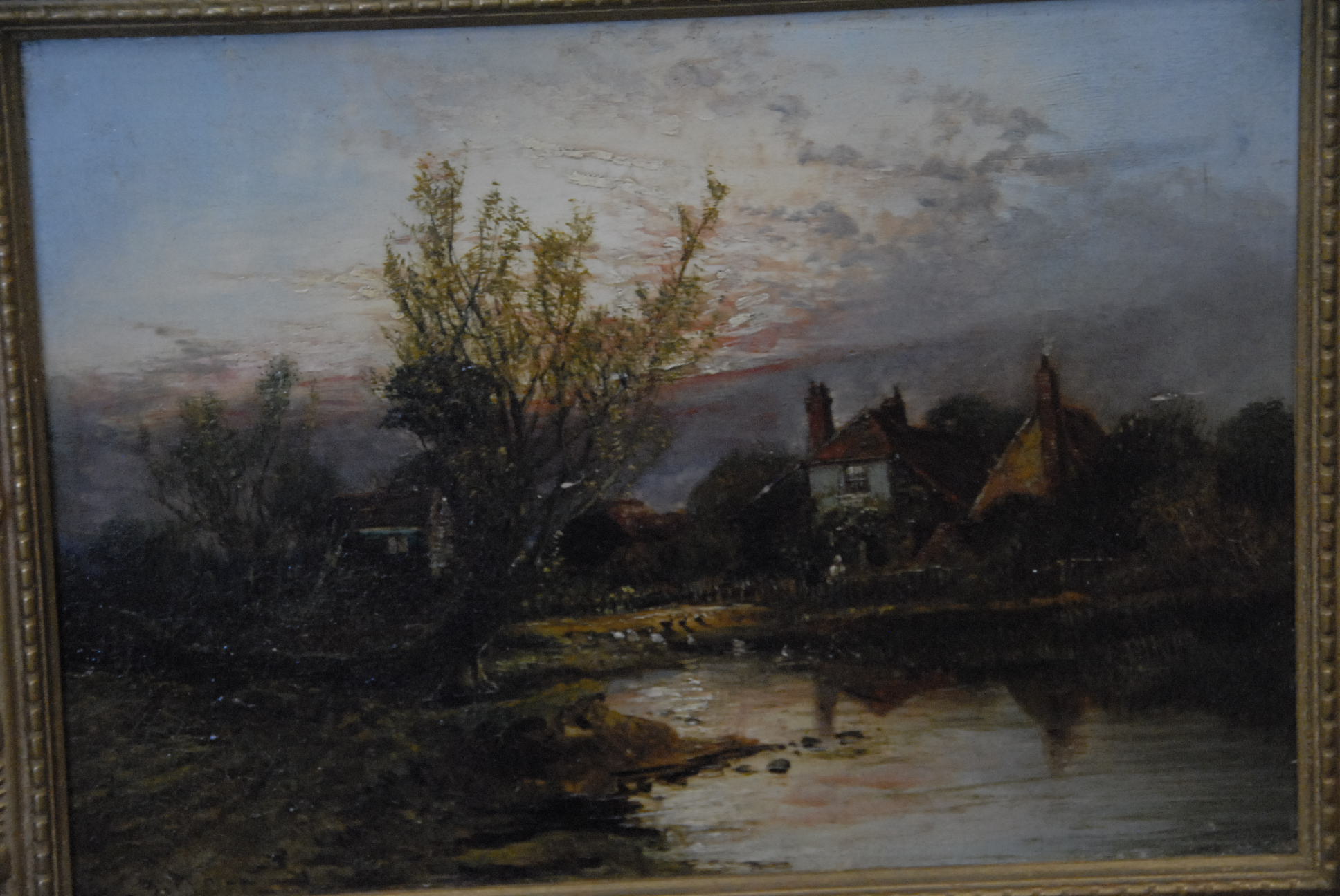 Oil on panel attributed to Edward Edbanobrookescene of houses, farmyard and a pond.