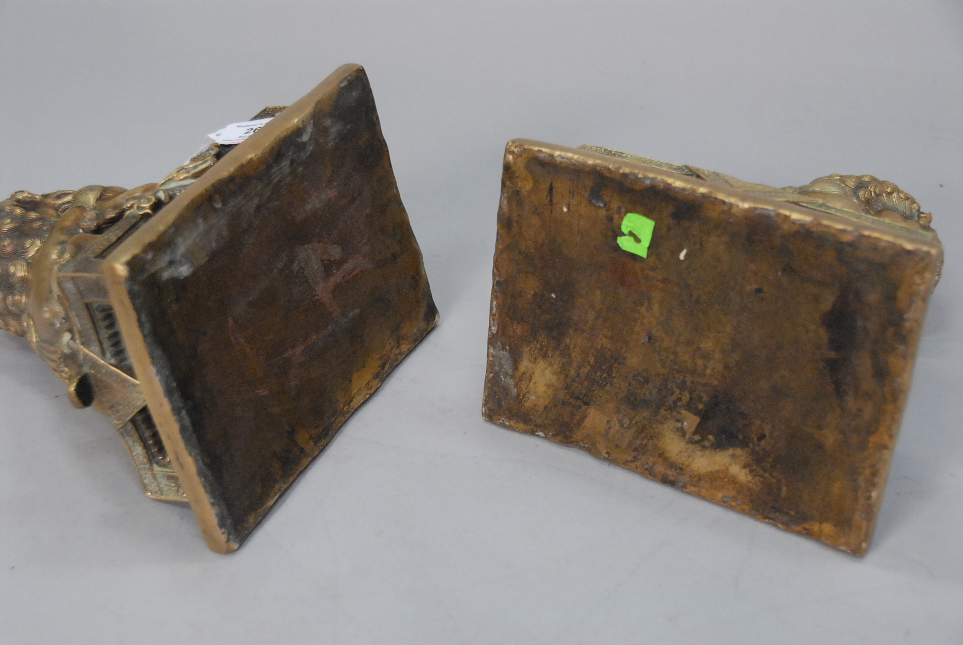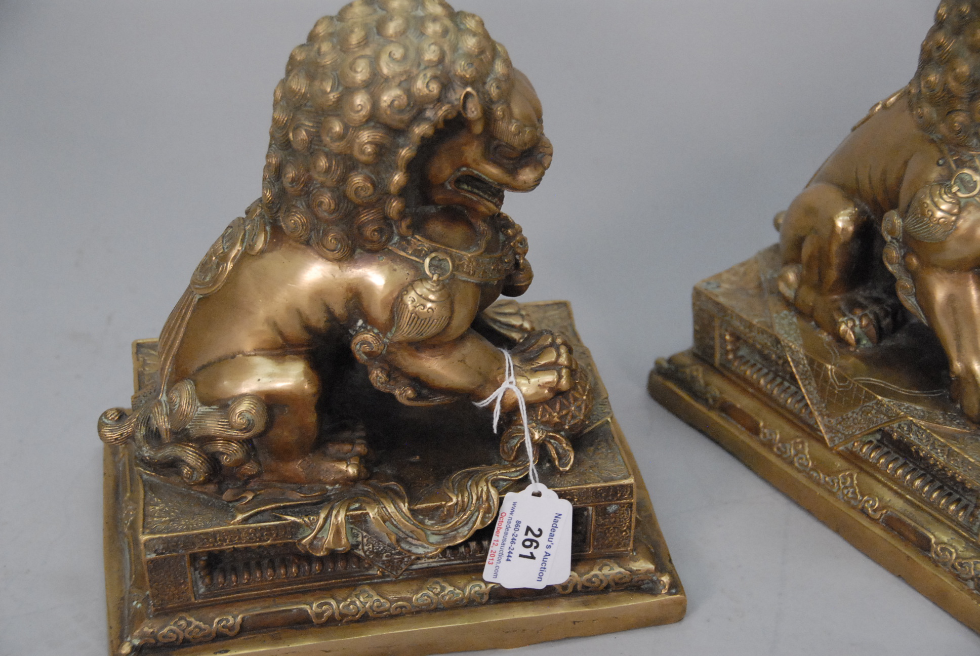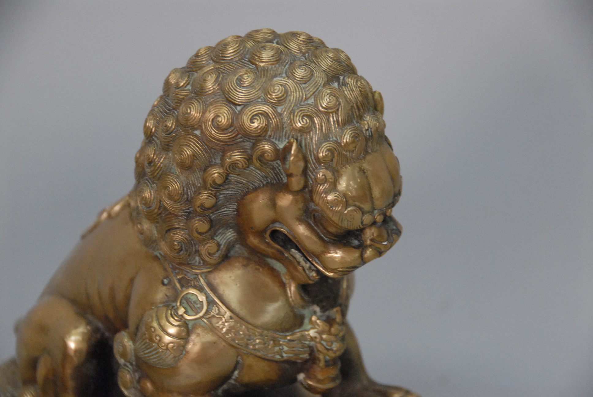 Pair of brass Chinese foo dogs on rectangular bases ht. 9 3/4in., lg. 9in.