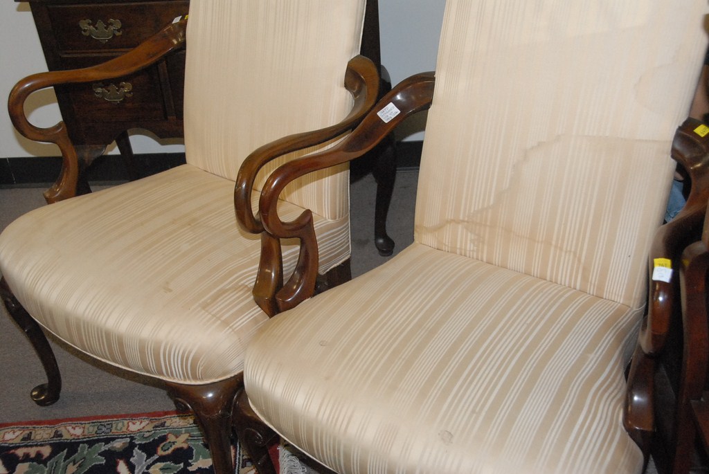 Pair of signed Southwood Queen Anne style upholstered armchairs.