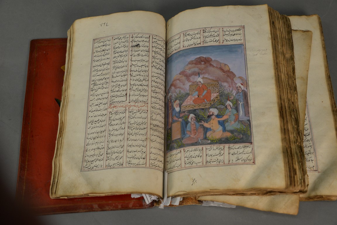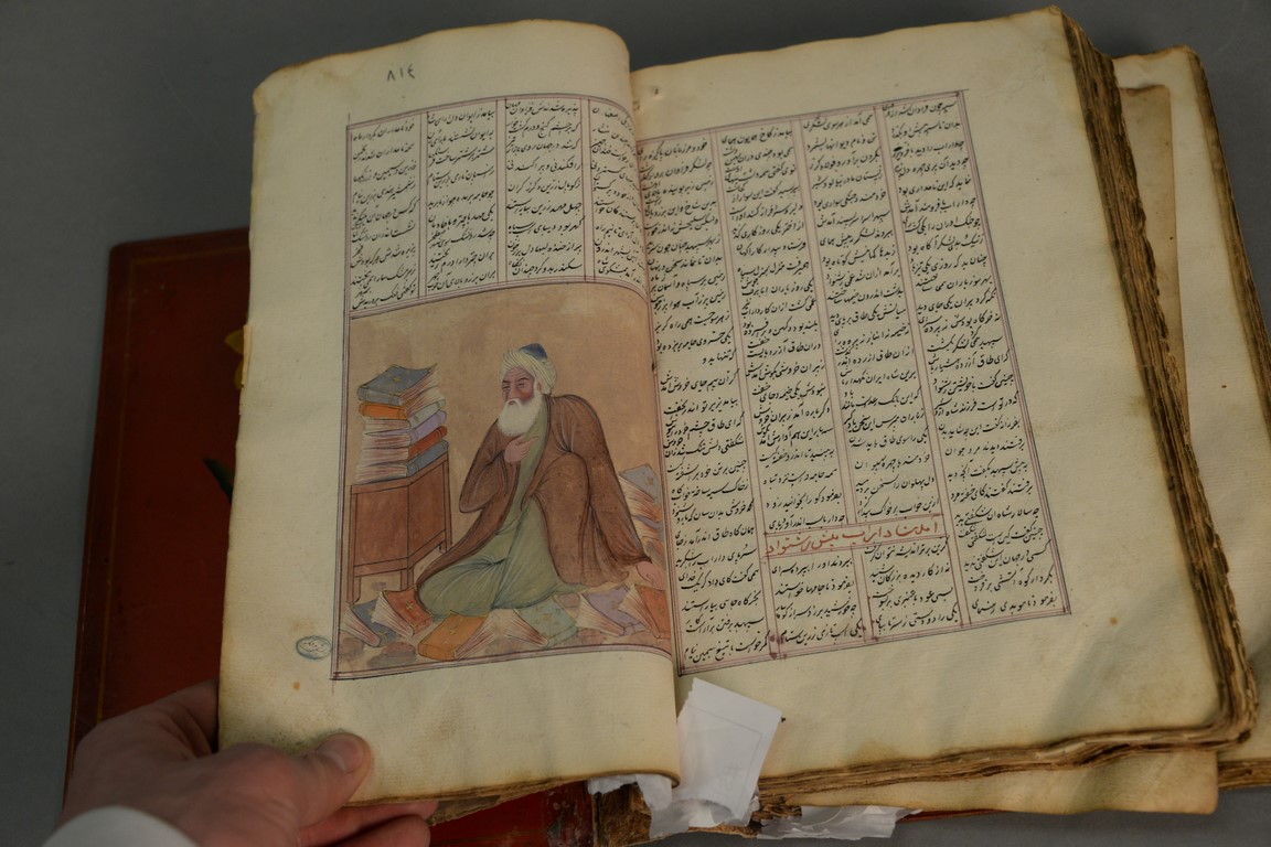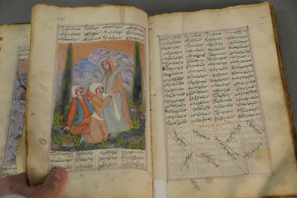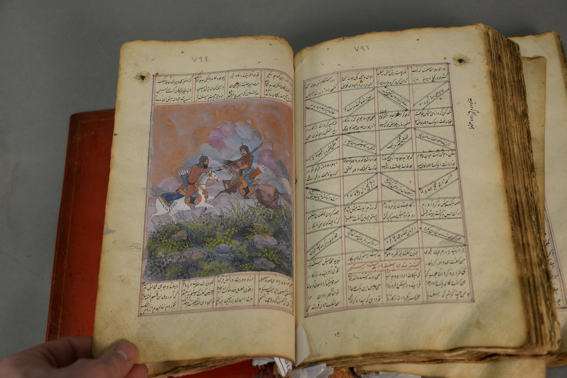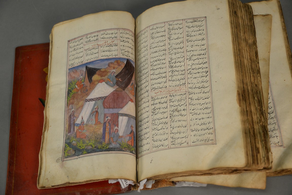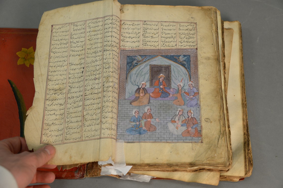 Lot 261: Persian poem book with twenty-four hand painted pages 2 7/8 inch thick, probably 17th century. height 11 1/2 inches, width 8 inches