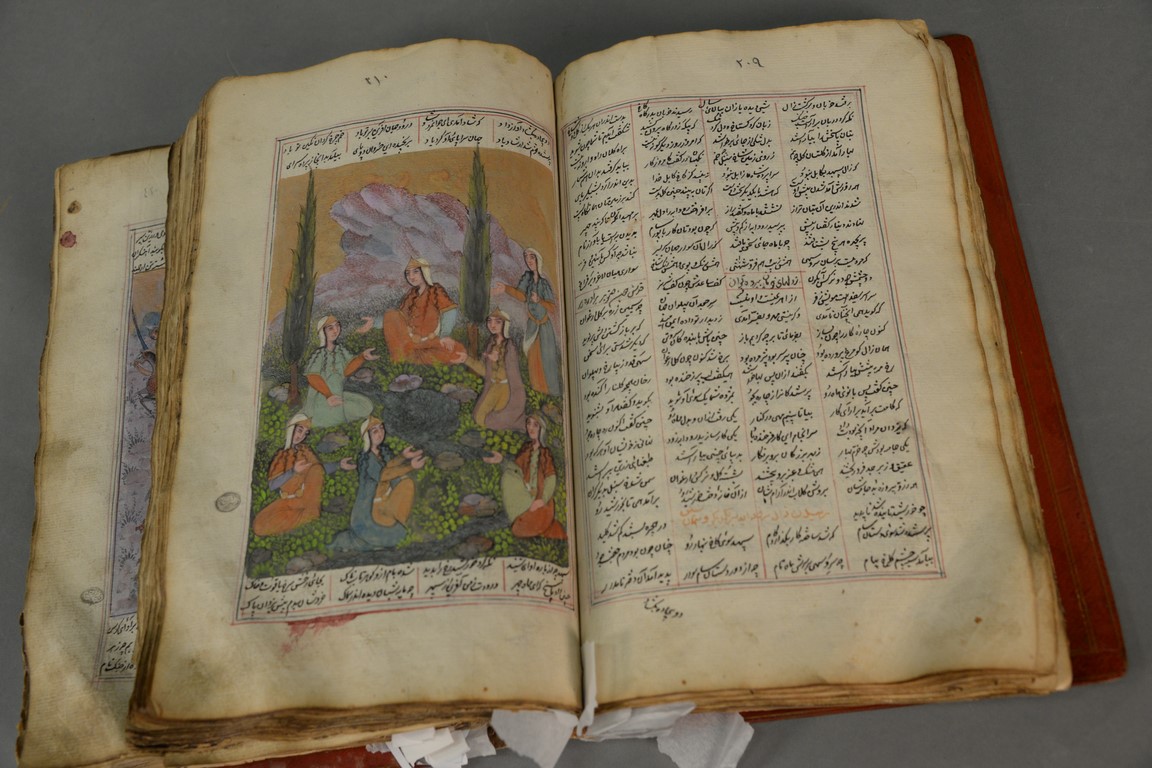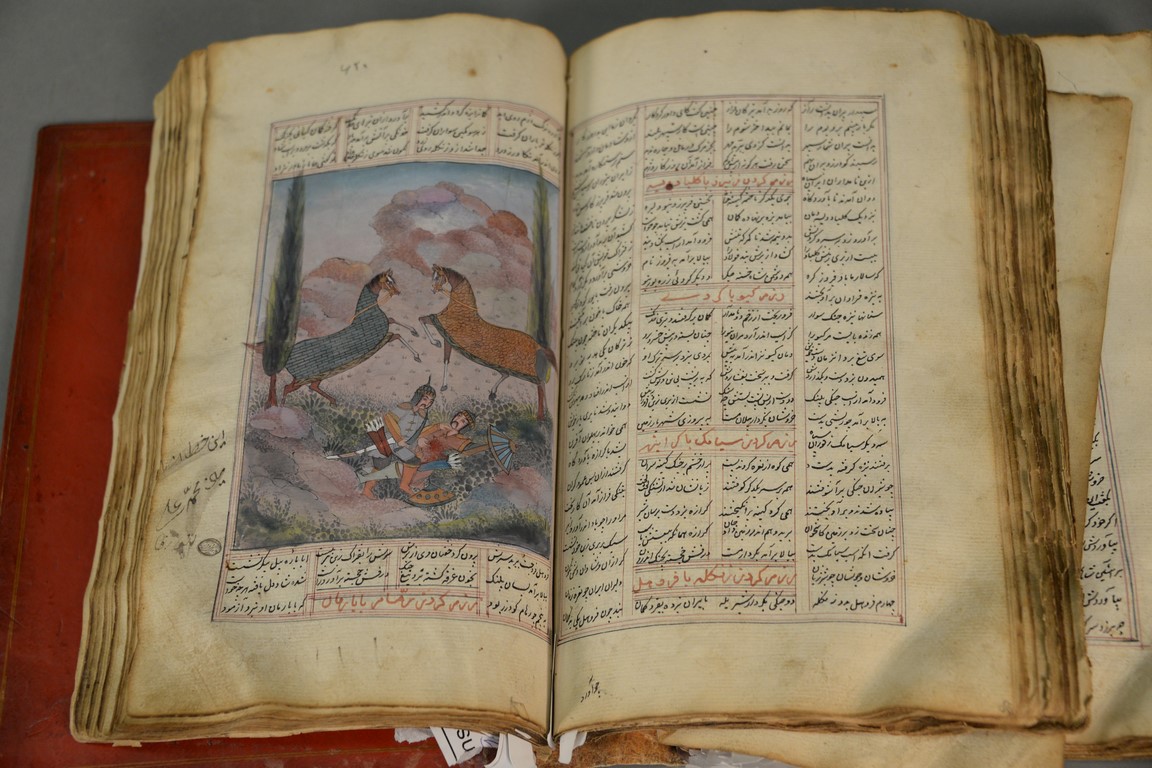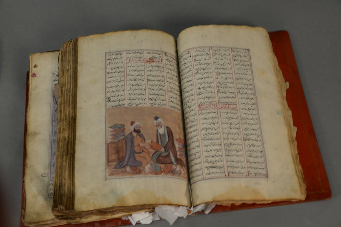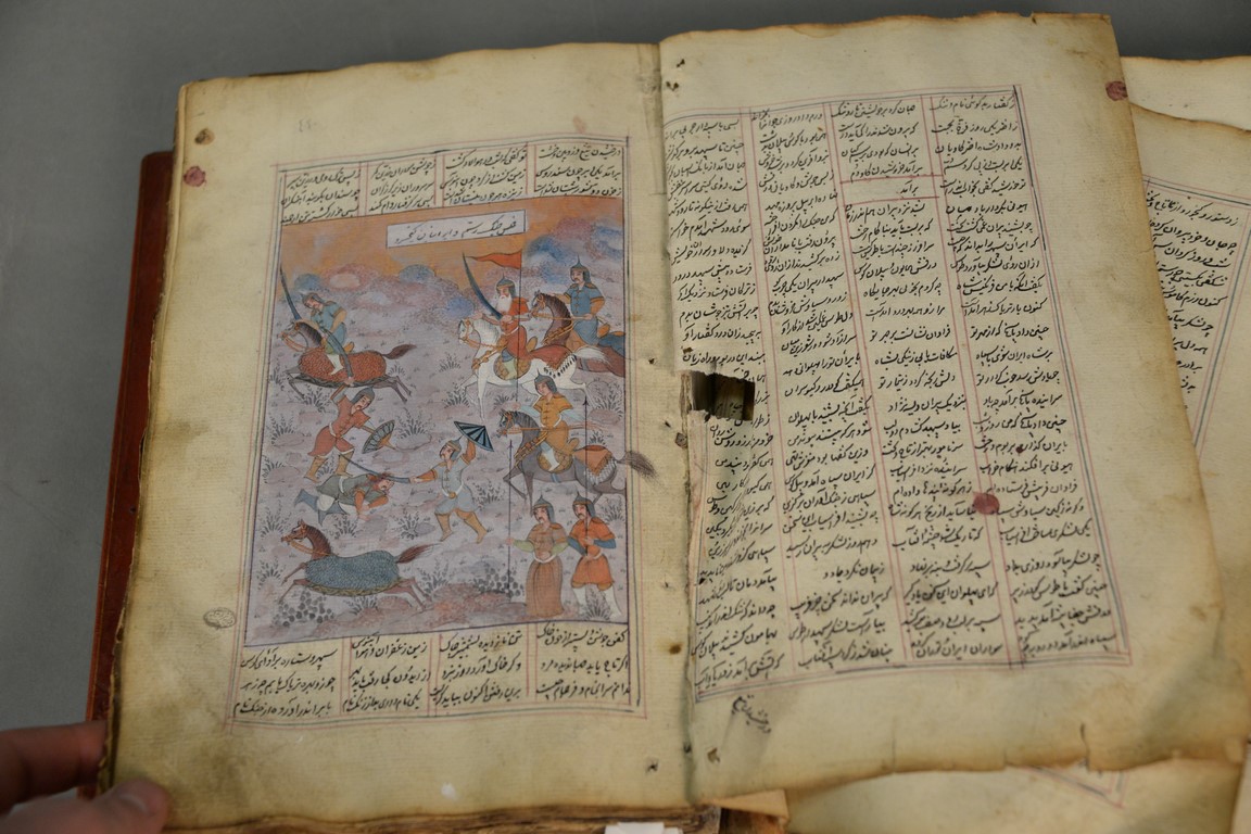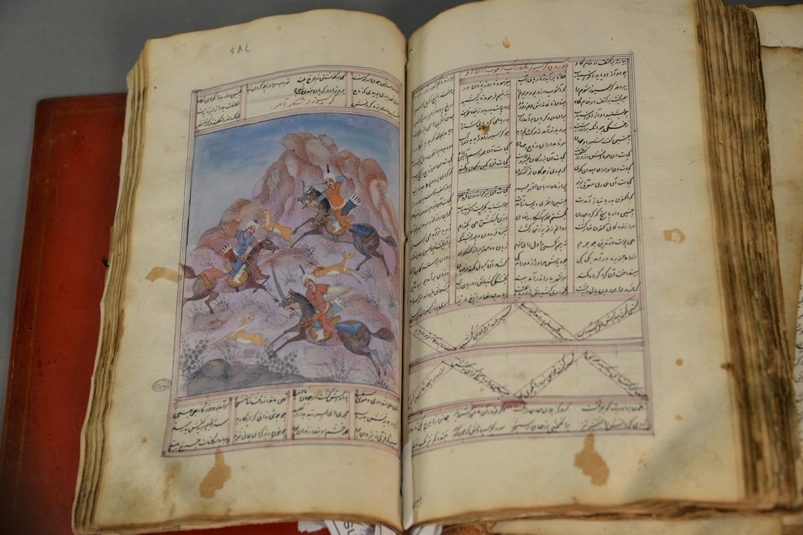 Lot 261: Persian poem book with twenty-four hand painted pages 2 7/8 inch thick, probably 17th century. height 11 1/2 inches, width 8 inches
