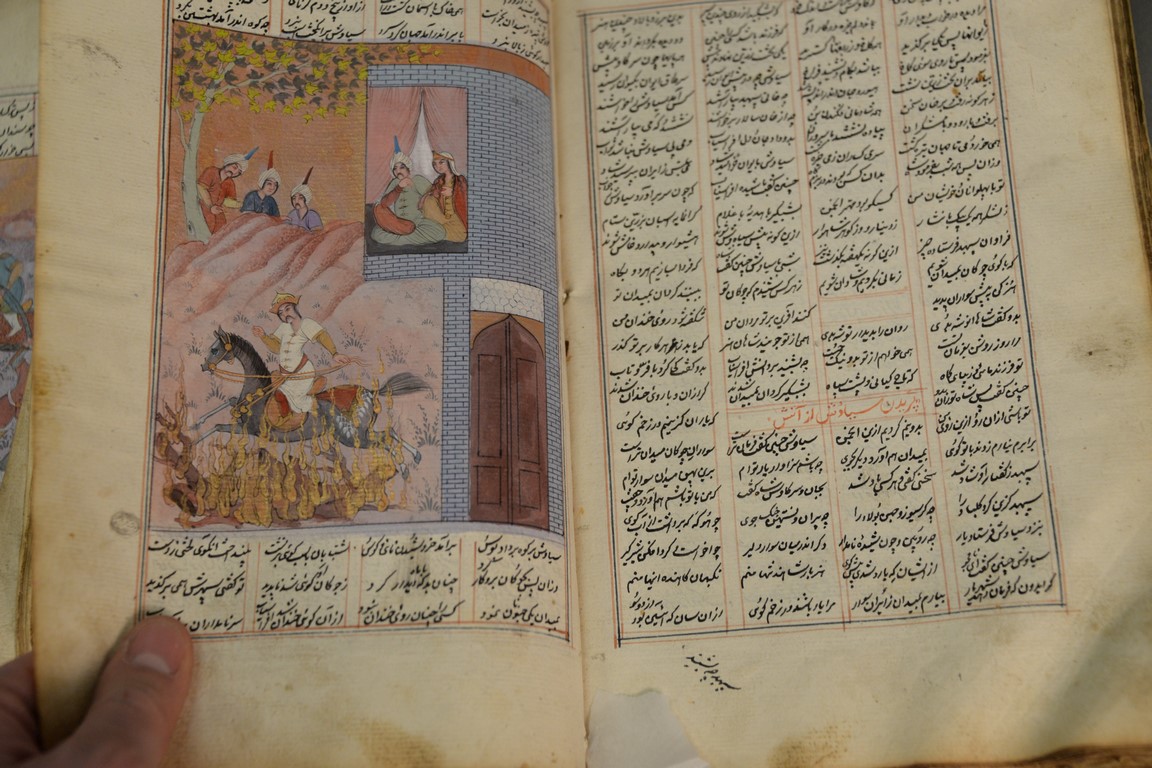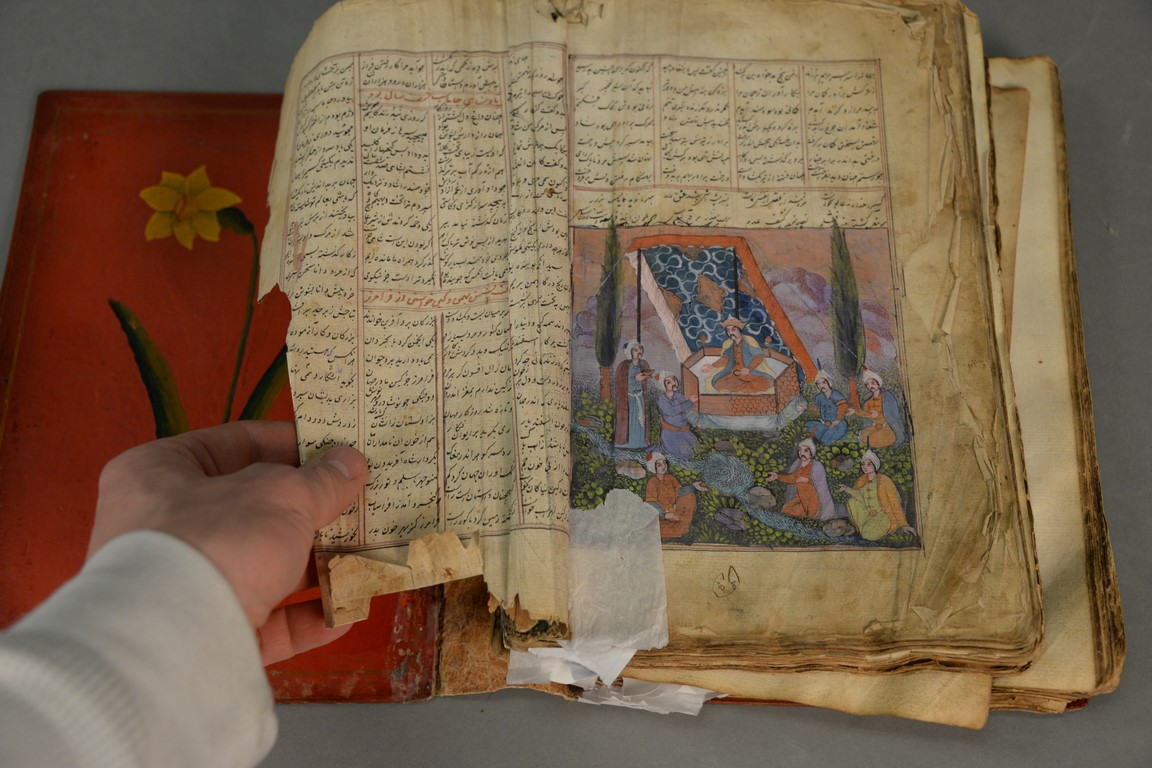 Persian poem book with twenty-four hand painted pages 2 7/8 inch thick, probably 17th century.