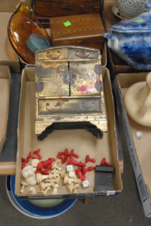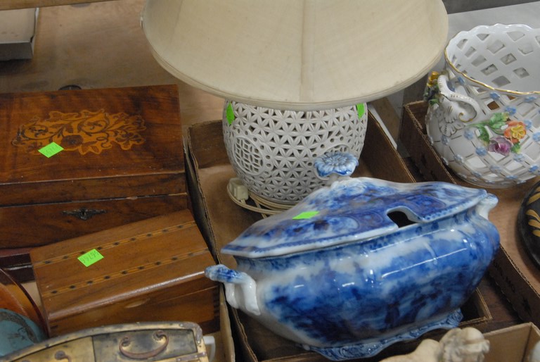 Lot 261: Seven tray lots: flow blue covered tureen, reticulated lamp as is, small wooden boxes, ivory partial chess set, templates, pottery…