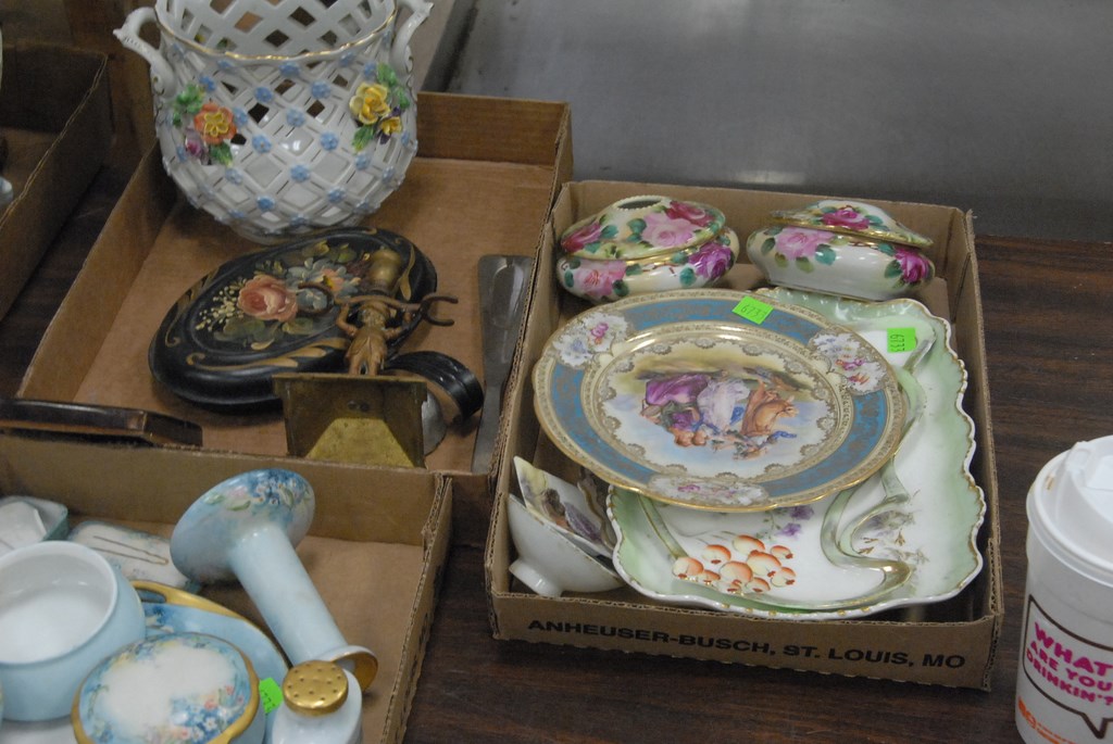 Seven tray lots: flow blue covered tureen, reticulated lamp as is, small wooden boxes, ivory partial chess set, templates, pottery, vase, and four pottery vases, Lladro figure, hand painted dresser set, three dresser trays, jars, Dresden reticulated planter, and plate.
