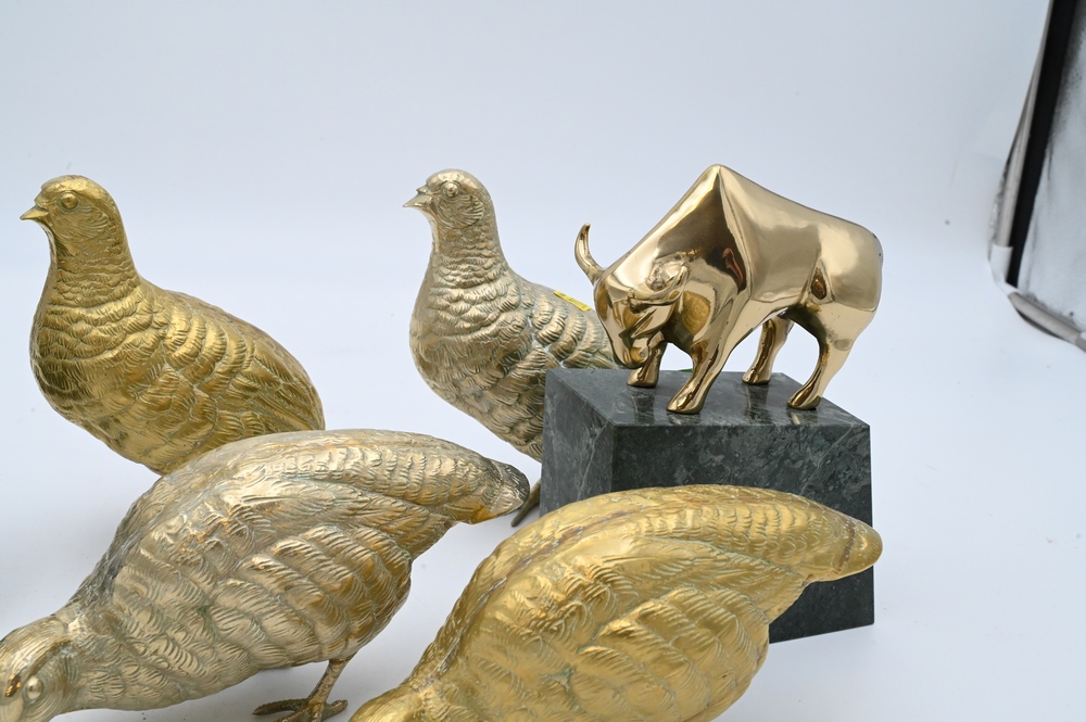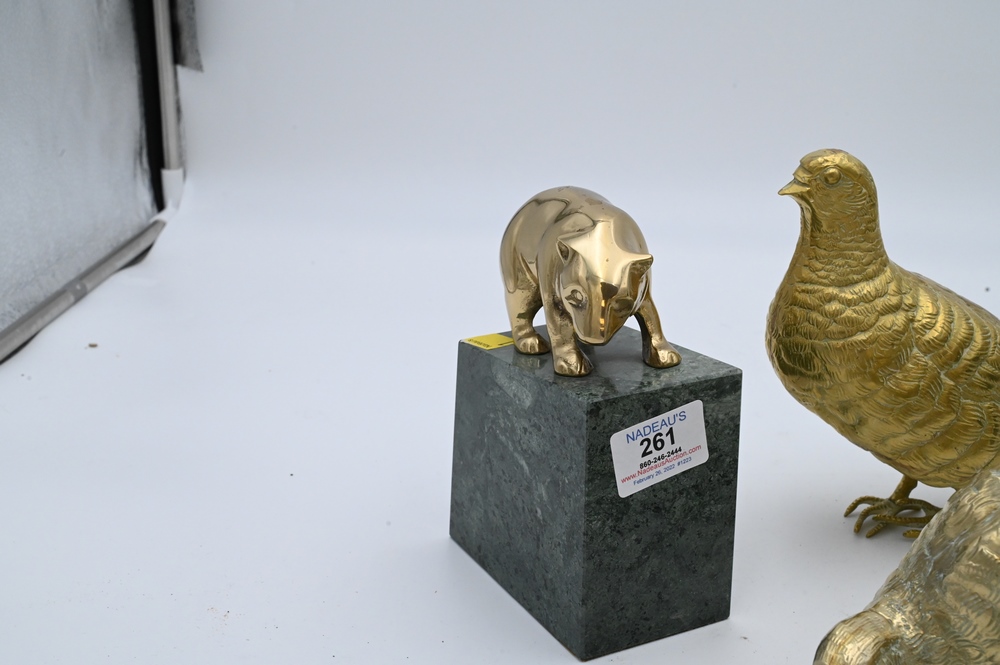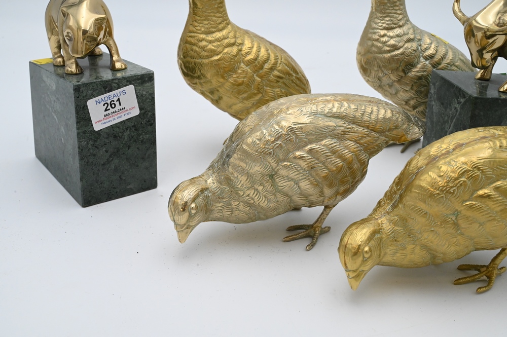 Lot 261: Six Piece Group of Brass Figures, to include four brass quail and a pair of bookends with granite bases and brass animals.