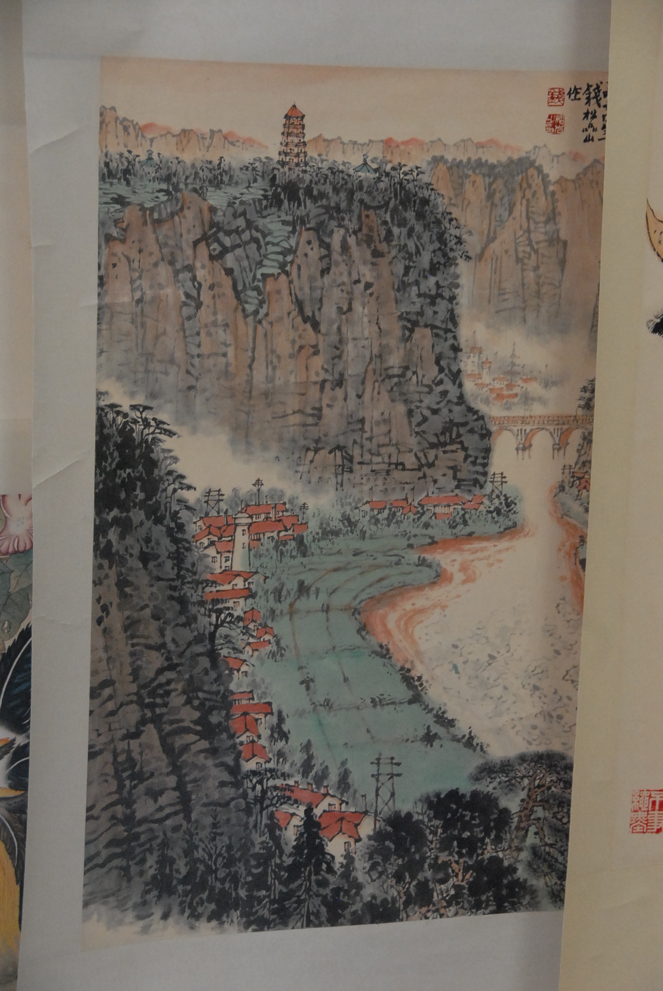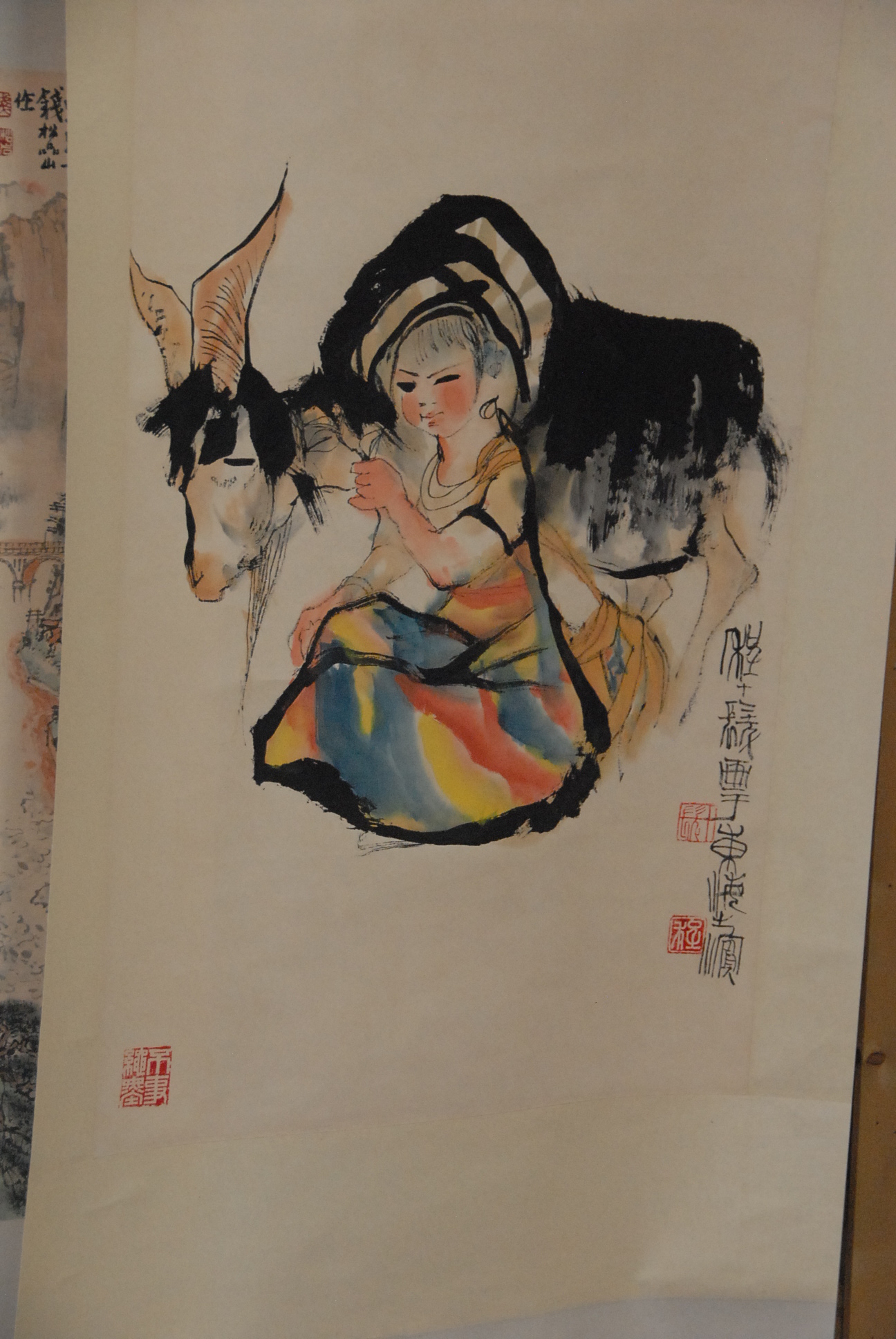 Three Oriental scrolls, watercolor rooster on paper 20 x 25, watercolor landscape of canyon 26 x 17, watercolor girl with goat 27 x 18.