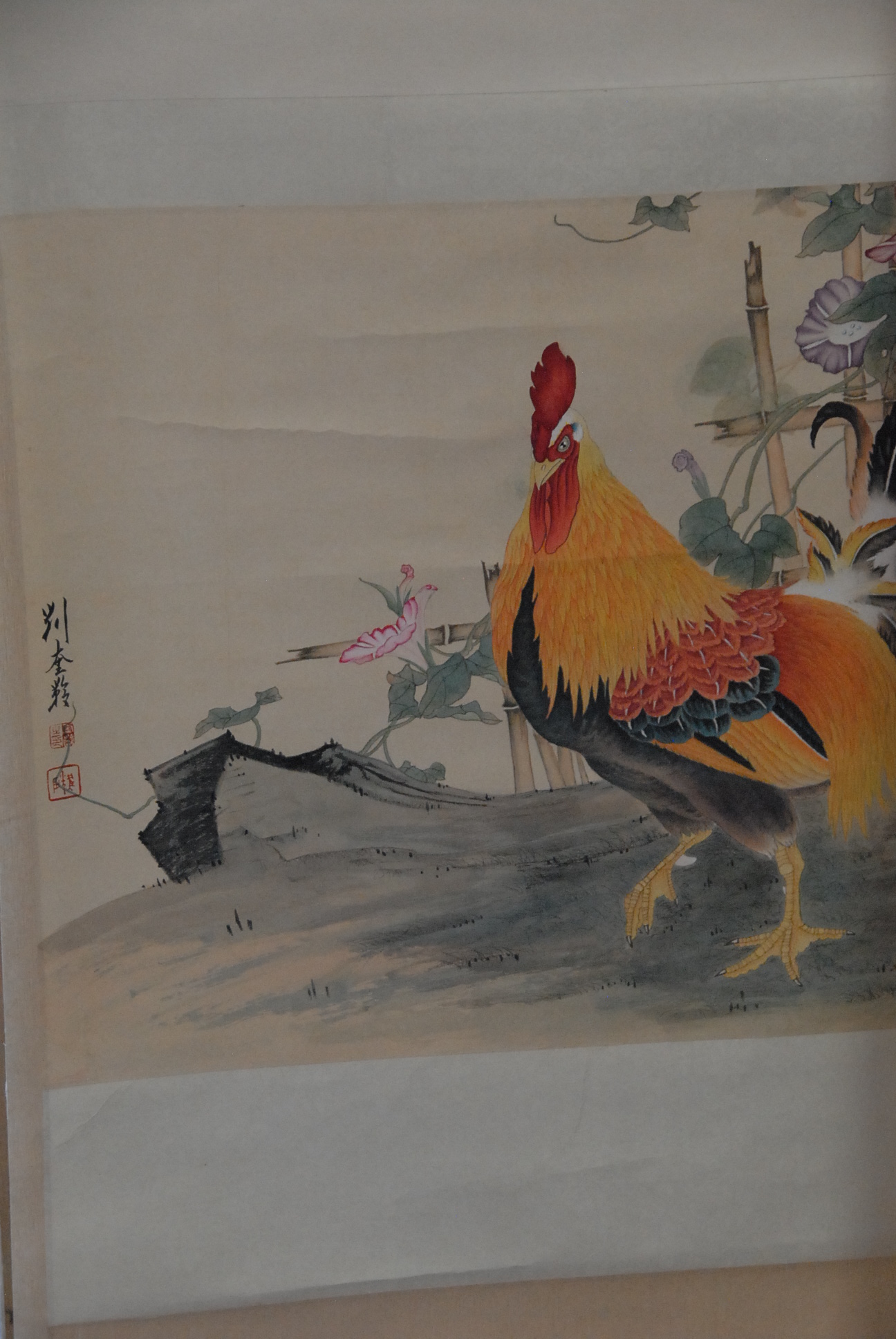 Lot 261: Three Oriental scrolls, watercolor rooster on paper 20 x 25, watercolor landscape of canyon 26 x 17, watercolor girl with goat 2…