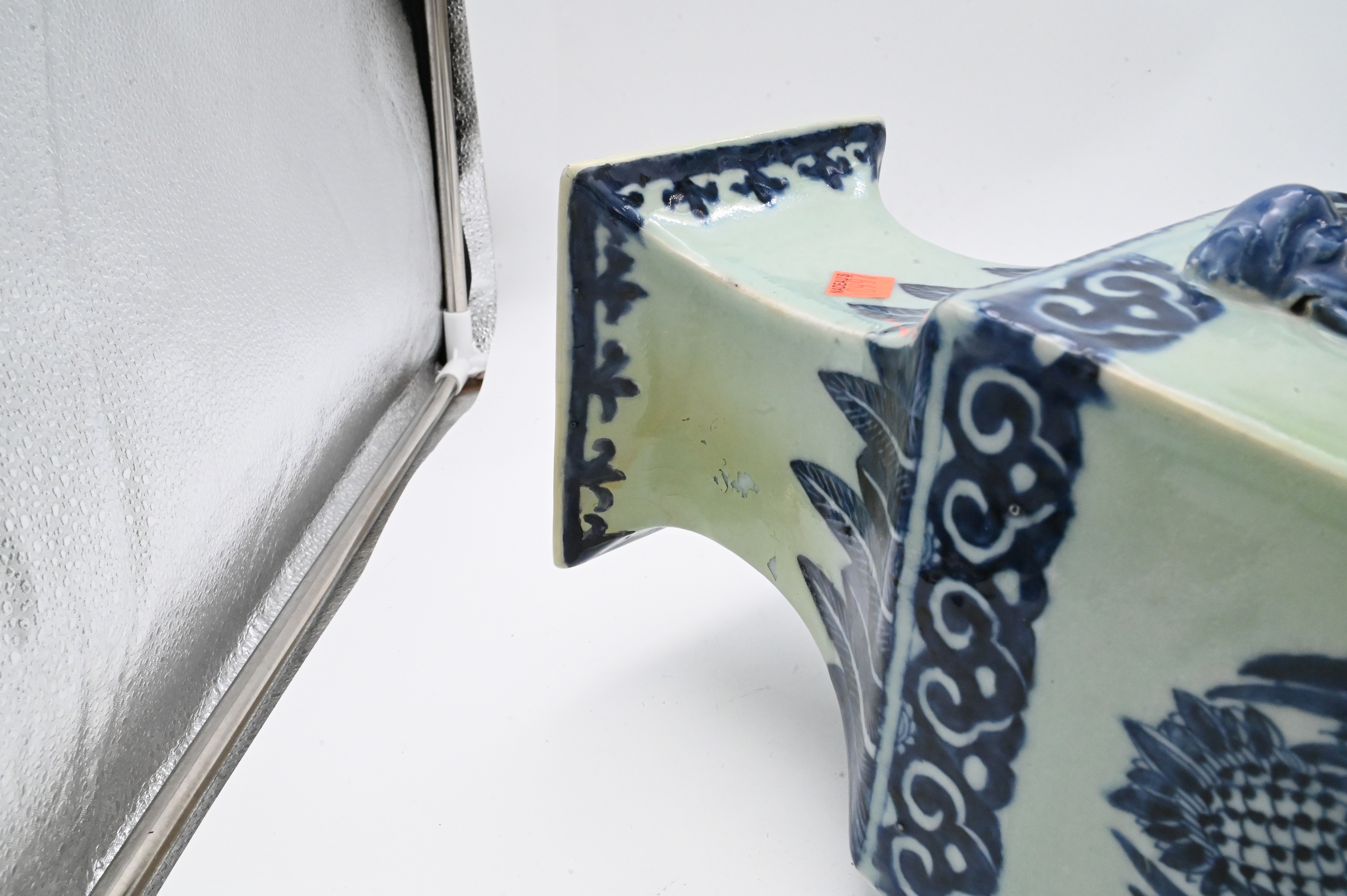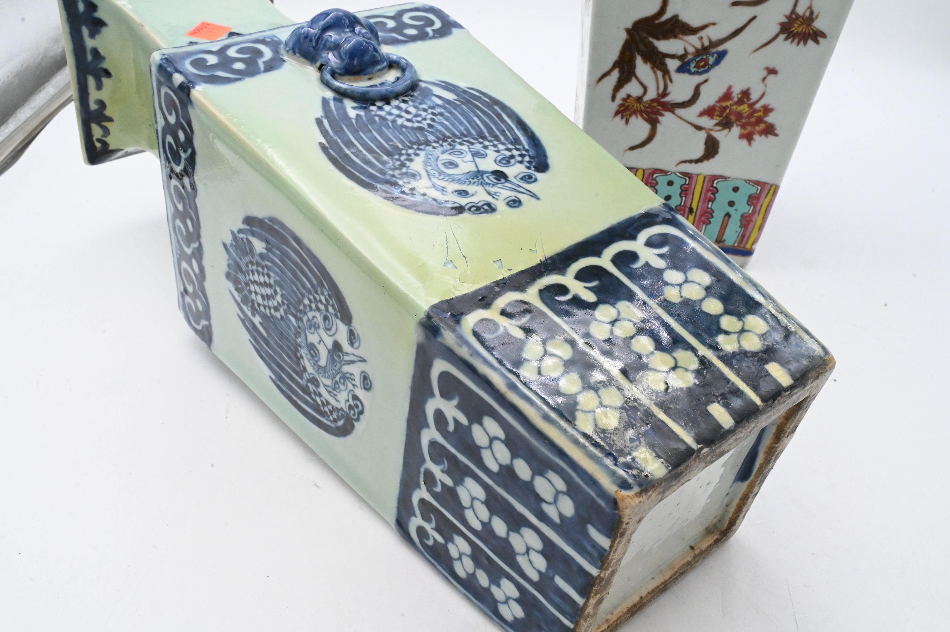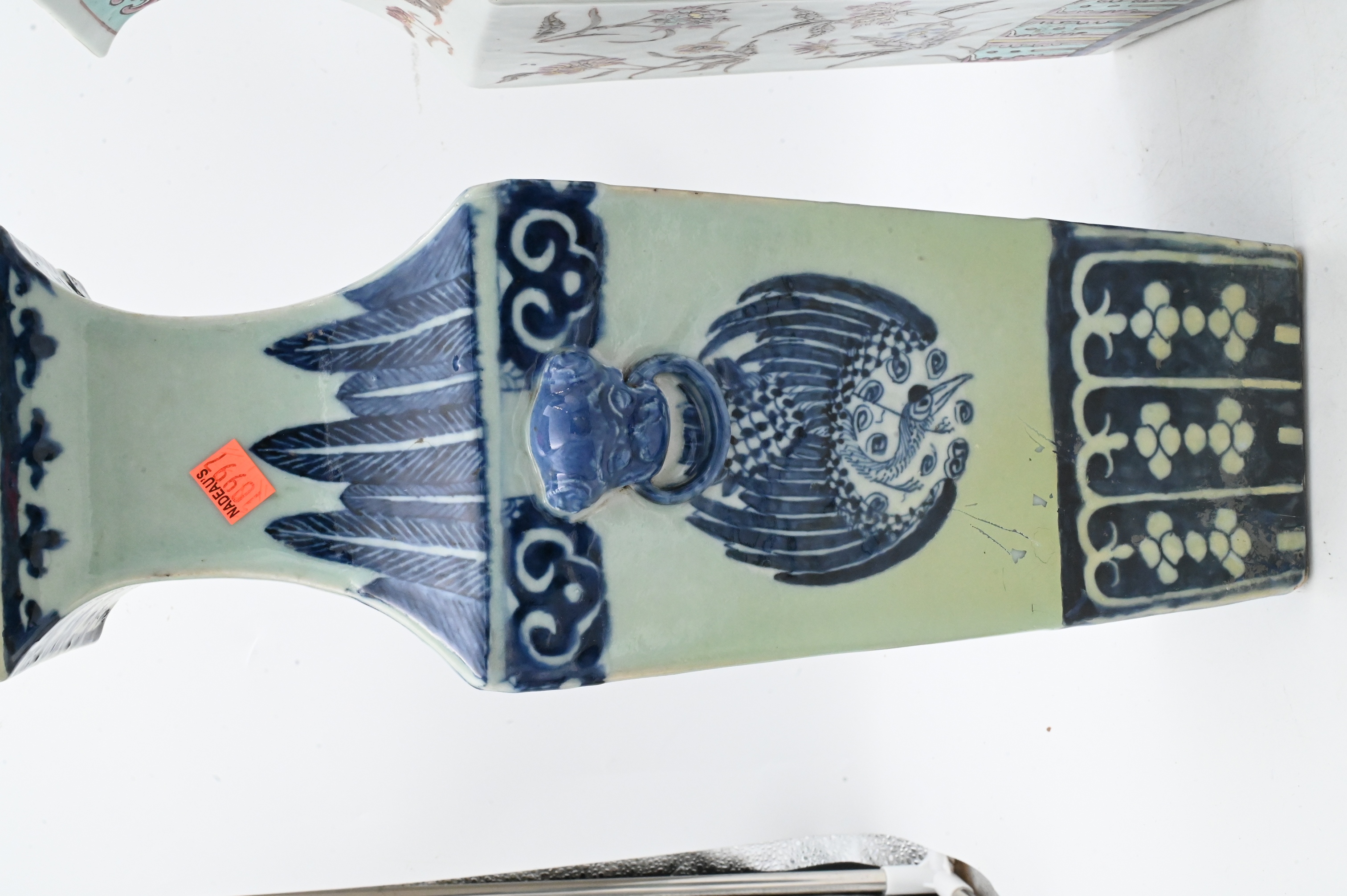 to include blue and white vase having phoenix motif along with famille rose flower and scrolling vines vase, both having flared necks and double foo dog handle knockers