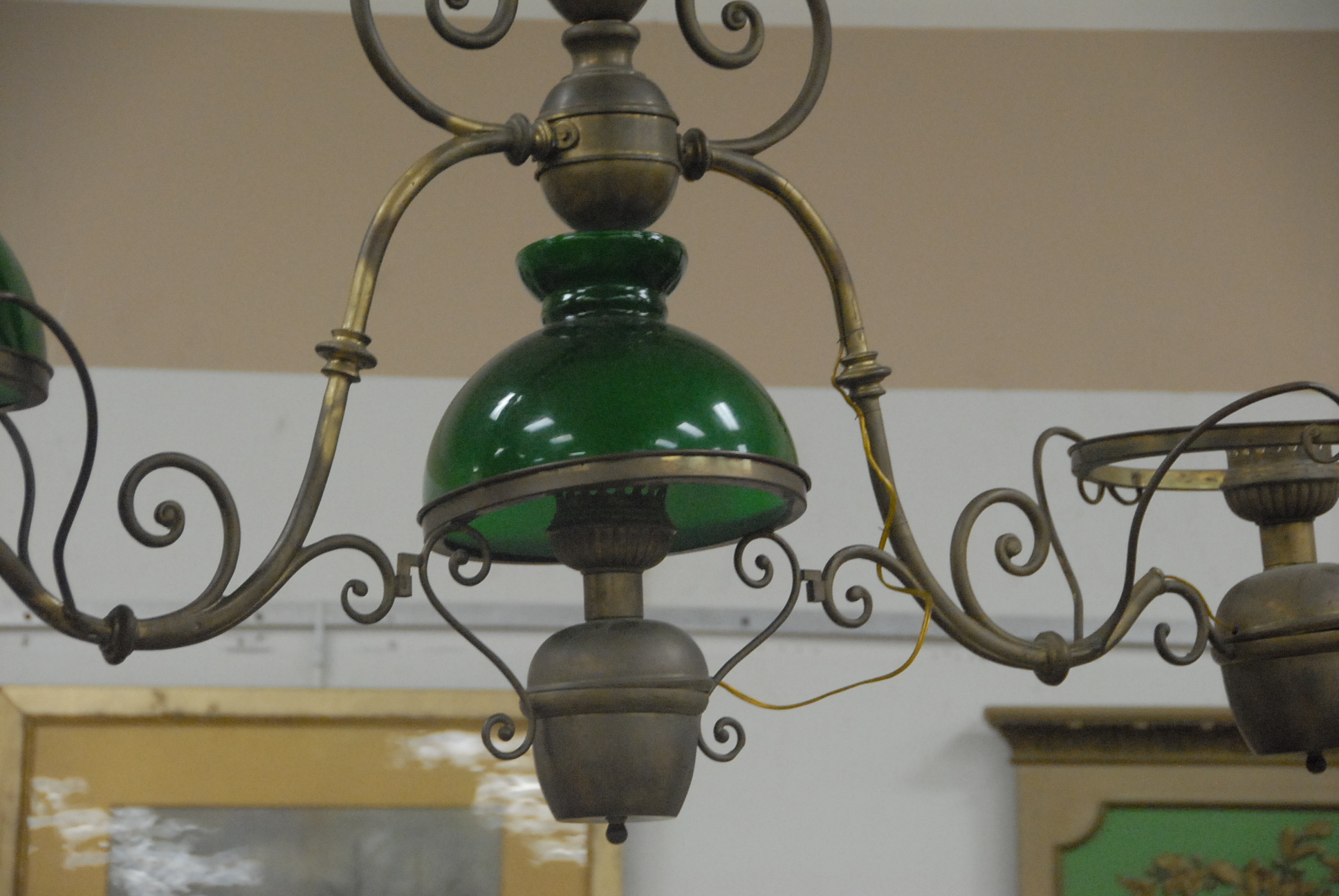 Victorian style brass hanging light, two green case glass shades one shade missing.