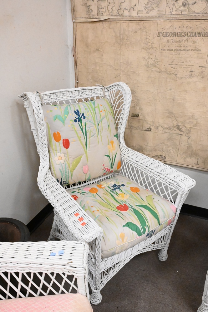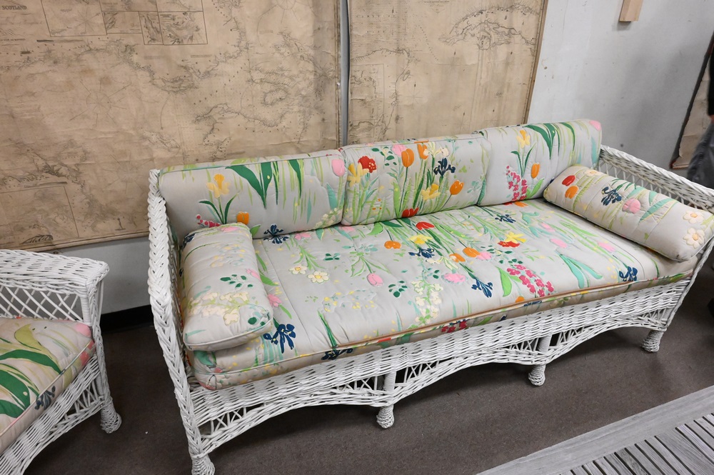 Lot 261: Vintage Two Piece Wicker Lot, to include sofa and winged chair with cushions, (soiled), sofa height 29 inches, sofa length 76 inches. Provenance: An estate from Redding, CT.