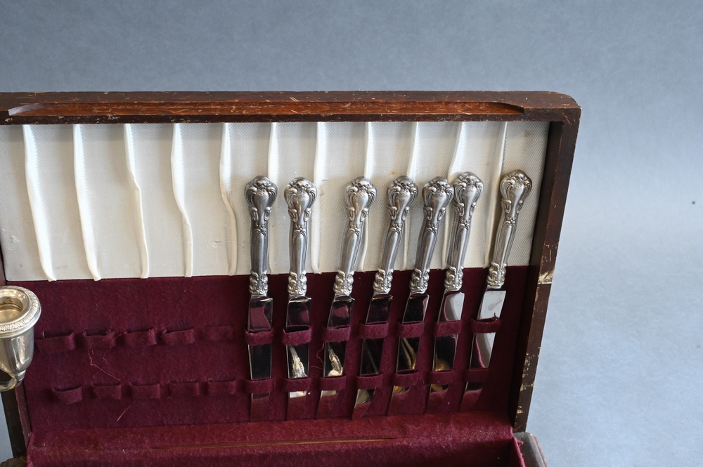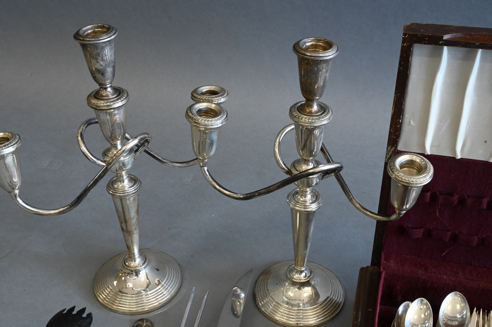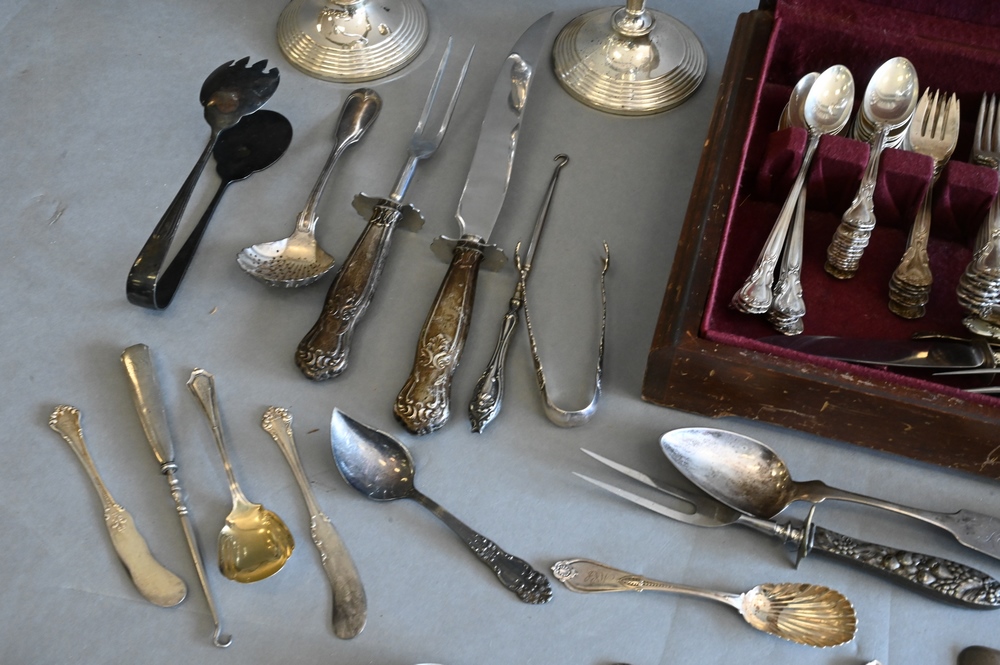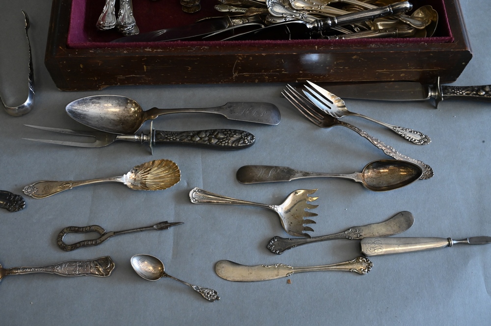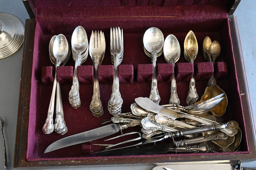 Lot 261A: 95 Piece Sterling Silver Flatware Set, to include 7 knives, 8 dinner forks, 7 salad forks, 13 teaspoons, 9 iced tea spoons, 5 iced tea spoons, 5 ice cream spoons, 7 soup spoons, 6 berry spoons, 12 demitasse spoons, 21 serving pieces; along with a sterling weighted candelabra, weighted sterling service pieces, sivlerplate and miscellaneous flatware, 95.5 t.oz. plus weighted sterling.