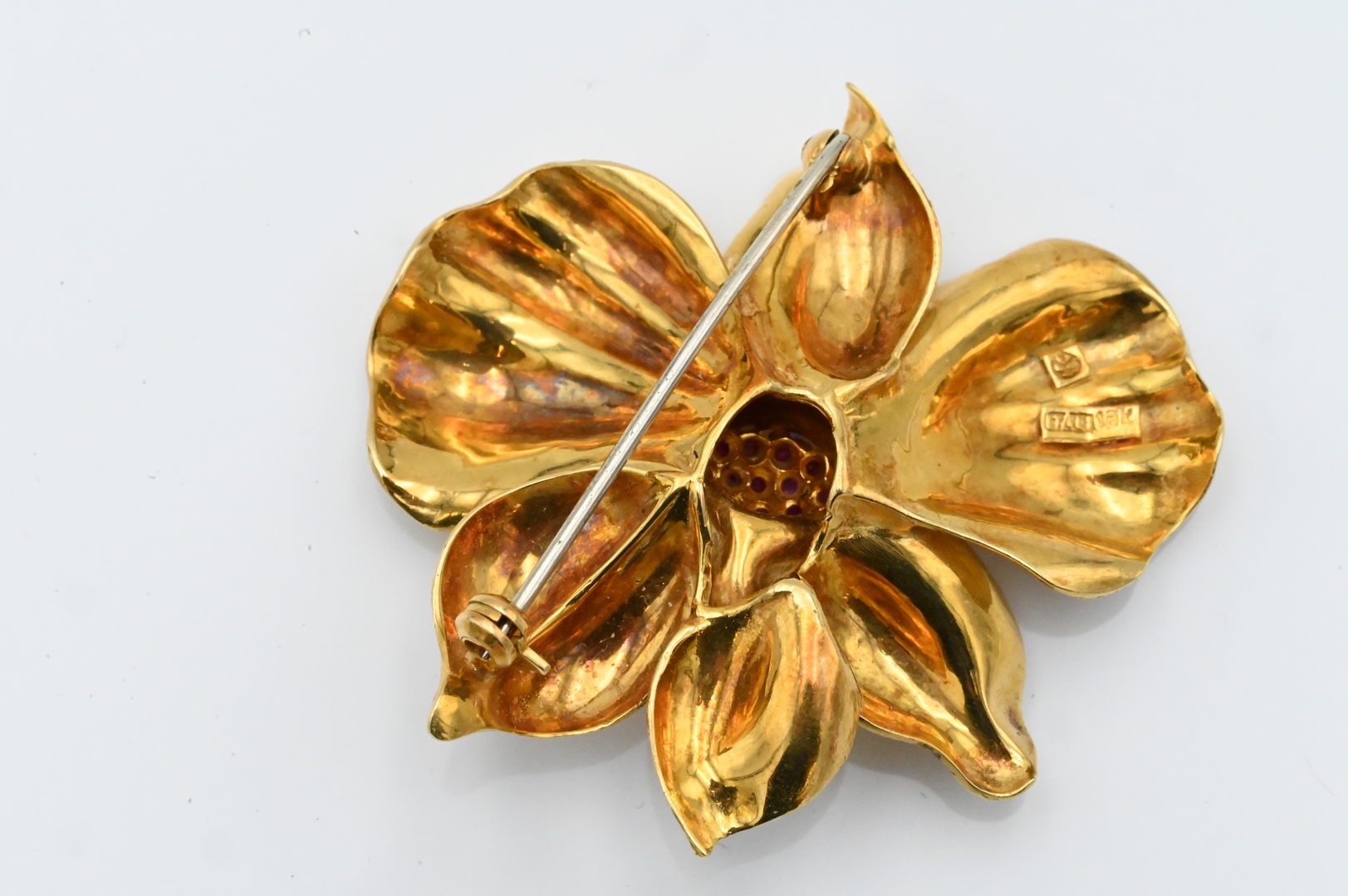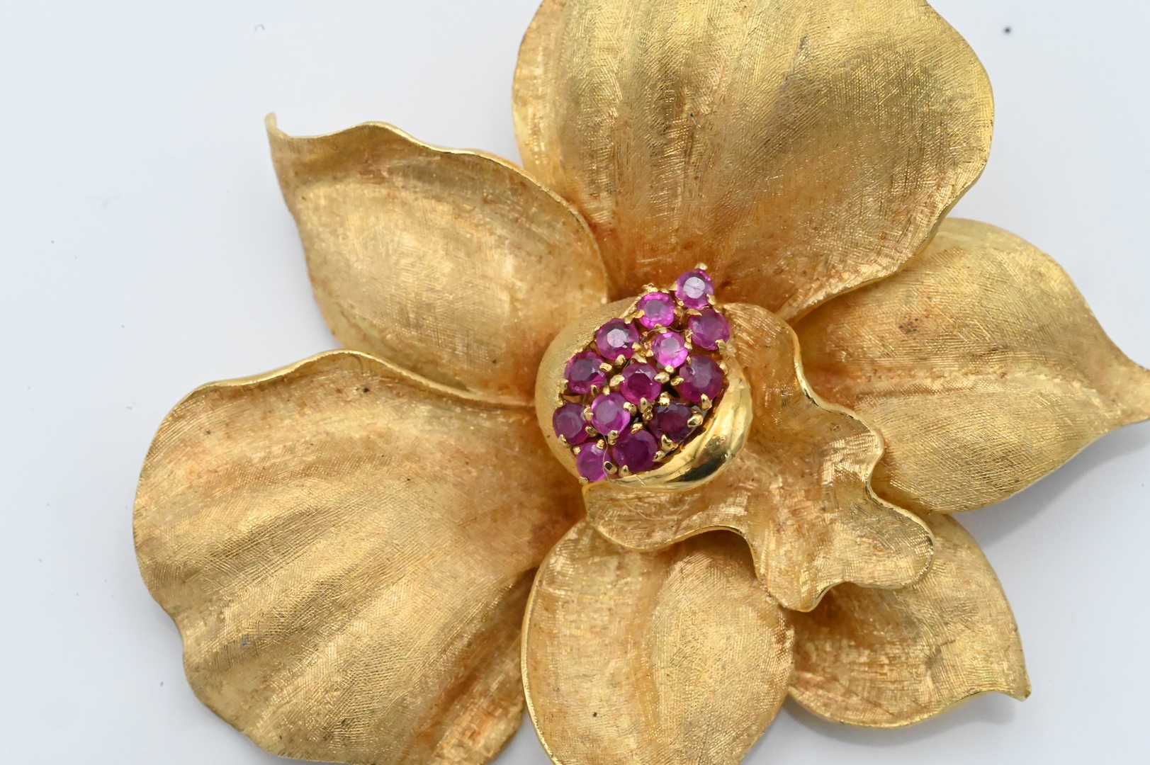 18 Karat Yellow Gold Brooch in the form of a flower, having pink sapphire center diameter 2 inches, 17 grams Provenance: An Estate from Redding, Connecticut