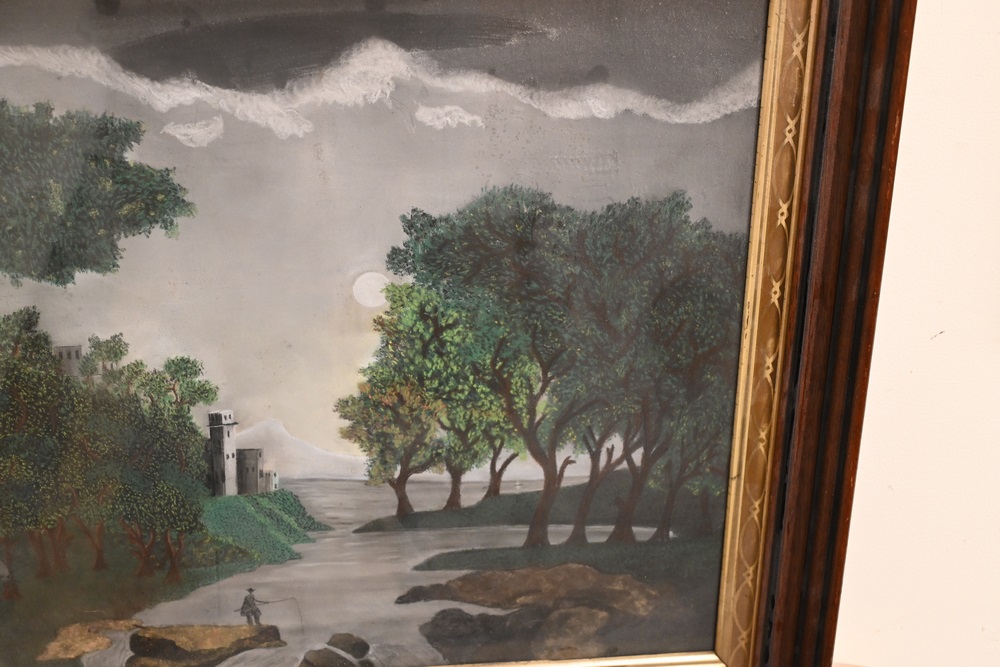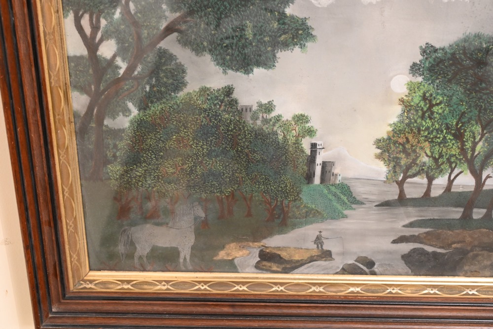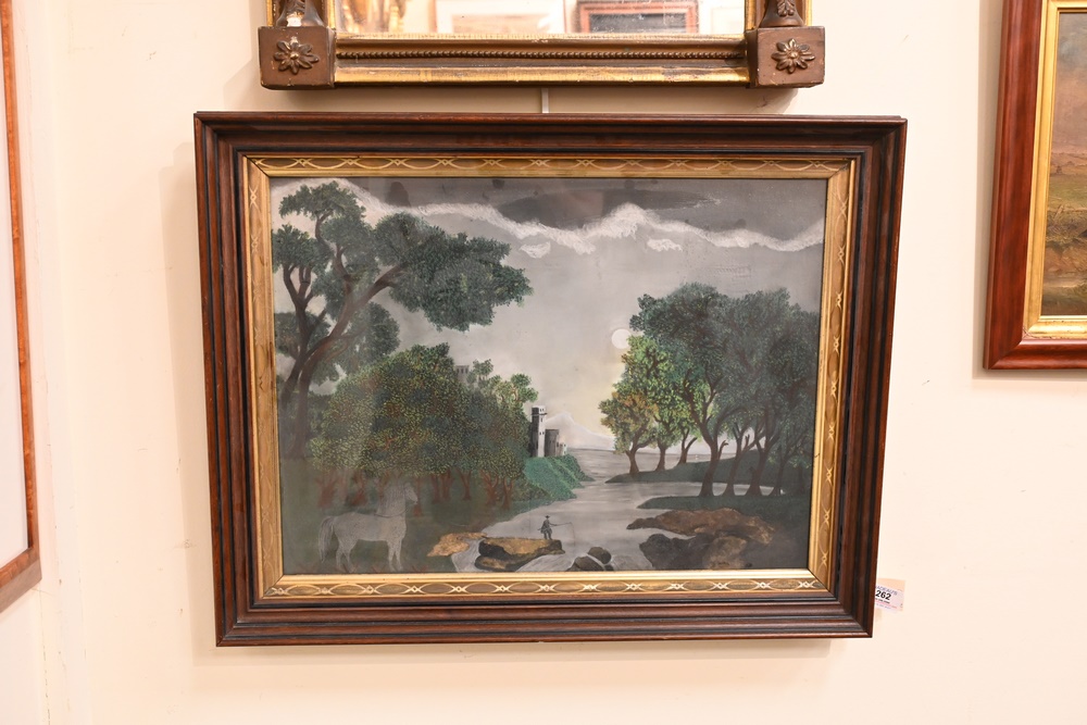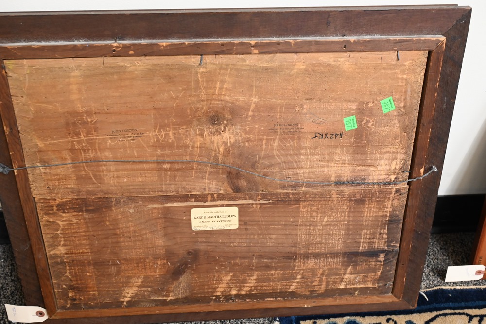 Lot 262: American School 19th century primitive landscape on a river having a figure and a horse watercolor on paper signed “S. Wood” sight size 16 x 21 1/4 inches Provenance: Purchased from Gary & Martha Ludlow, Inc., Lyndhurst, Ohio