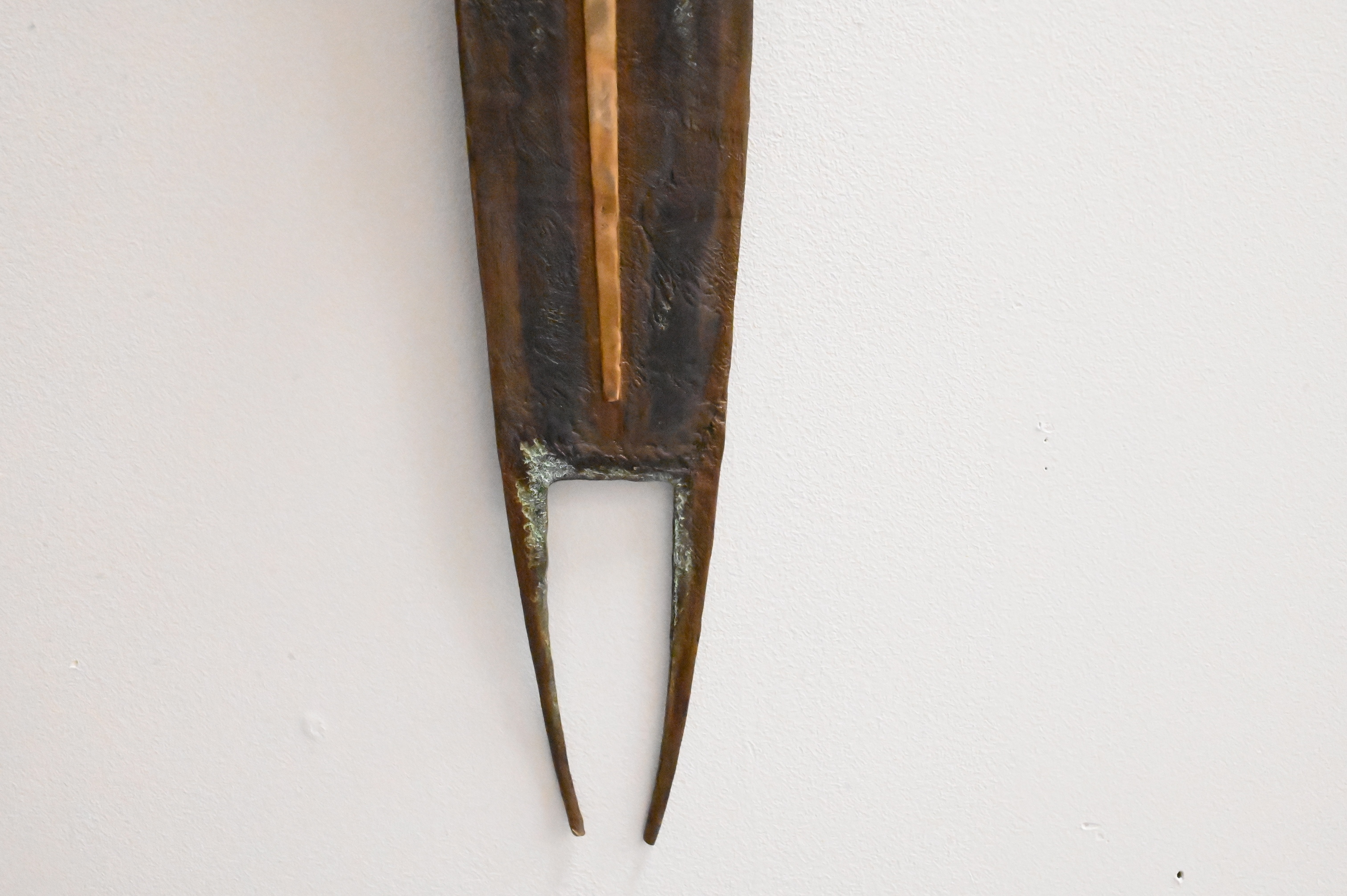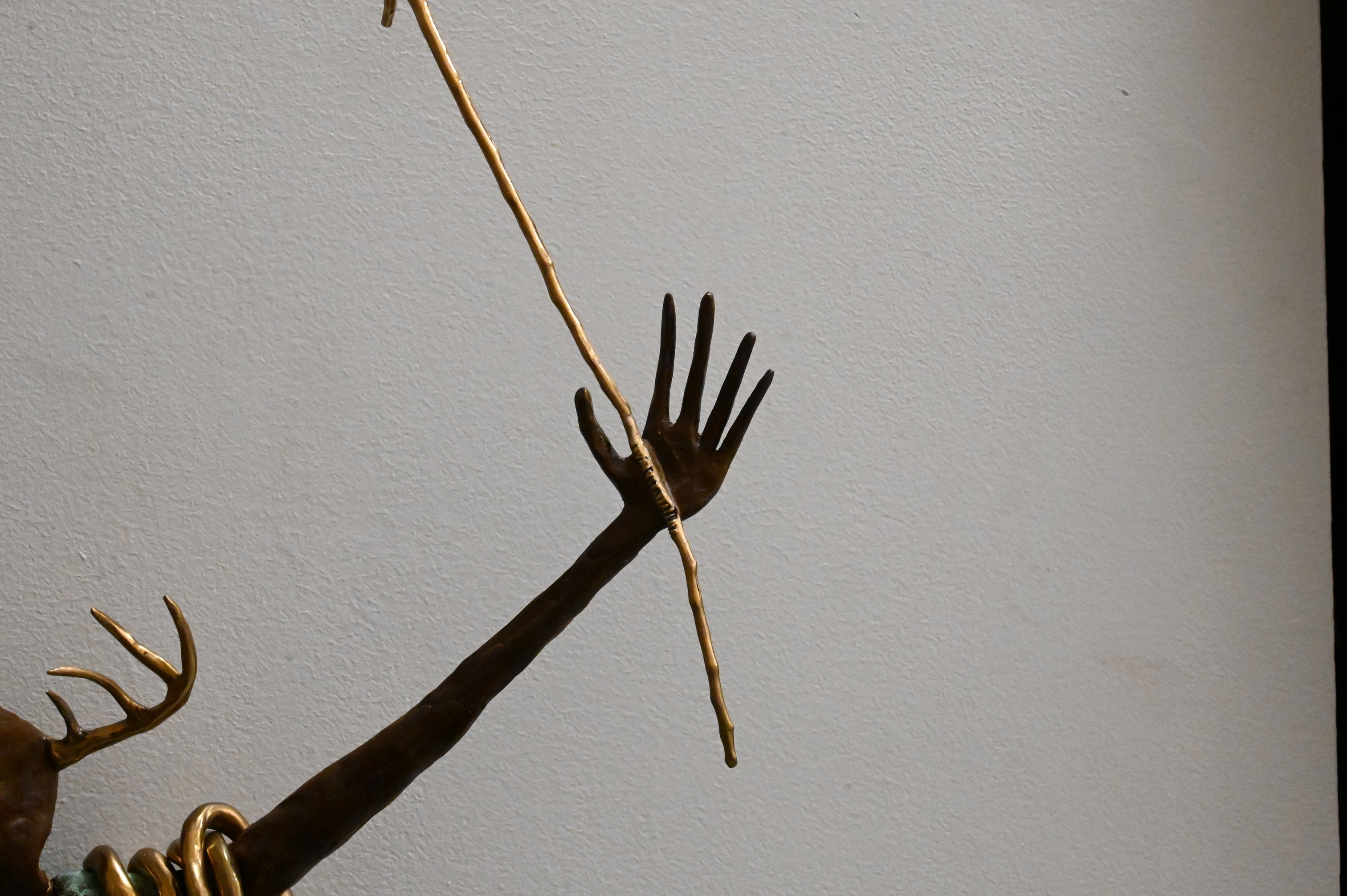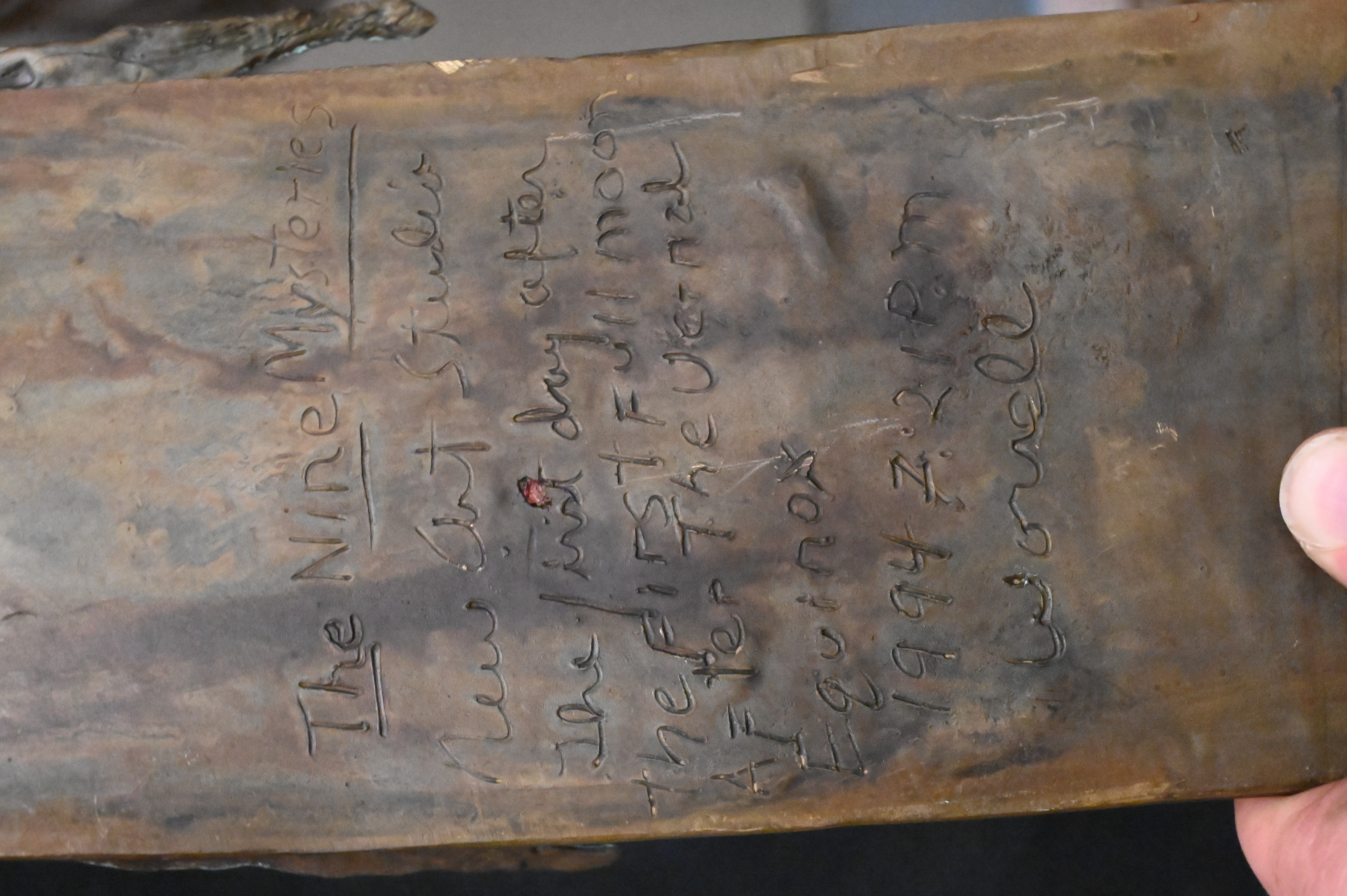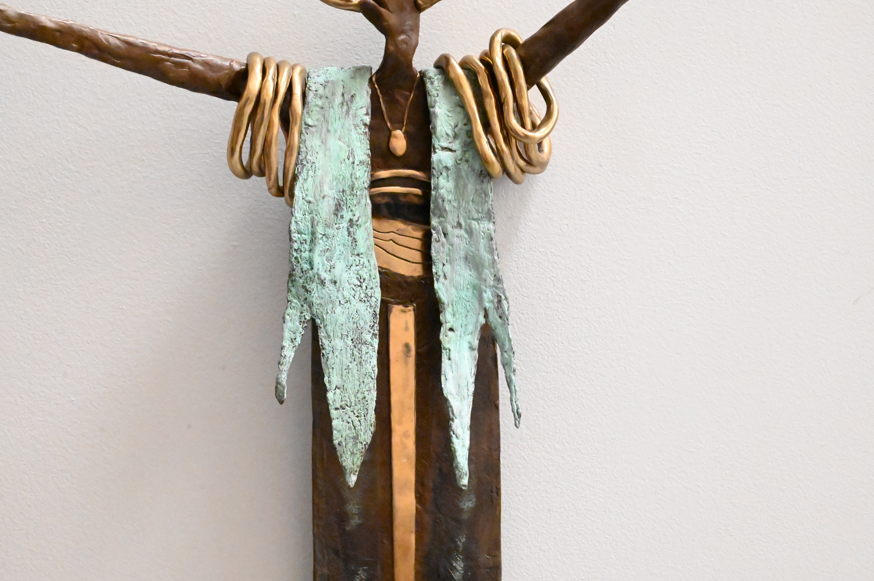 depicting a stylized shamanic figure with dramatically outstretched arms, antler-like extensions at the head, and multiple coiled arm rings, executed in Worrell’s iconic elongated form. The figure features a tall tapering body with a central gilt band and textured patinas, including turquoise-green draped cloak elements. The reverse is incised with the full inscription: “The Nine Mysteries / New Art Studio / the first day after the first full moon after the Vernal Equinox / 1994 / 7:21 PM / Worrell.”