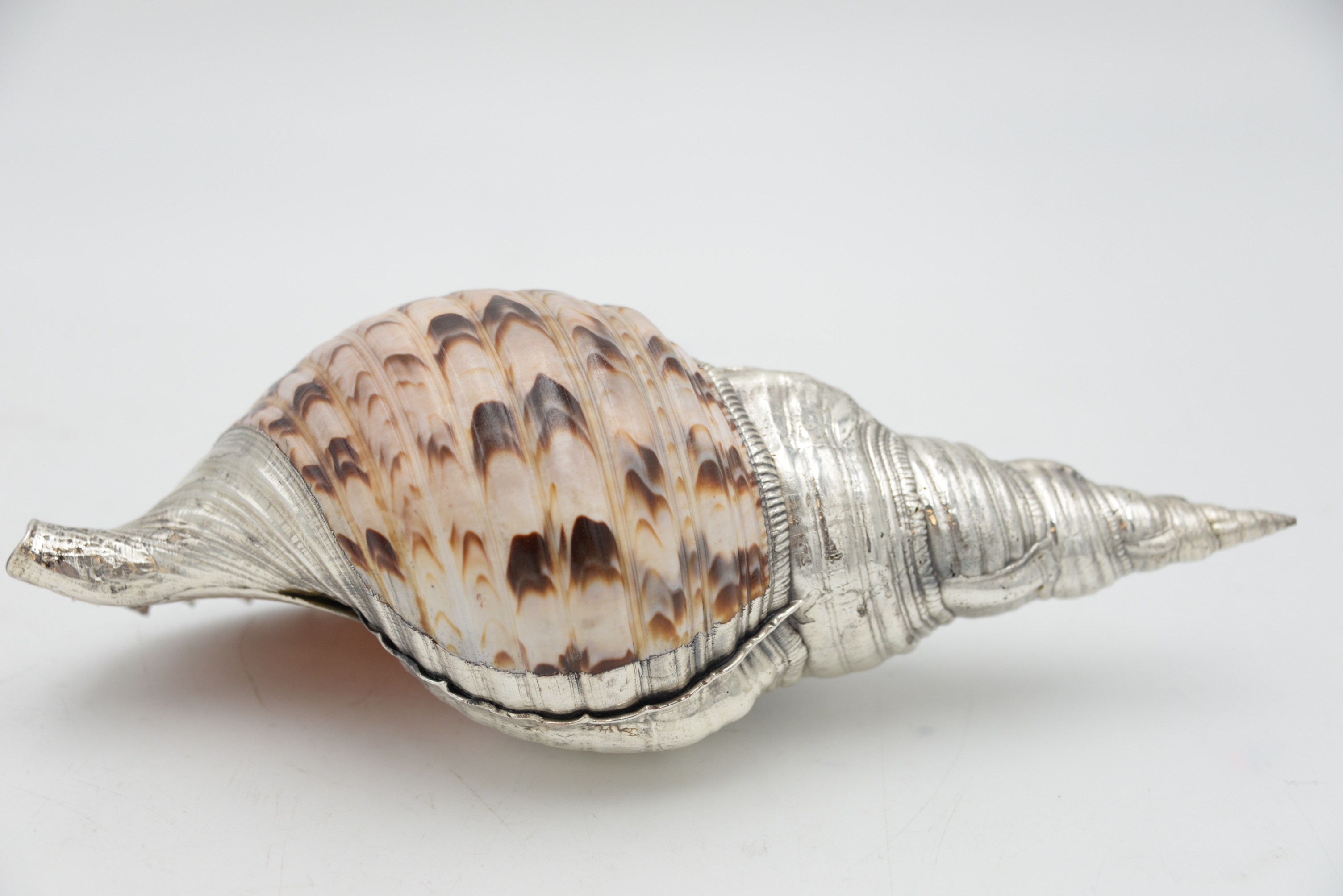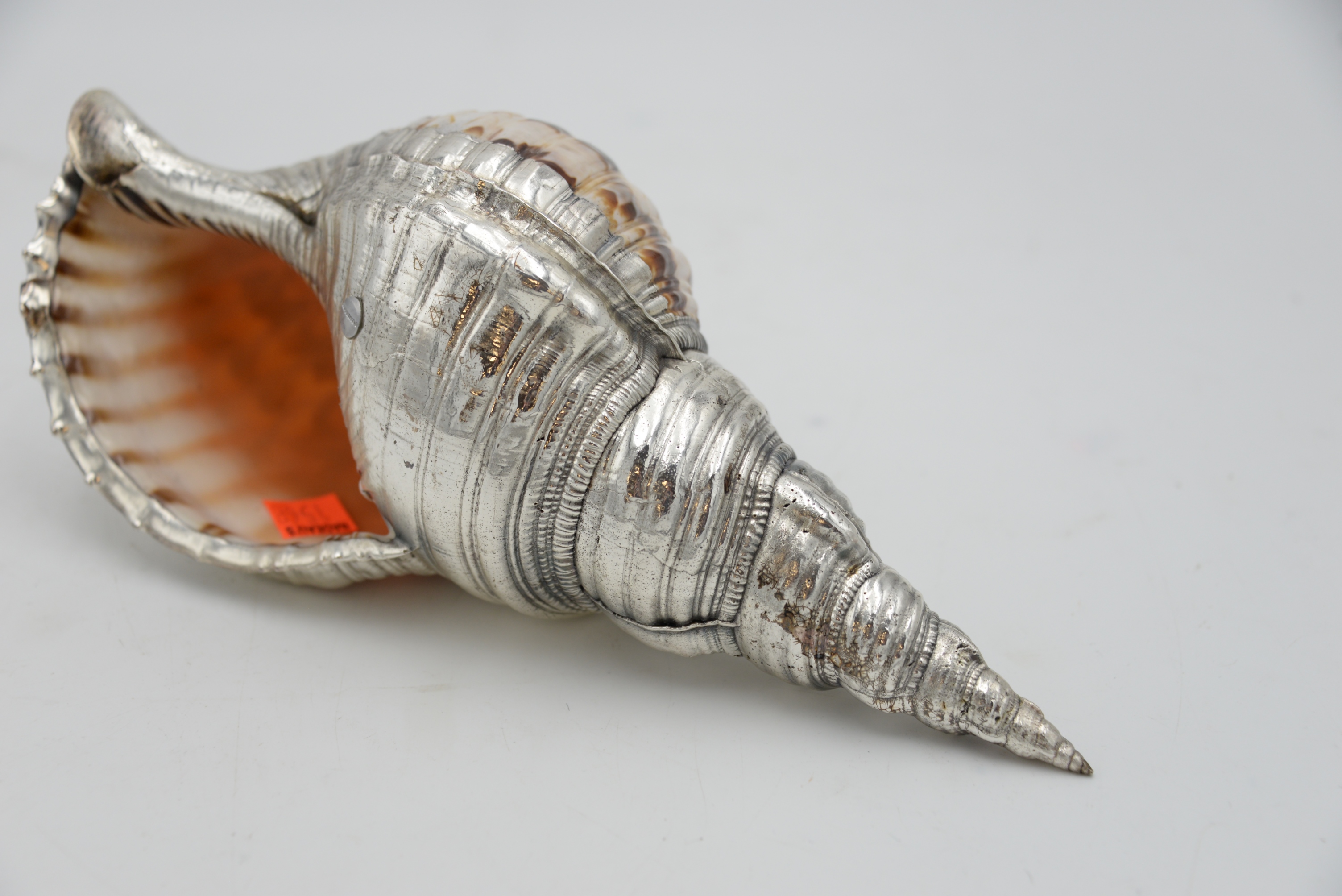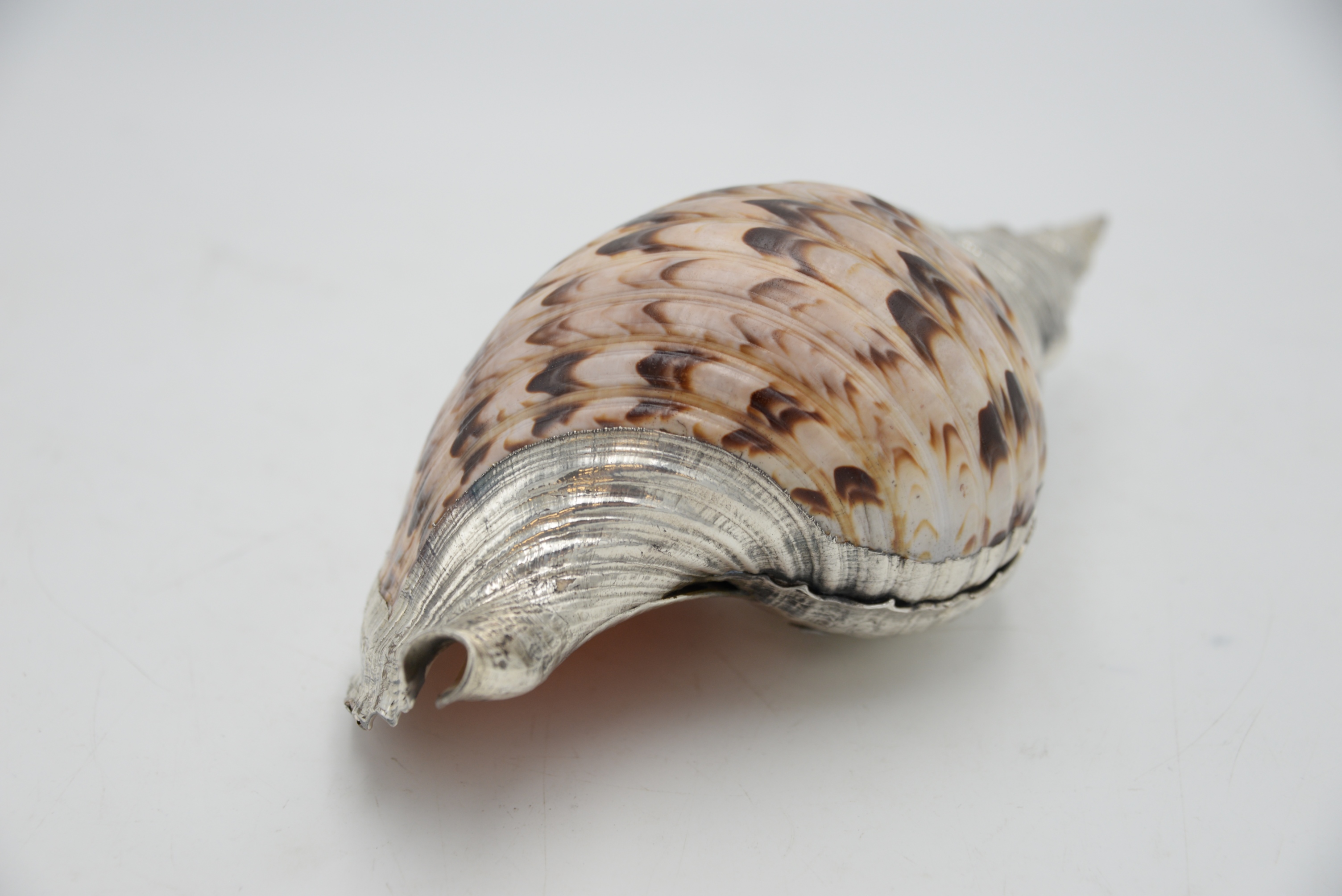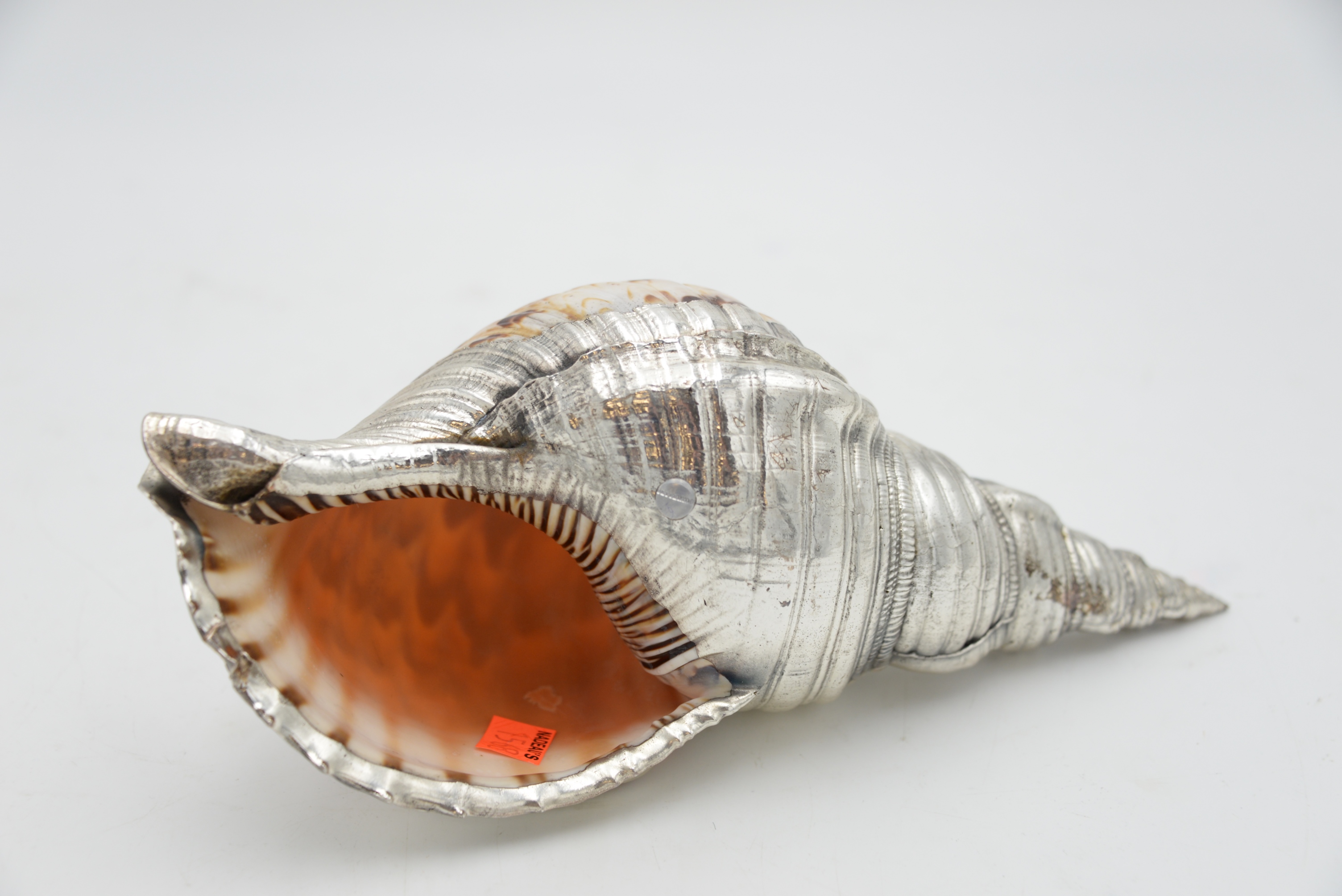 Conch Shell, having silver overlay, marked “Betteridge” on bottom, height 4 inches, length 12 inches. Provenance: A Private Collection from Greenwich Connecticut.