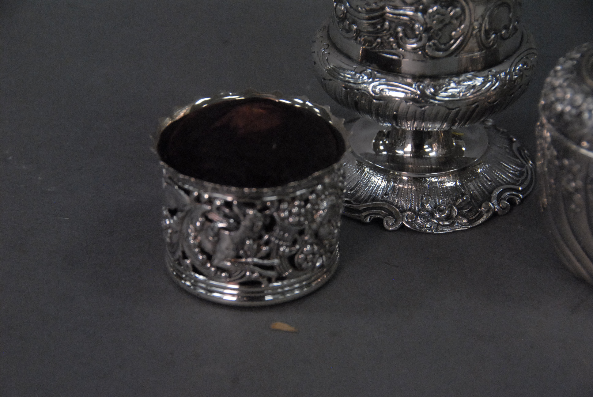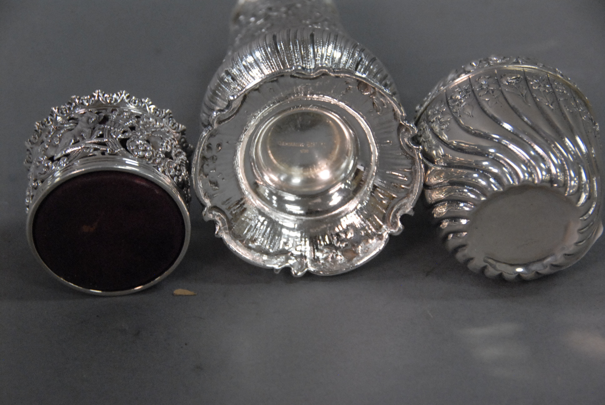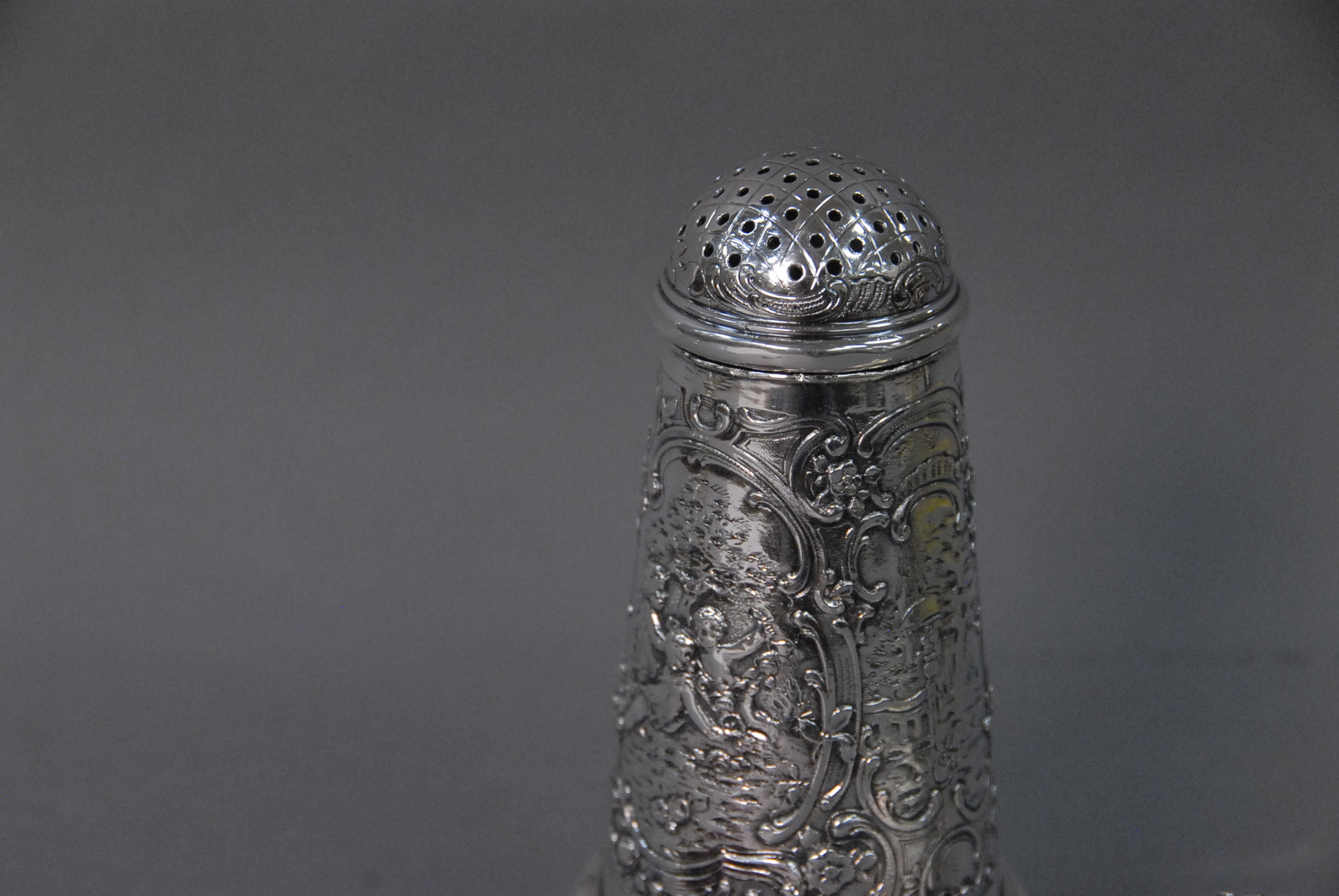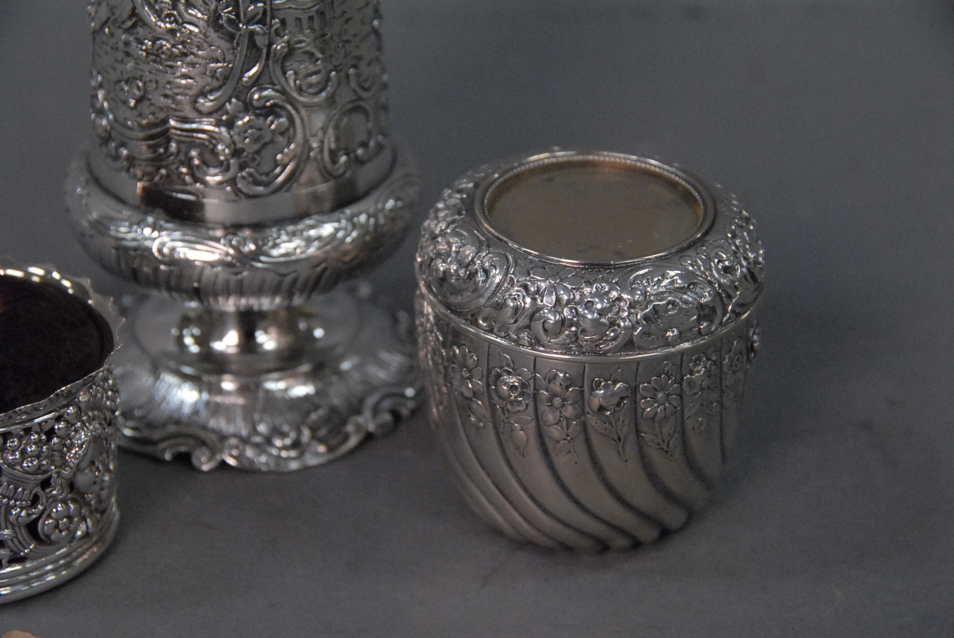 Continental silver three piece lot including a caster, powder jar with puff, and a pin cushion.