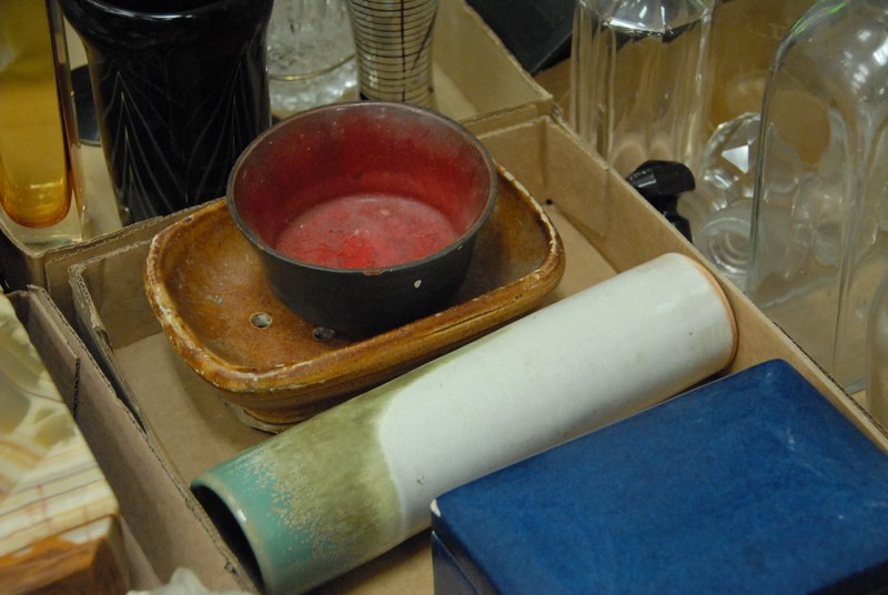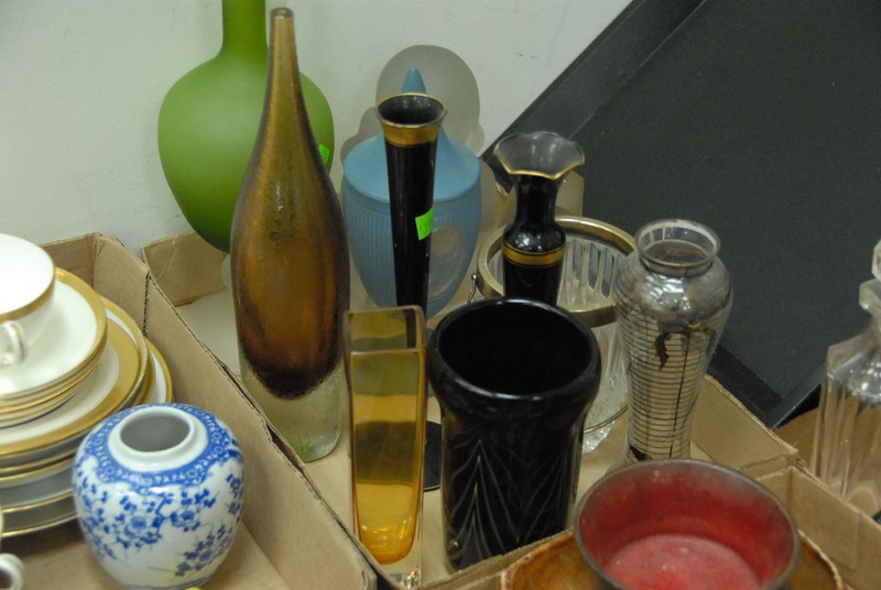 Five box lots with seven crystal decanters, artglass vases, Japanese stoneware vase, quartz rock, Oriental stand, etc.