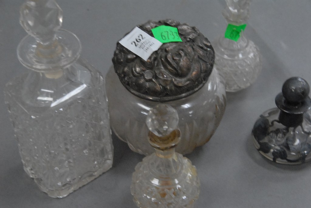 Lot 262: Five piece lot: silver overlay cologne bottle, powder jar with silver top, and three cut crystal cologne bottles.