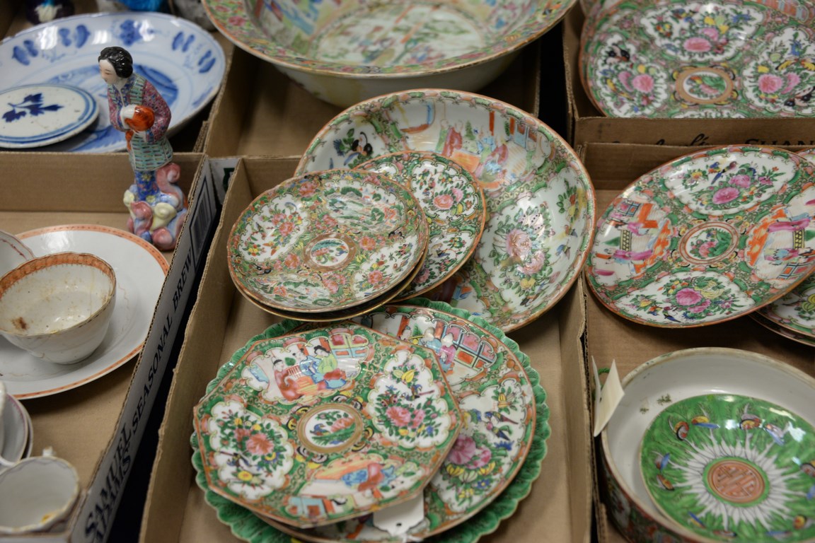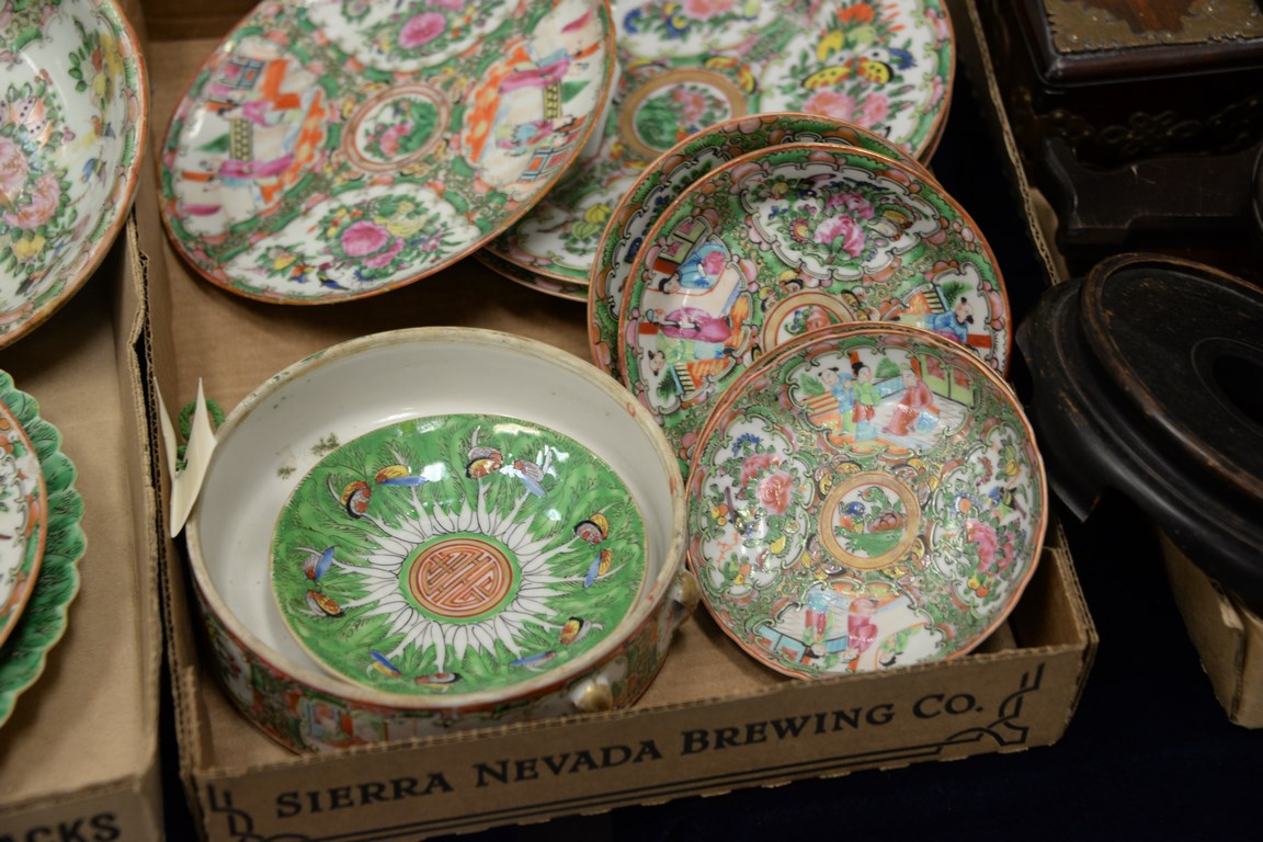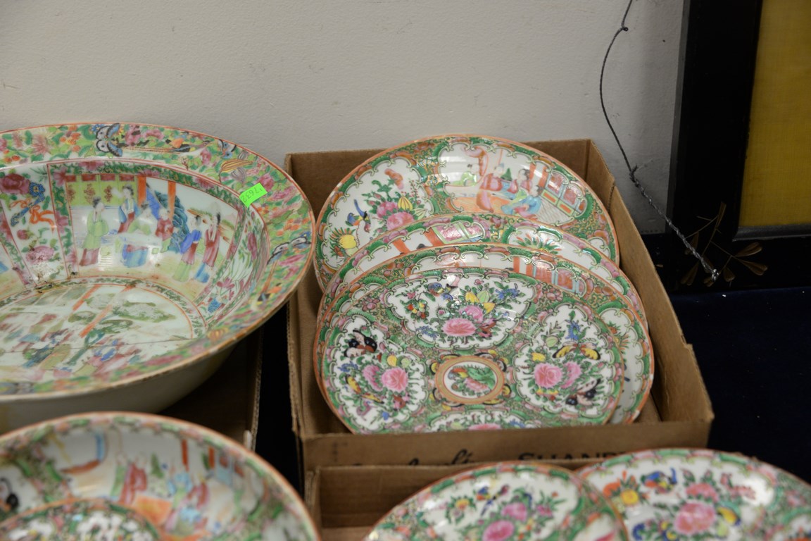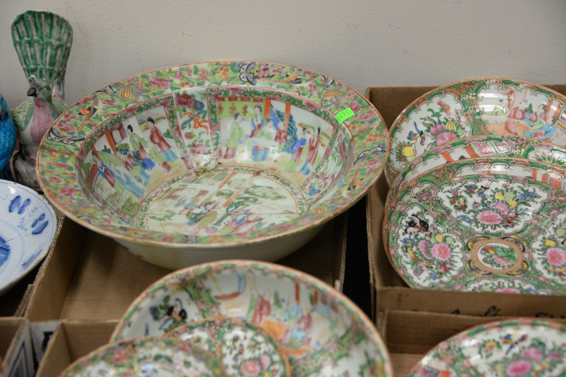 Four box lots including Rose Famille plates, saucers, serving pieces, etc.