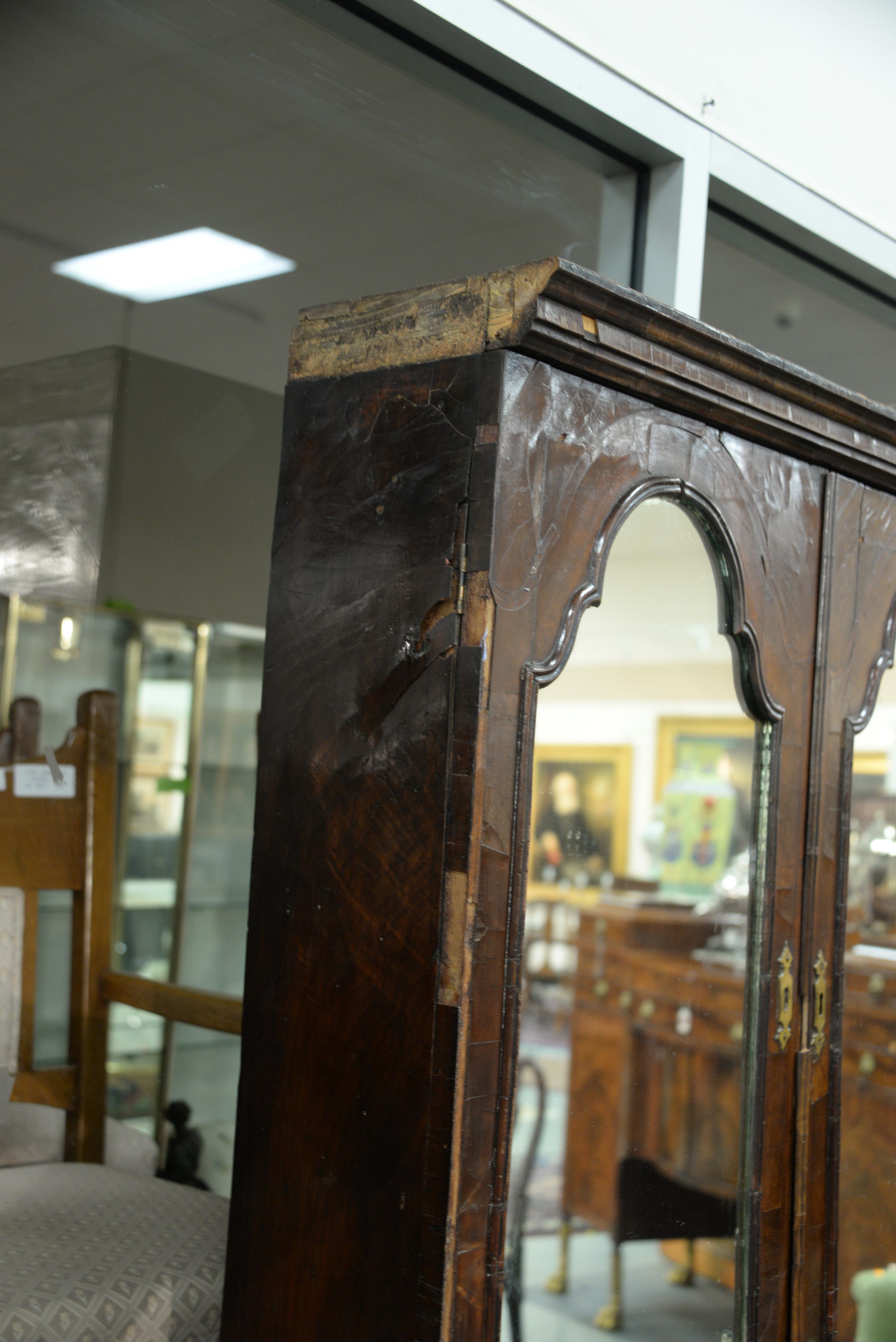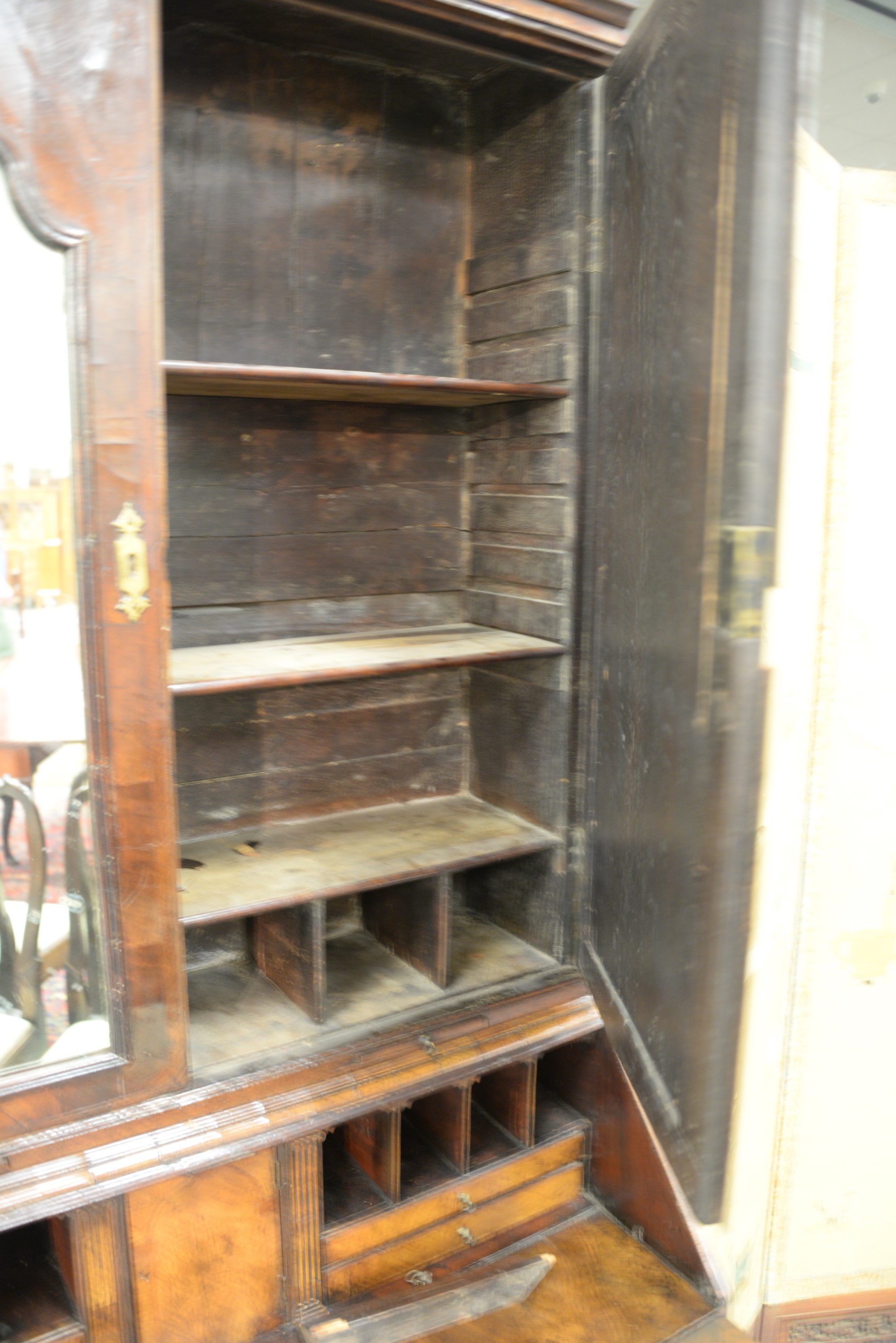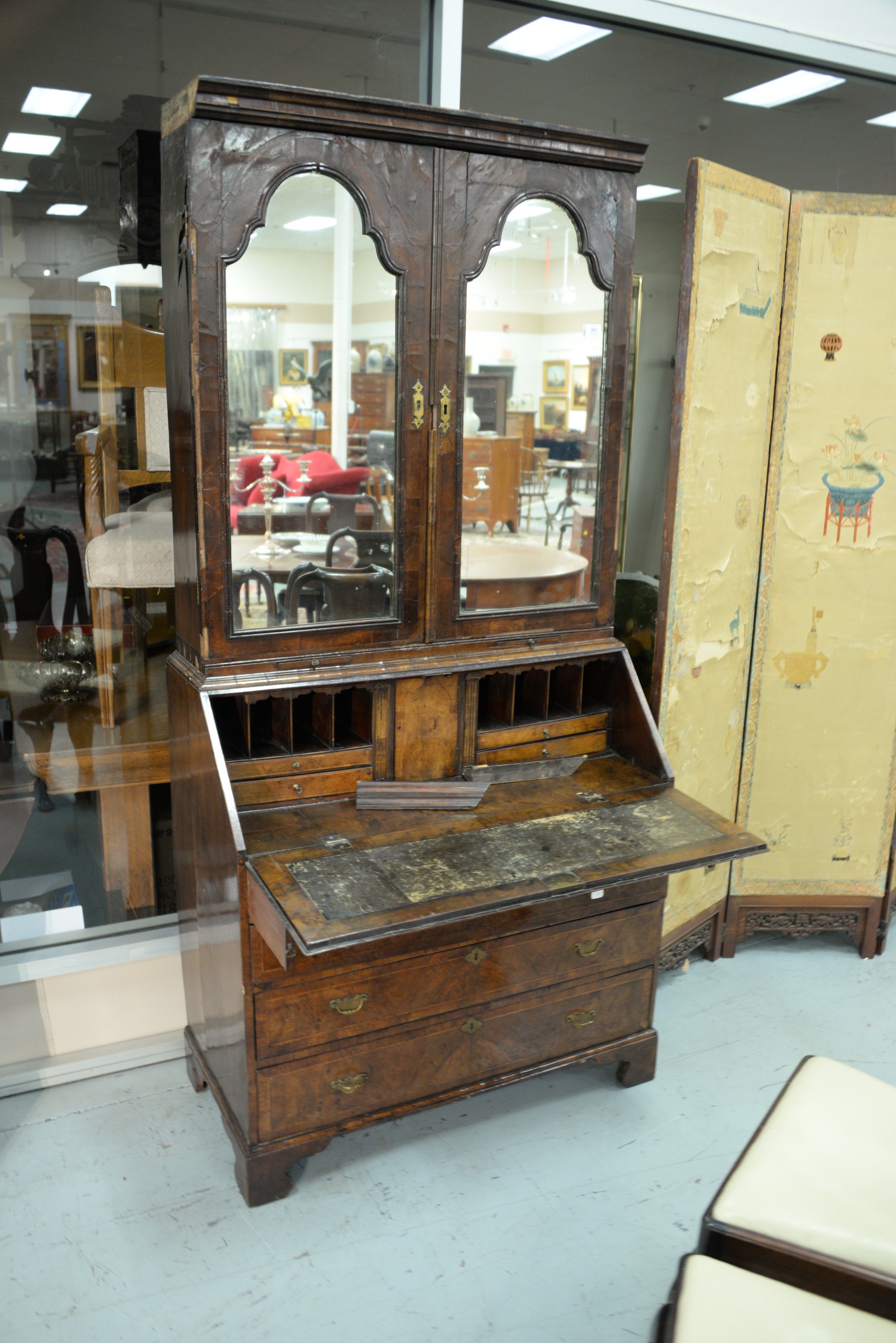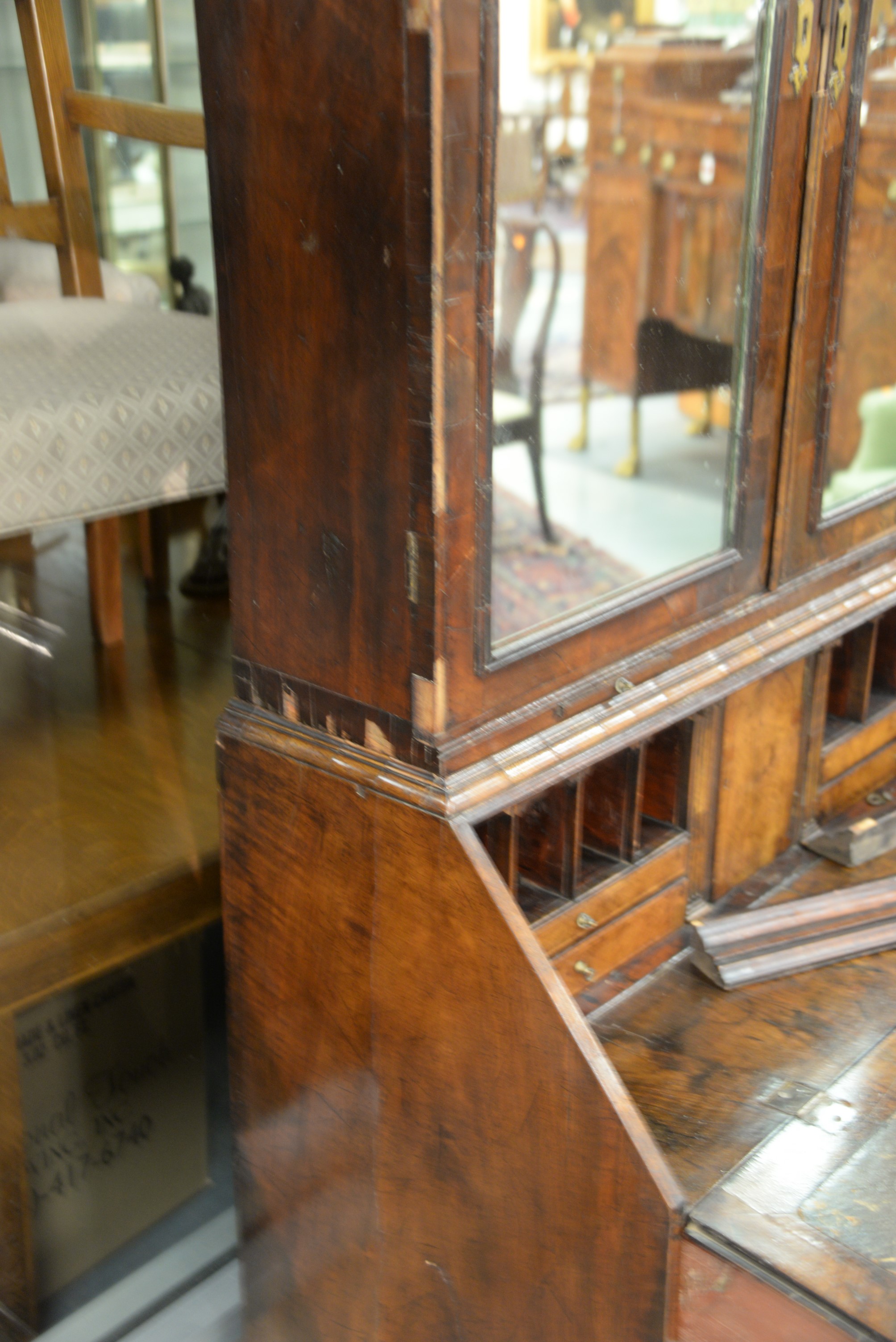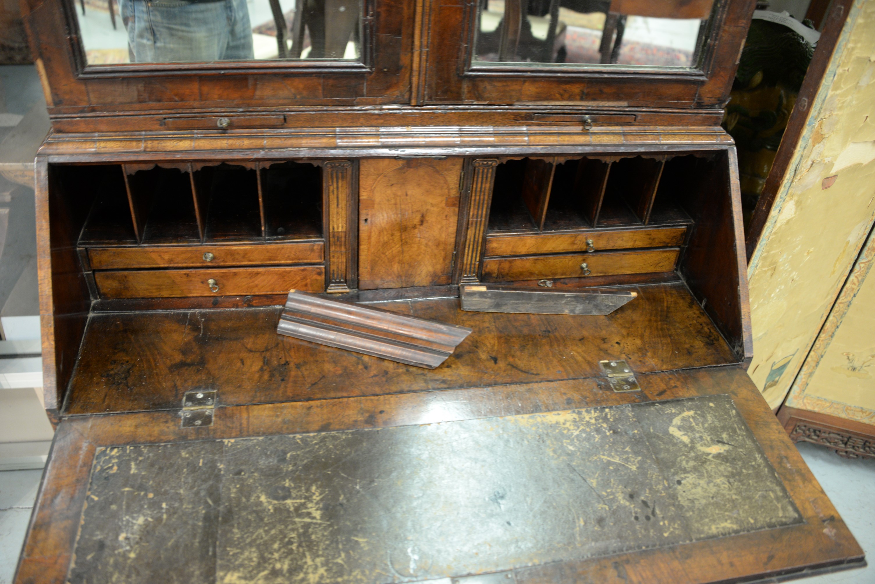 George II burlwood secretary desk in two parts, upper portion with two mirrored doors over desk with slant lid over four drawers, early to mid 18th century small parts and veneer missing. ht. 81 1/2 in. top case wd. 37 in. dp. 19 in. Provenance: The Estate of Natalie Rafferty