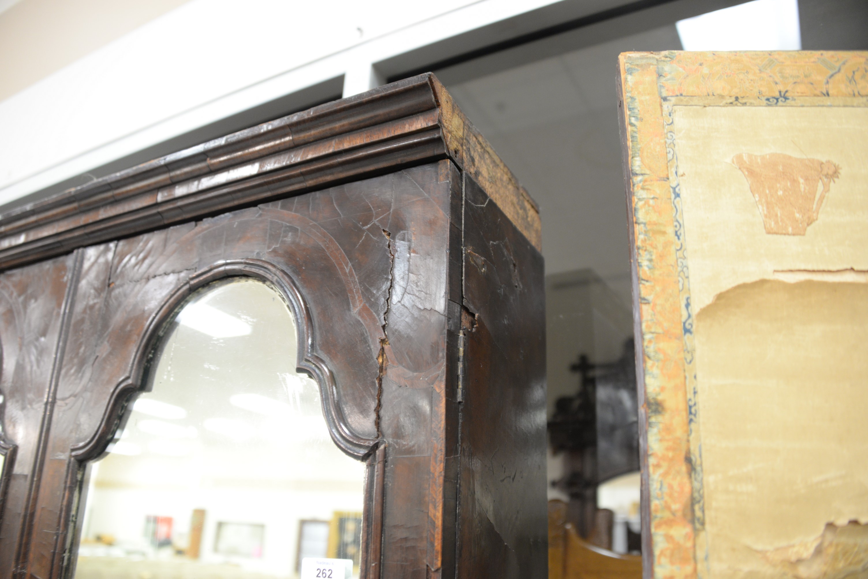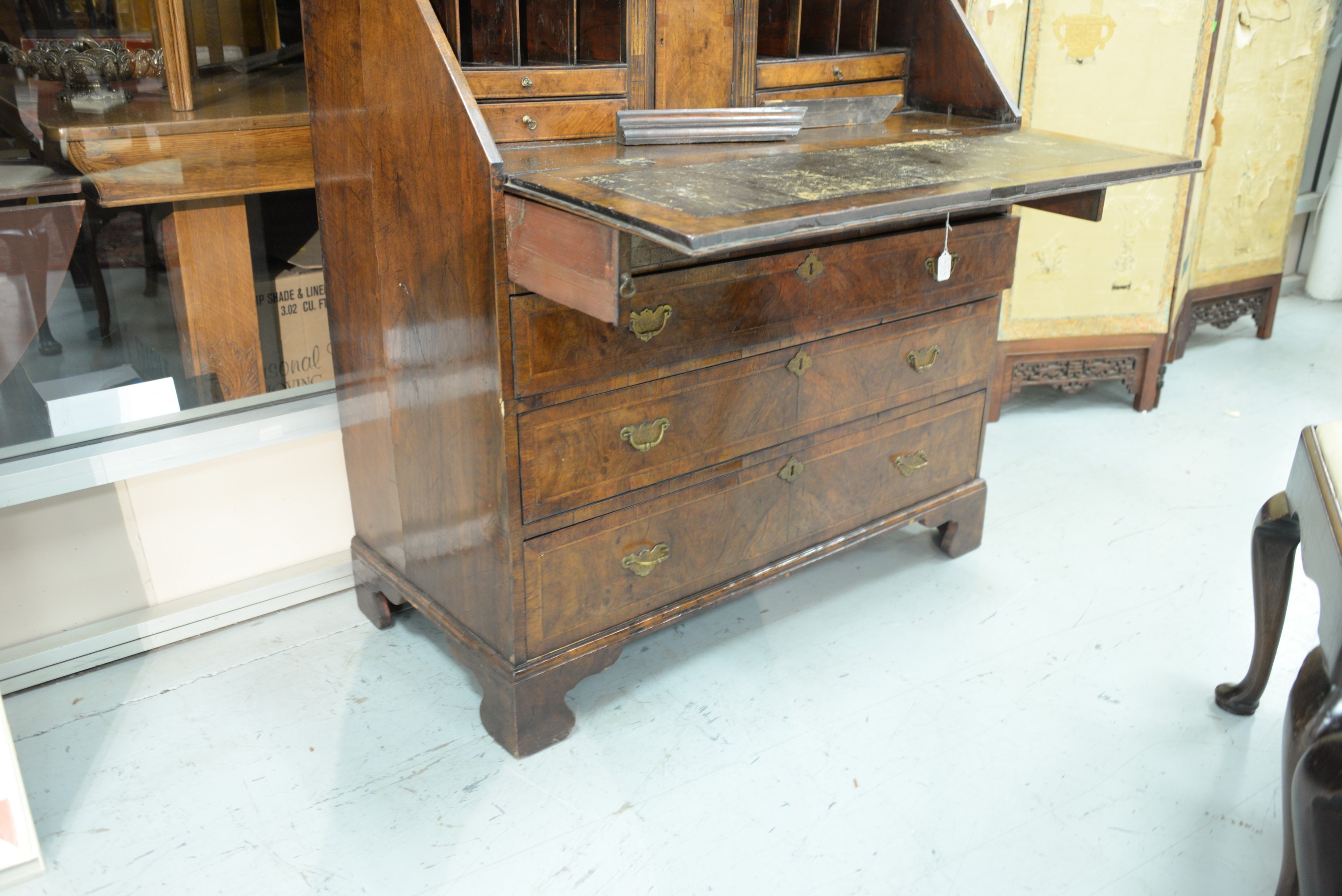 Lot 262: George II burlwood secretary desk in two parts, upper portion with two mirrored doors over desk with slant lid over four drawers, ea…