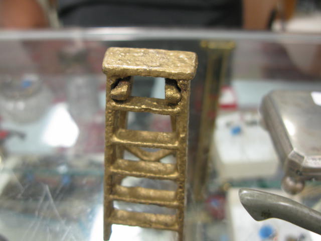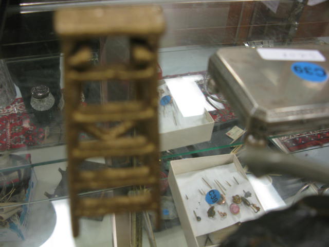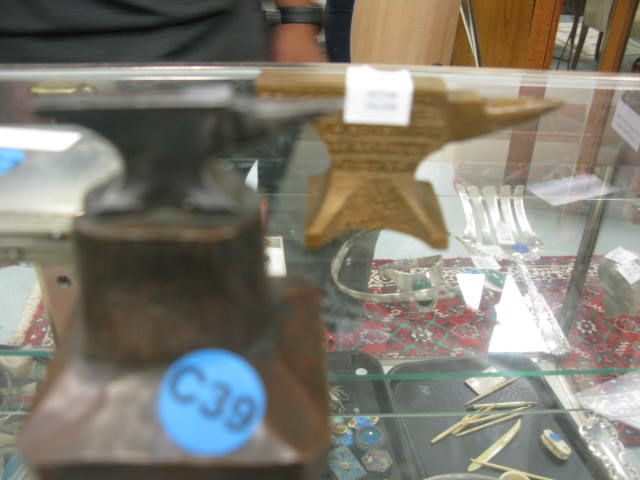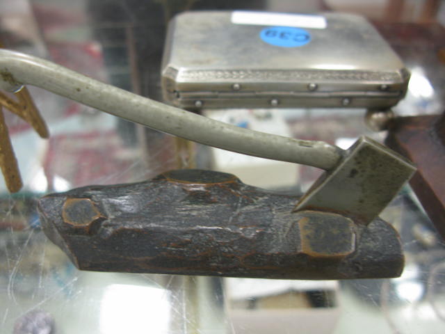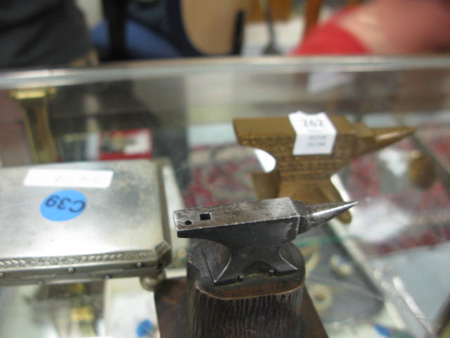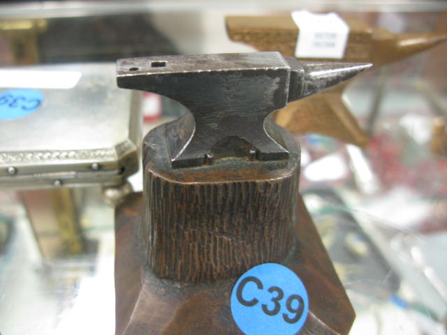 Group of four bronze pieces to include small bronze Copper, Smith and Brass Founders Babbitt Metals, a small anvil mounted on bronze stump marked F. Krazmer & Co, Boston, MA, small metal latter and small metal hatchet mounted on bronze log