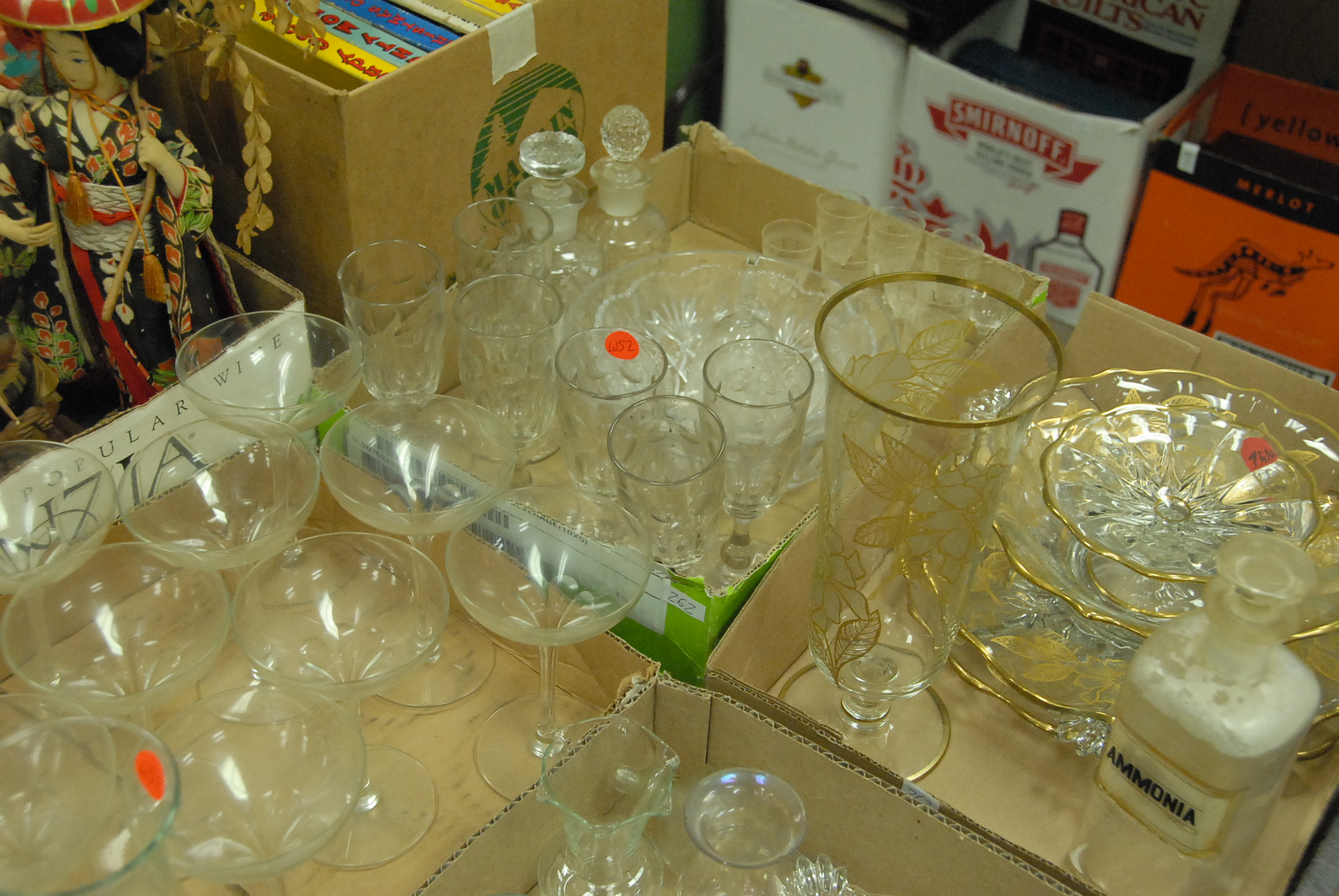Grouping of 6 box lots and a shadow box framed fan, dolls, crystal stems, gold decorated crystal etc