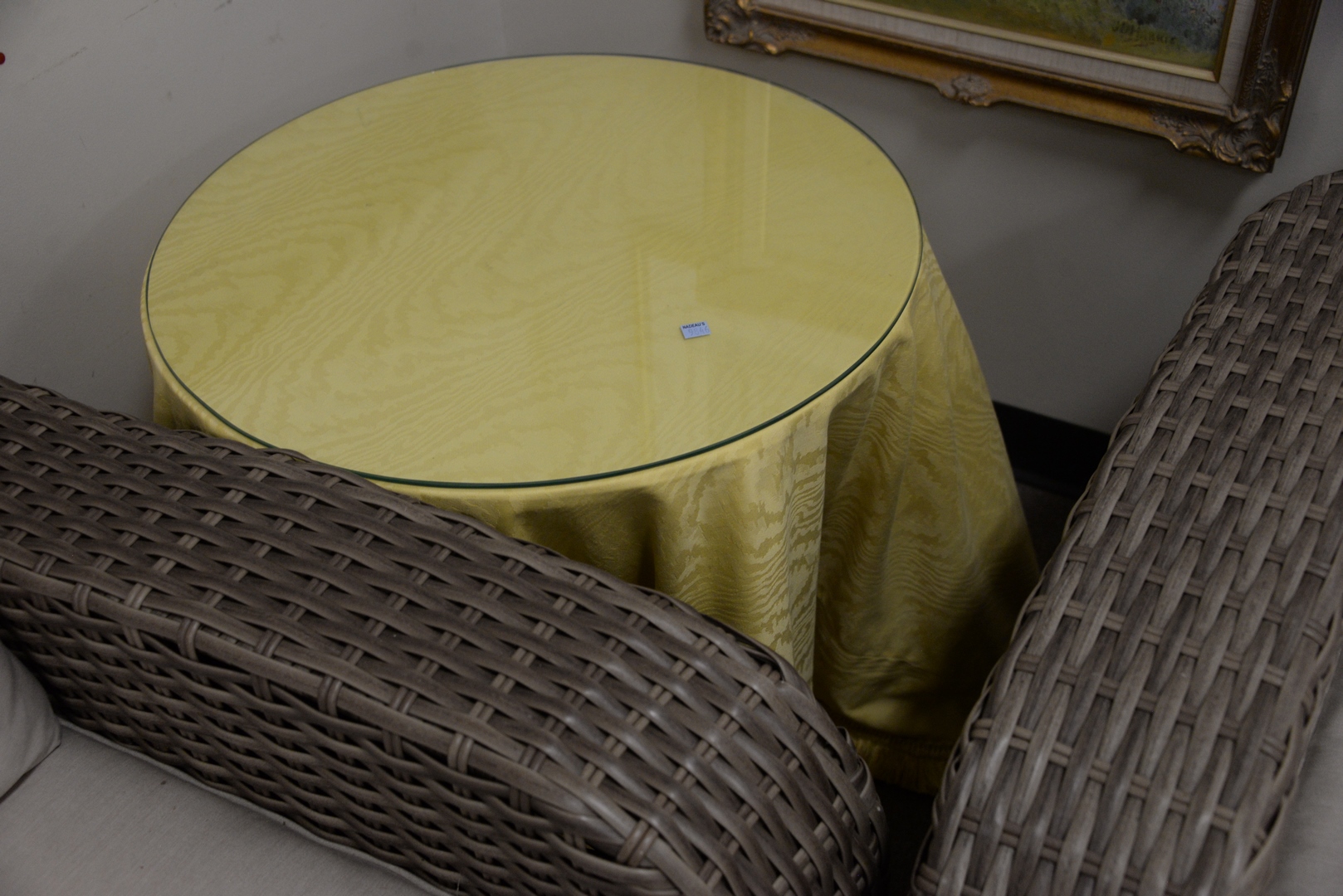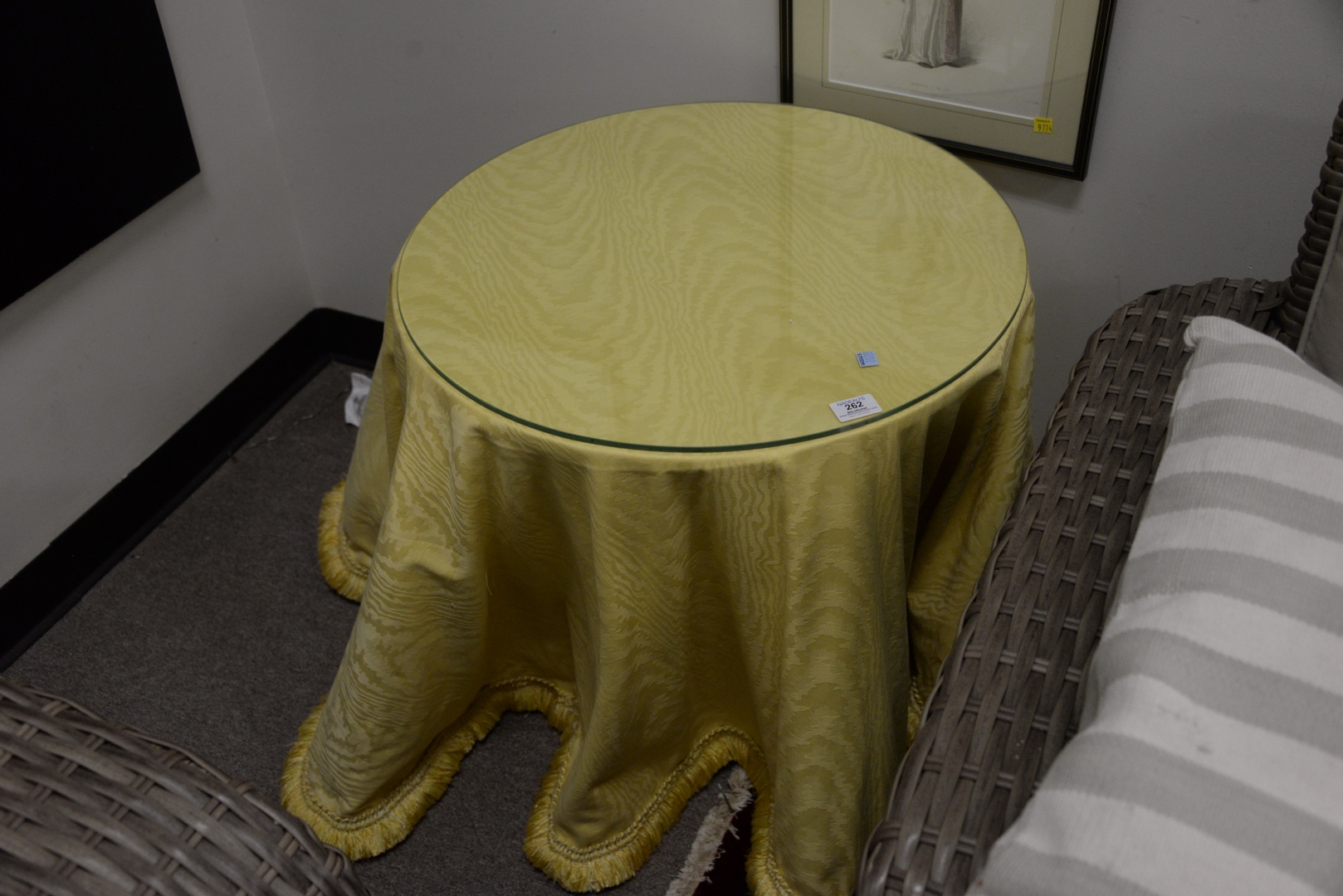 Lot 262: Pair of Round Tables with yellow linen cloth having glass top, height 24 inches, diameter 24 inches.