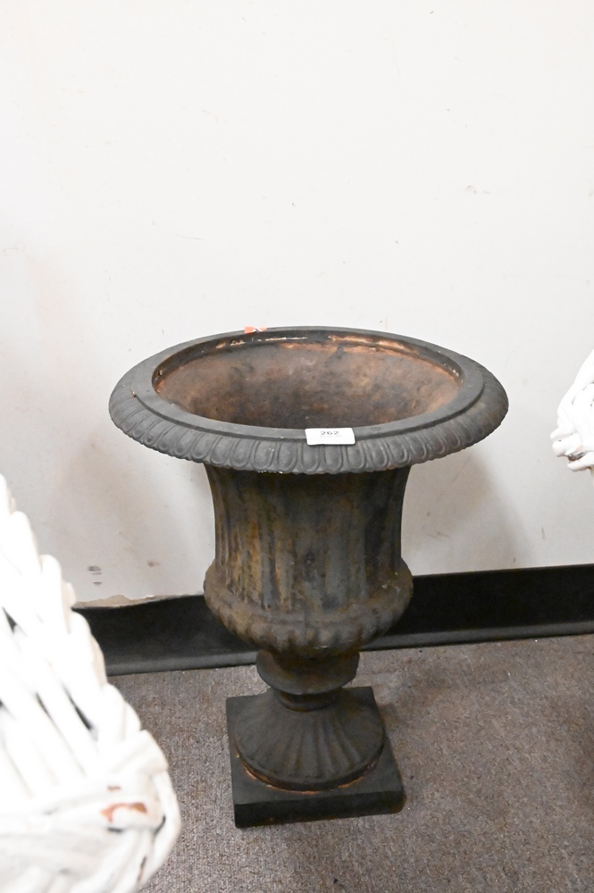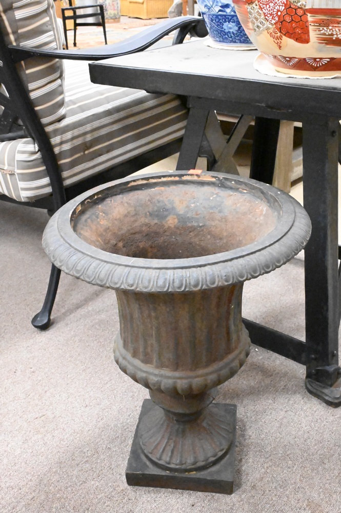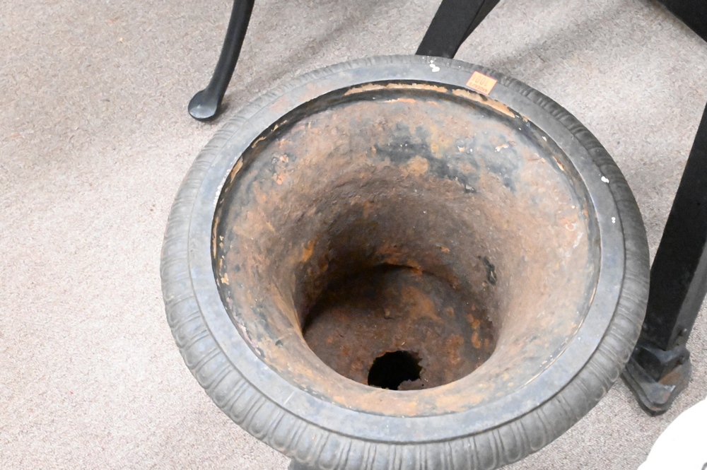 Pair of Victorian Iron Urns, height 19 inches, inside diameter 11 1/2 inches.