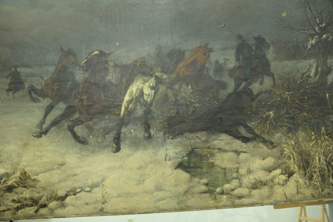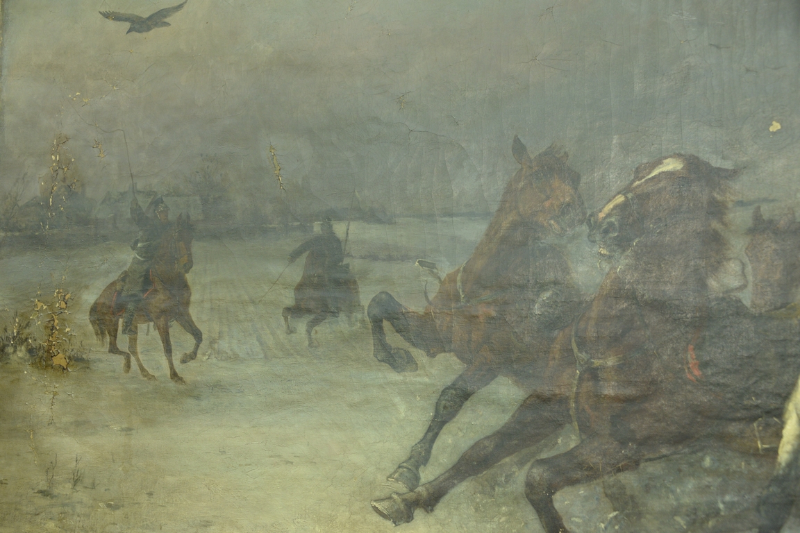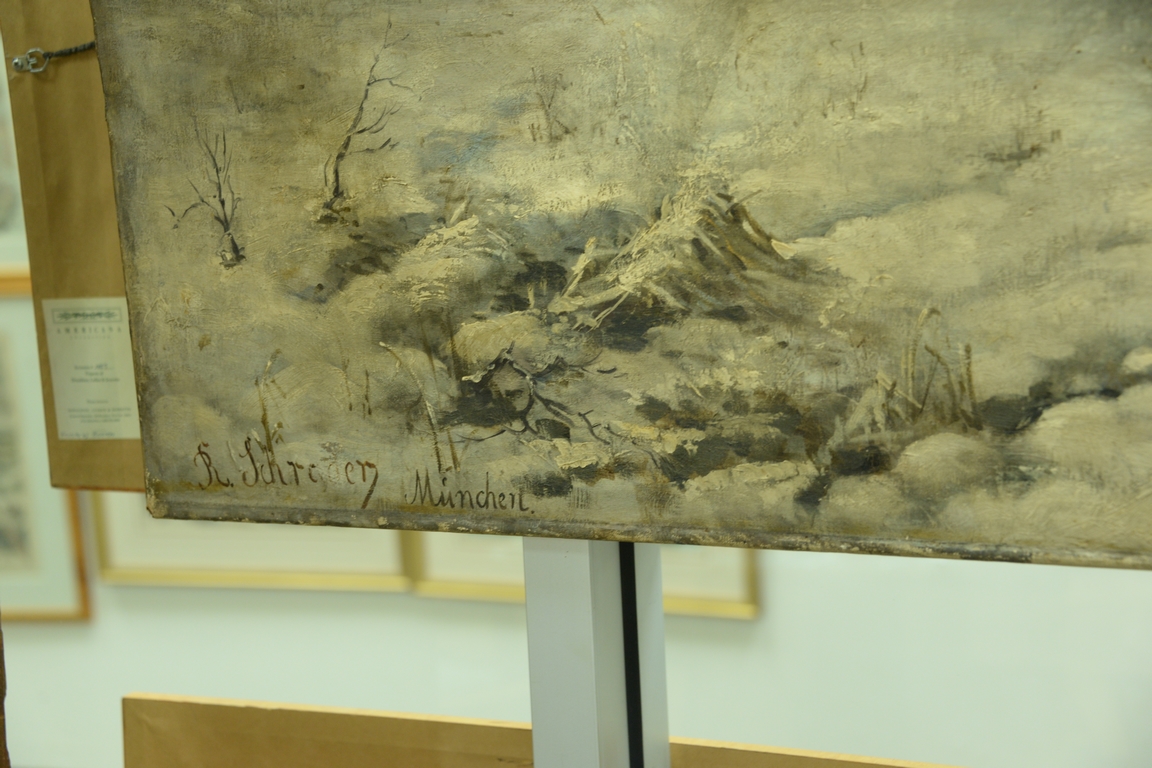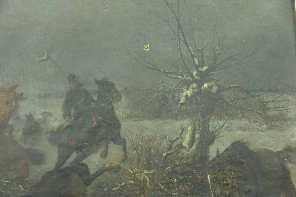 Lot 262: Rudolf Schrader b. 1853 oil on canvas Horses on the Loose winter landscape, signed lower left R. Schrader Munchen, 39 3/4 x 78 1/2.