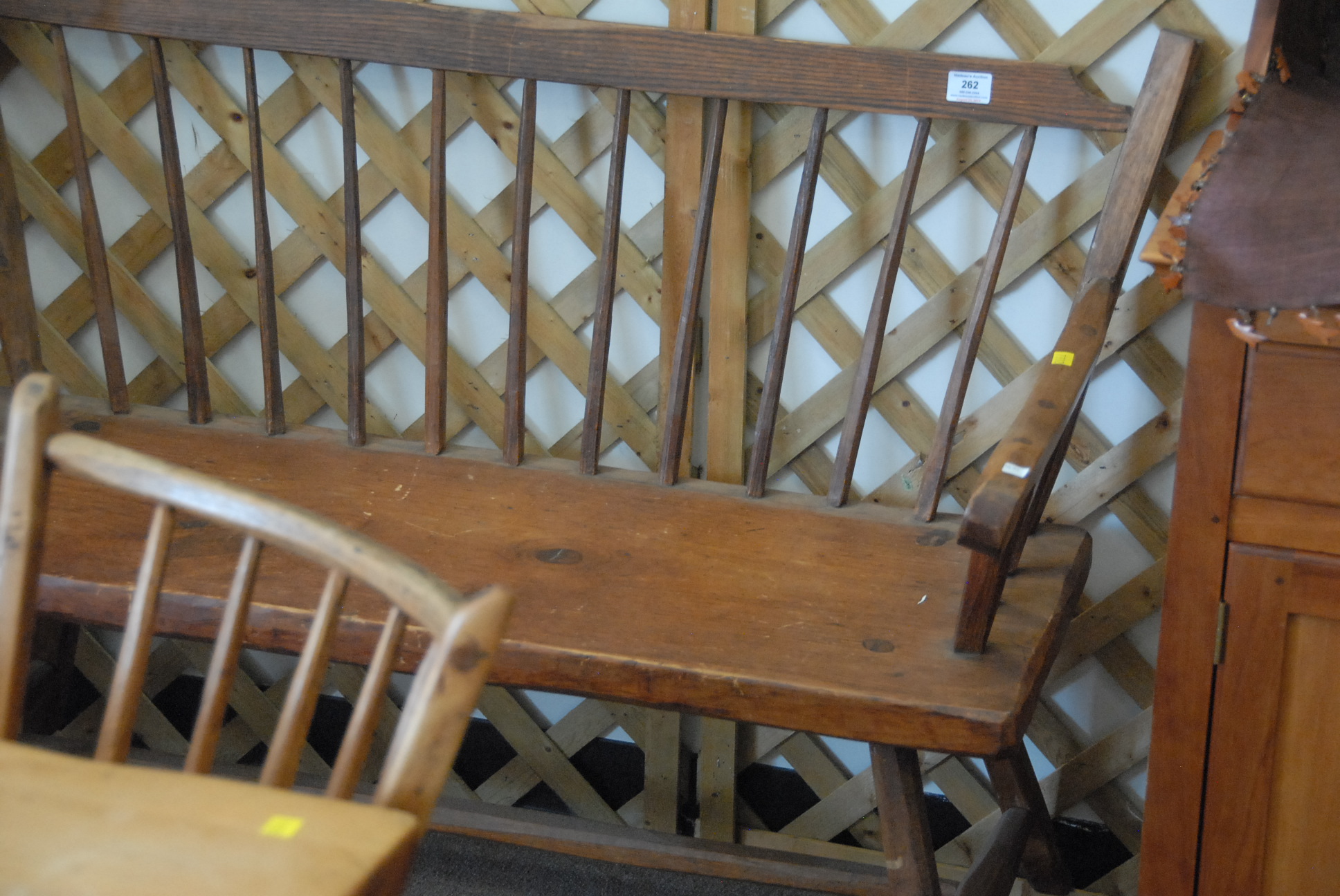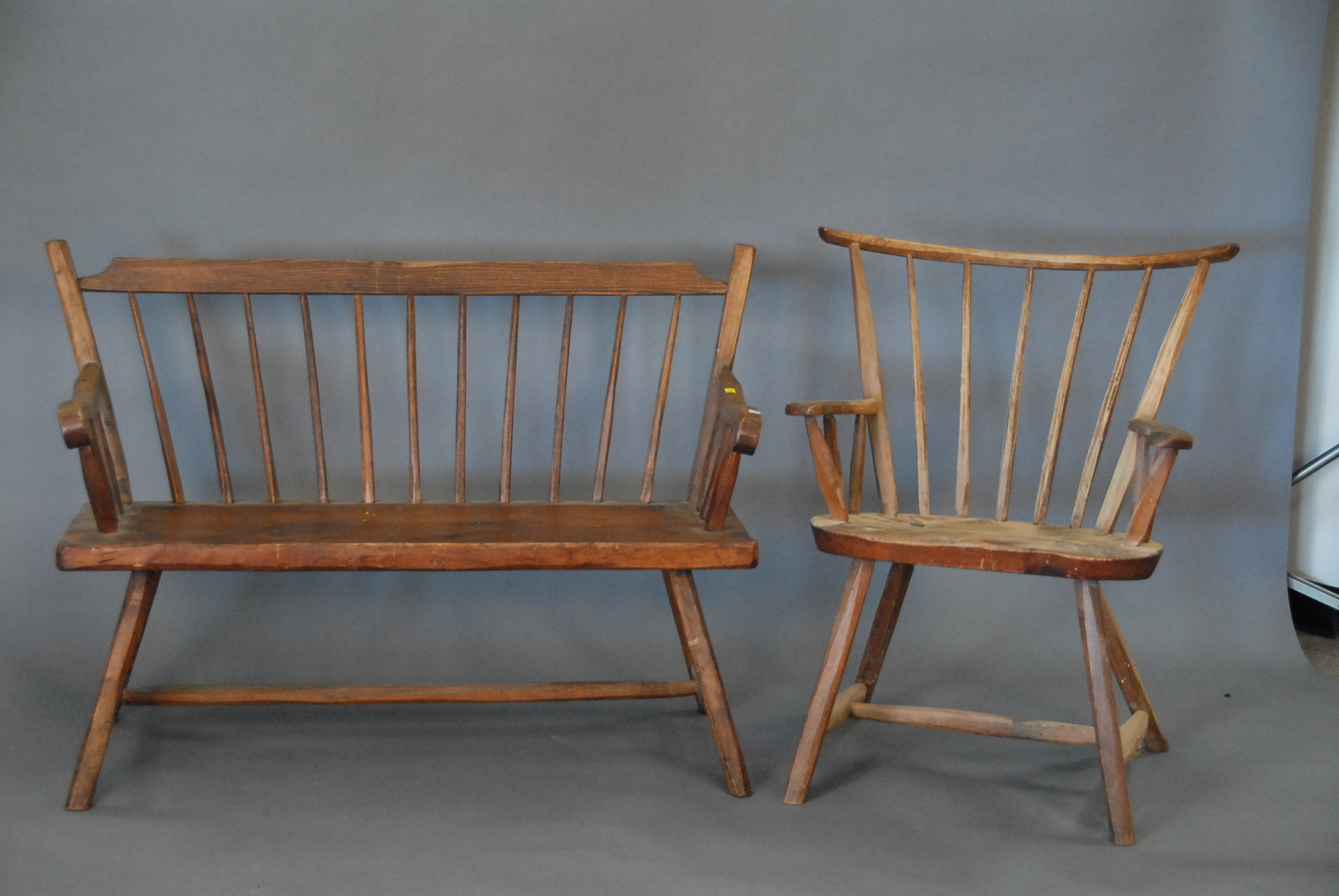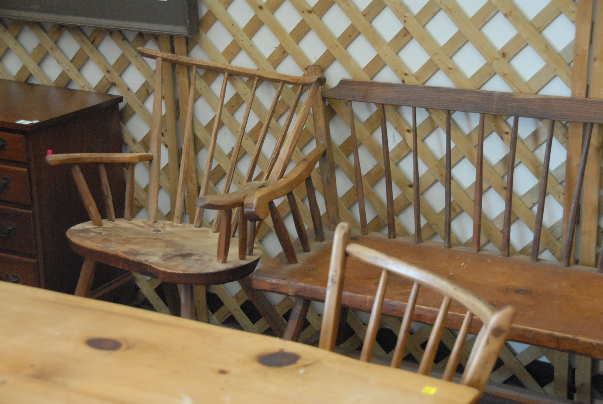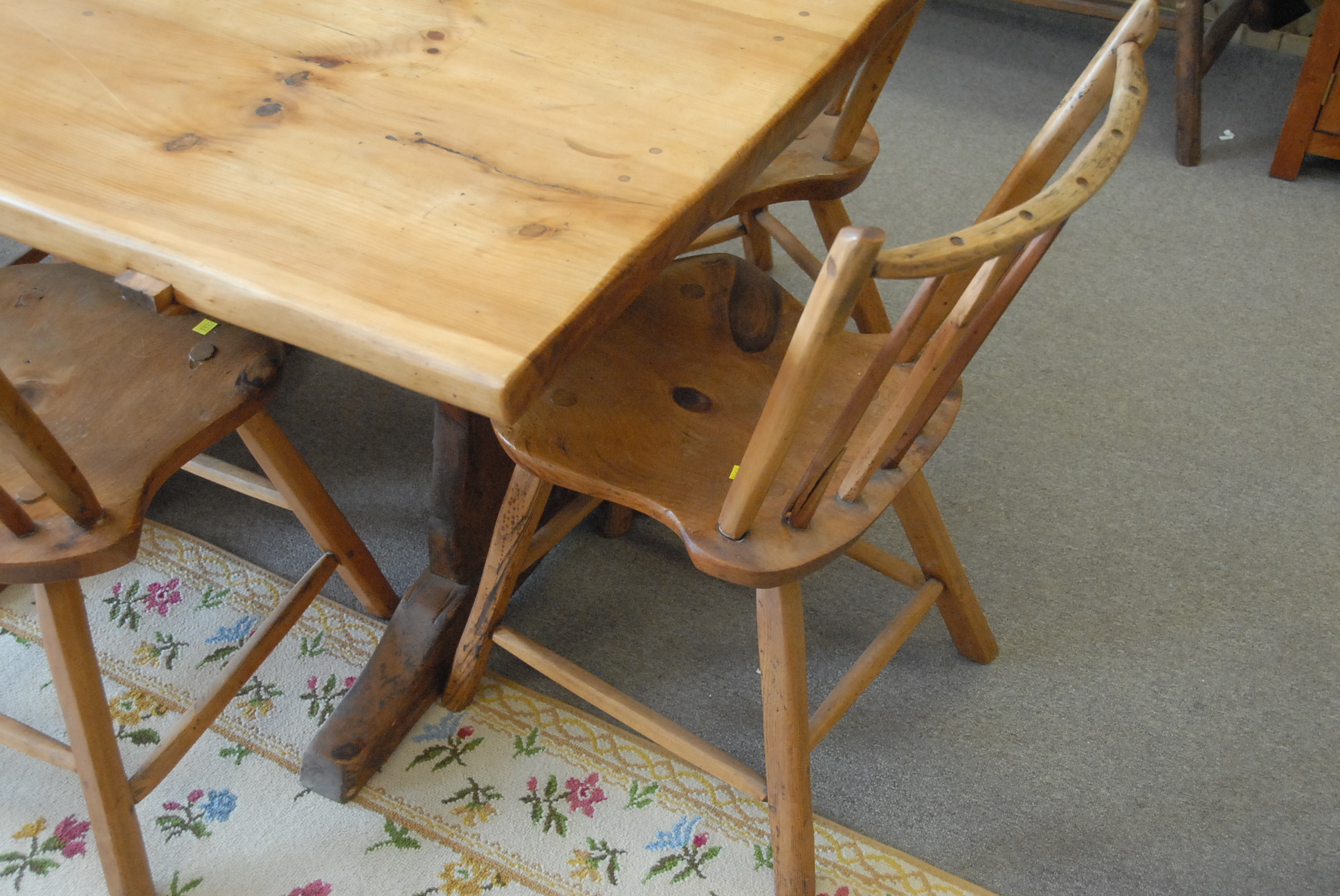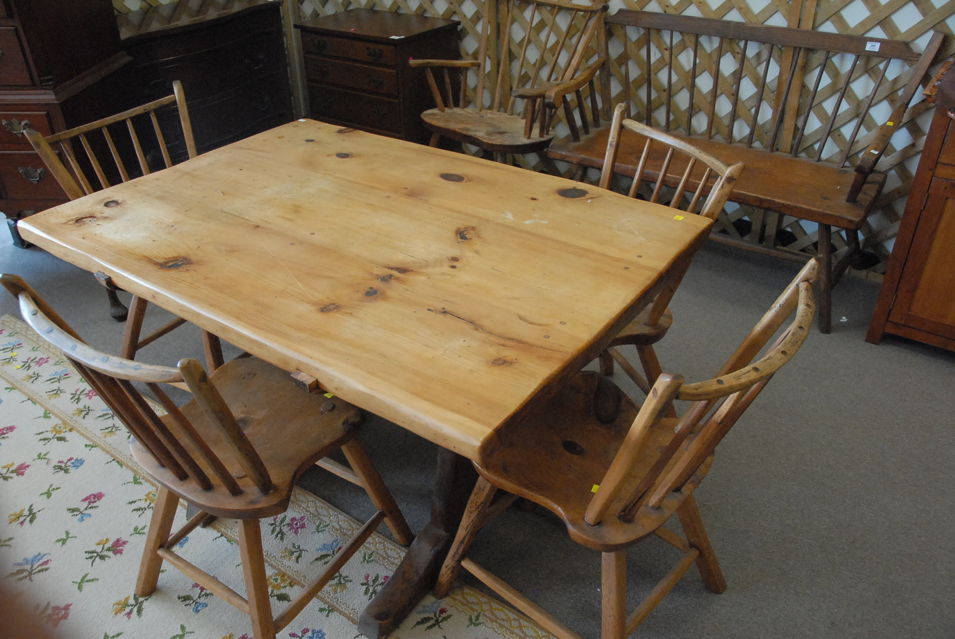Seven piece lot including Hunt bench along with five chairs and a table attributed to Hunt.