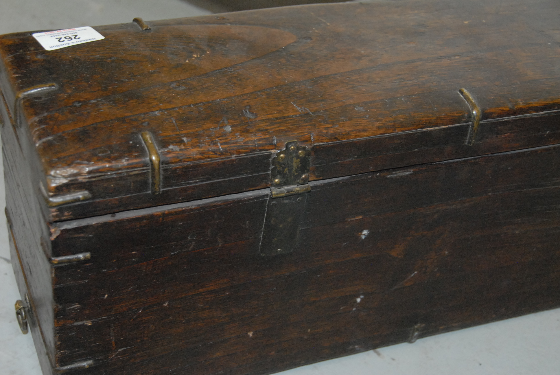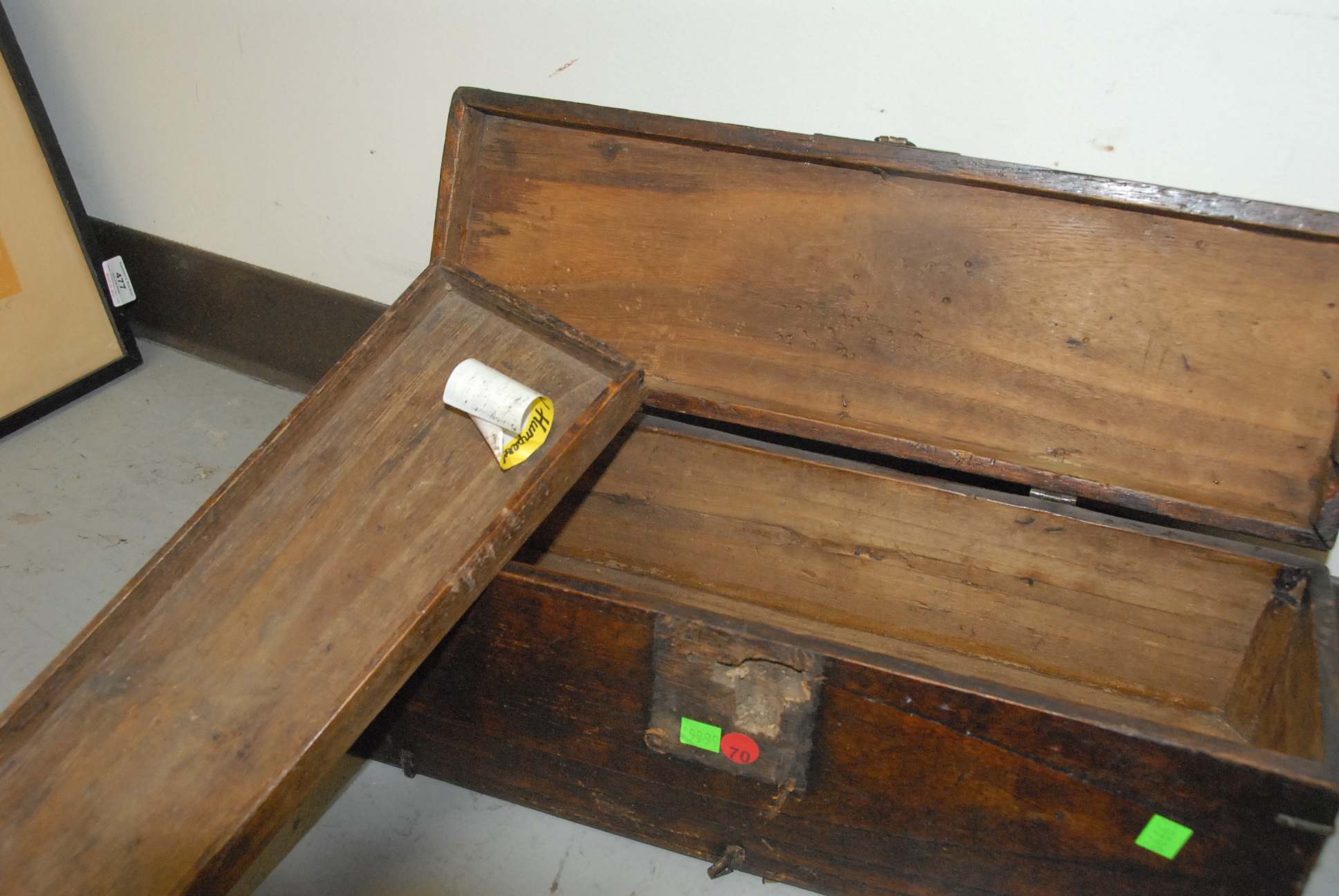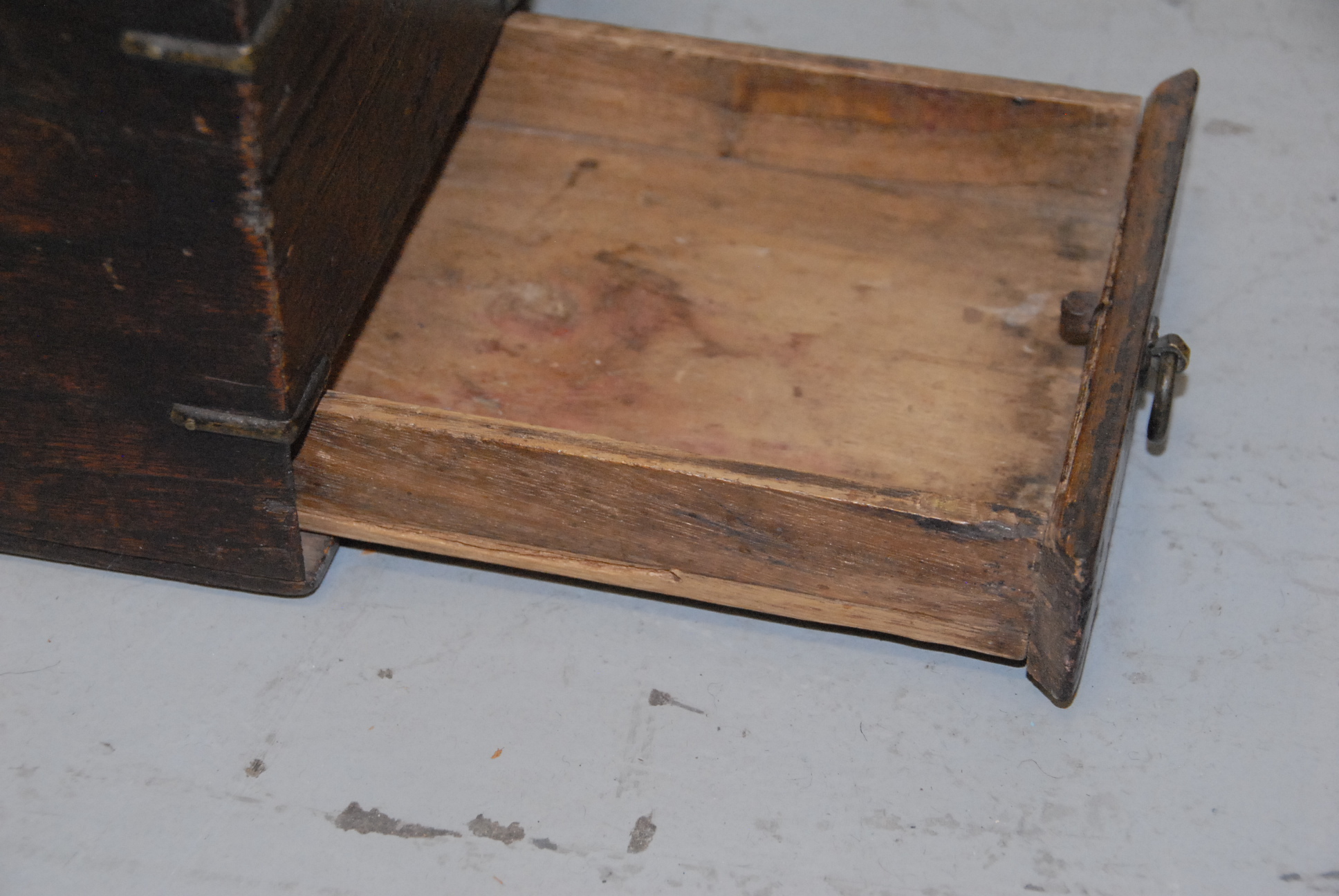Lot 262: Small wooden chest Bandaji with tray and two compartments, iron hardware and secret bottom side drawer, missing lower iron fastening plate, Korea, Joseon Dynasty, 19th century. ht. 8in. lg. 20in. wd. 6in.