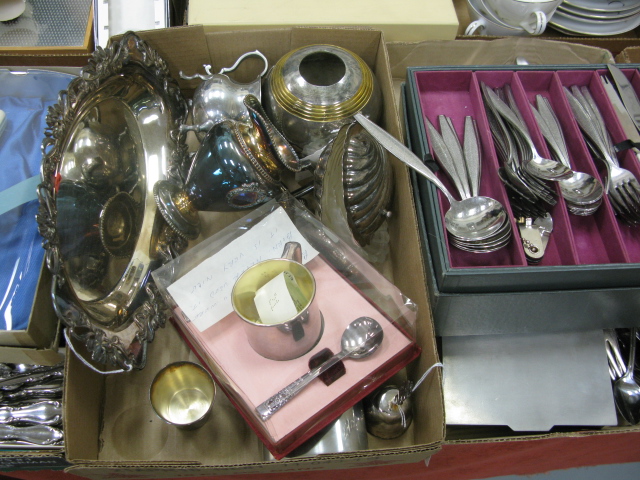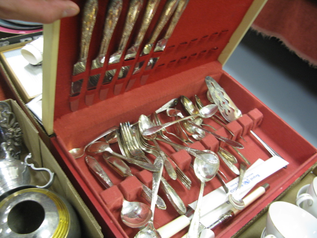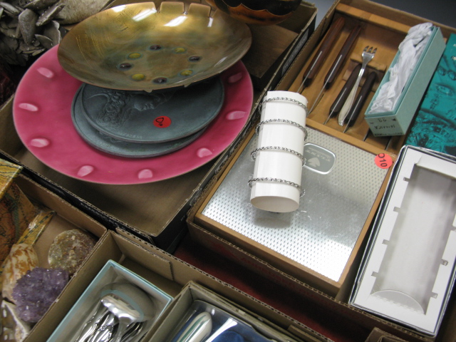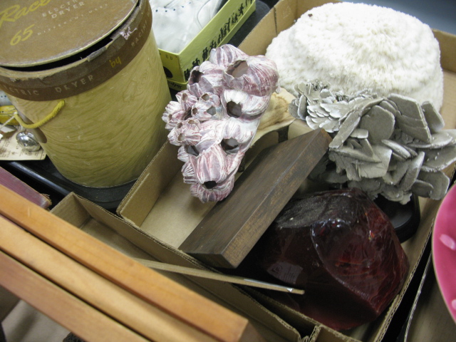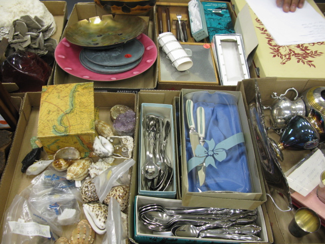 Ten box lots of miscellaneous items to include silver plated flatware, shells, wooden printing blocks, coral, large book etc