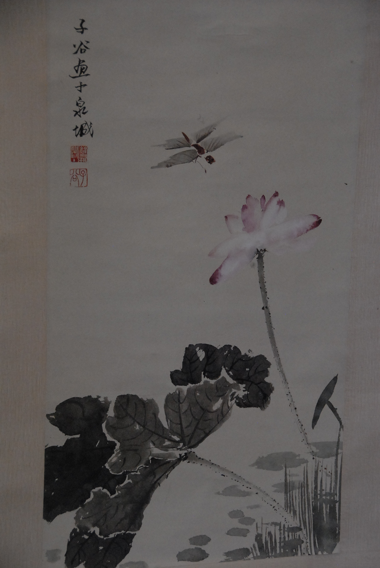 Three Oriental scrolls watercolor on paper of town’s edge 27 x 18, watercolor on silk of crane 25 x 17, watercolor on paper of dragon fly and flower 26 x 18.