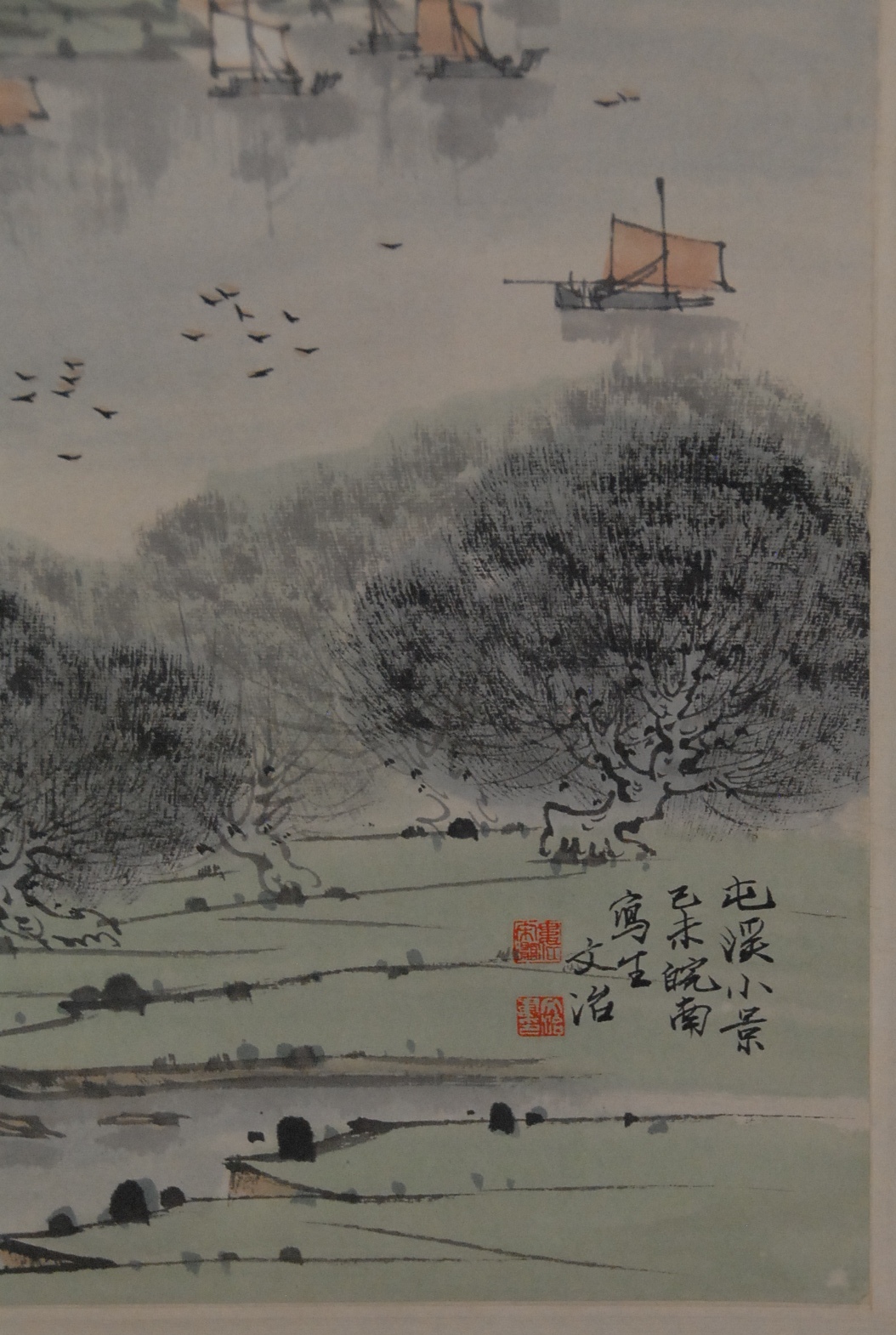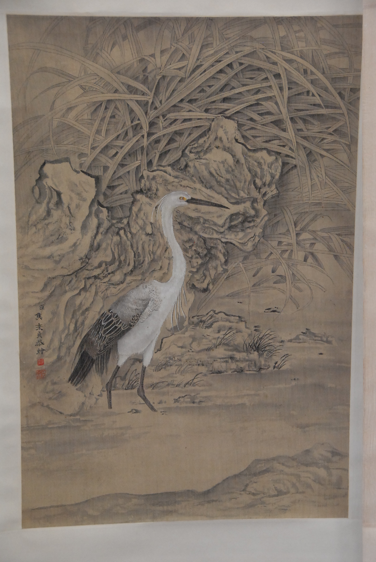 Lot 262: Three Oriental scrolls watercolor on paper of town’s edge 27 x 18, watercolor on silk of crane 25 x 17, watercolor on paper of …