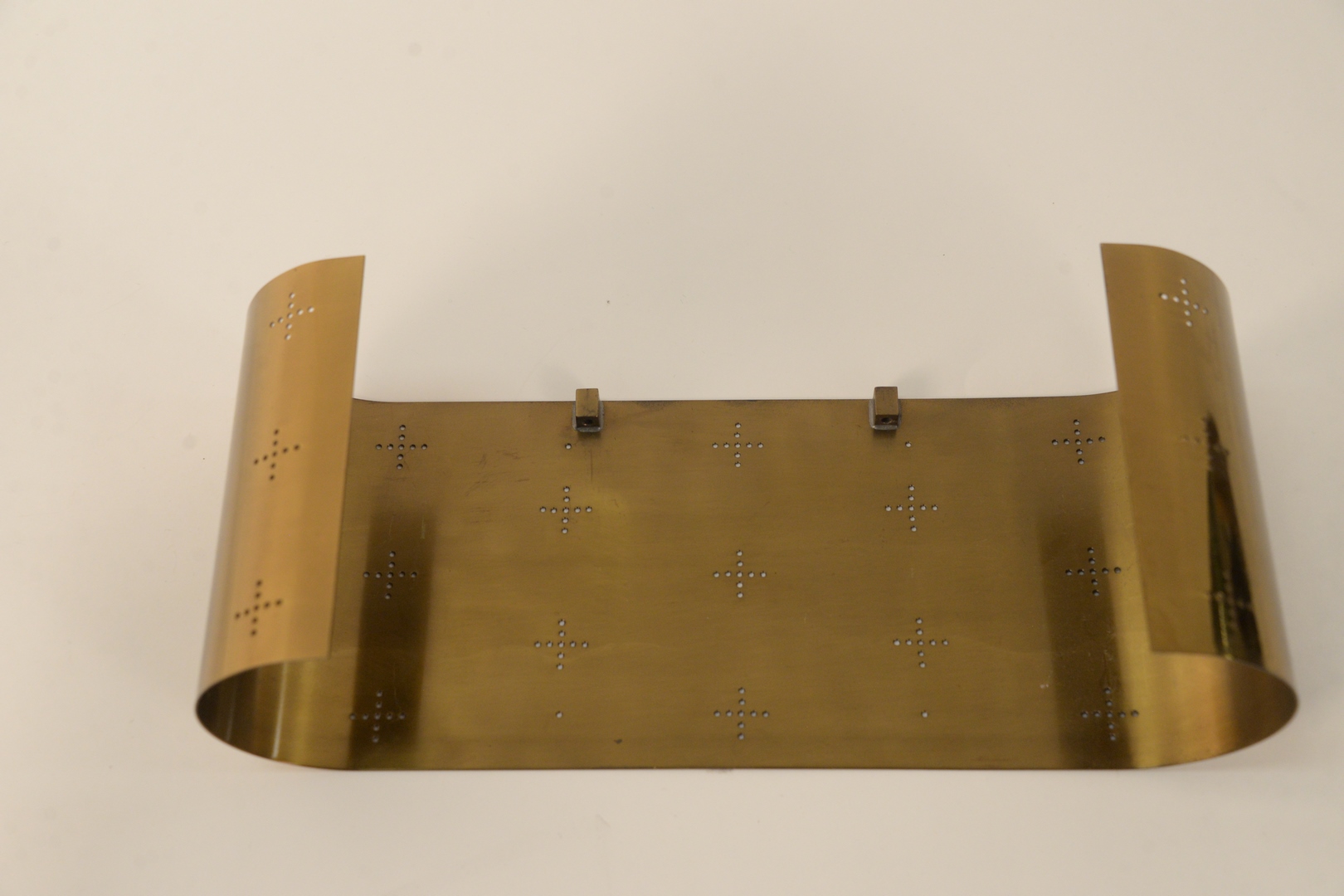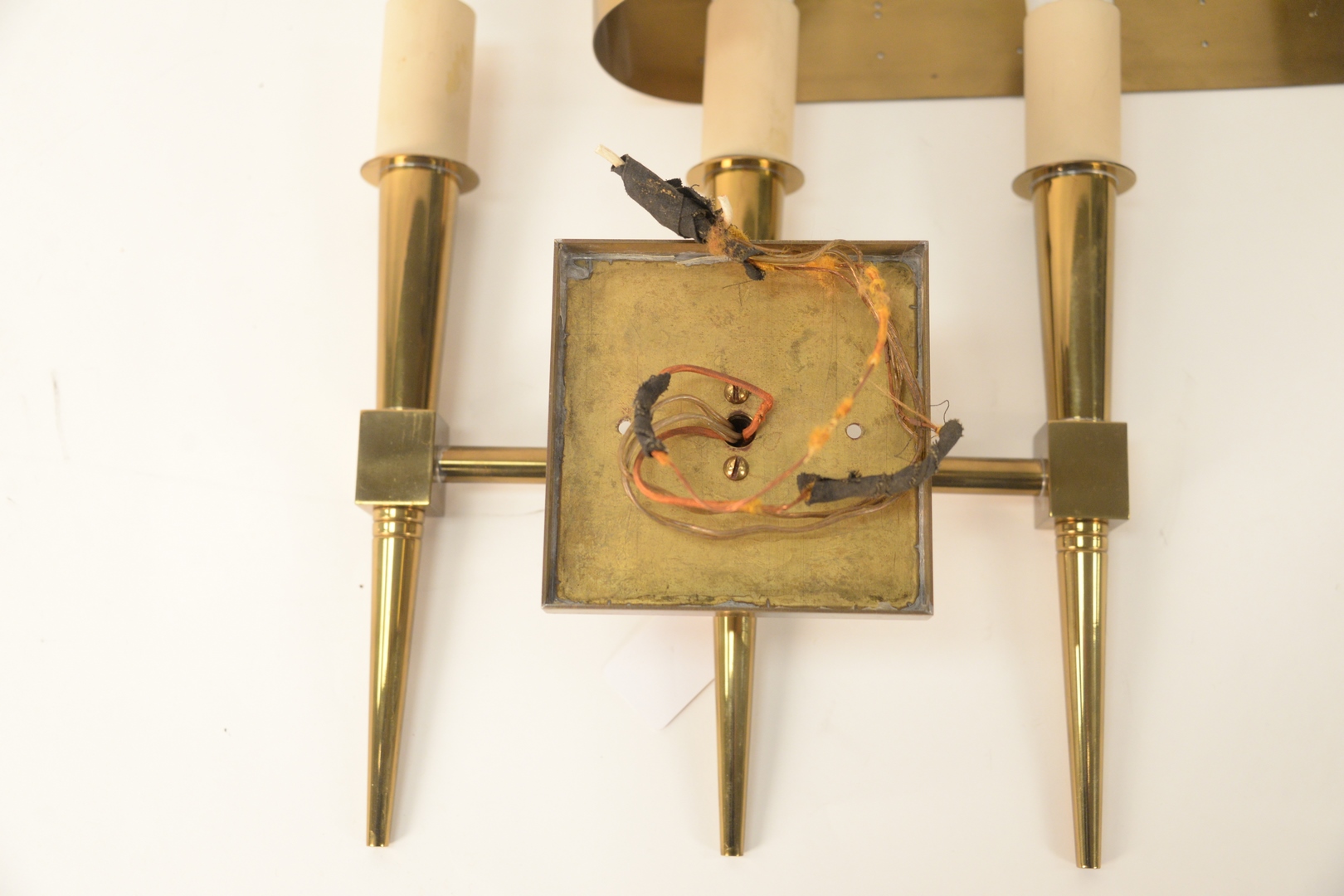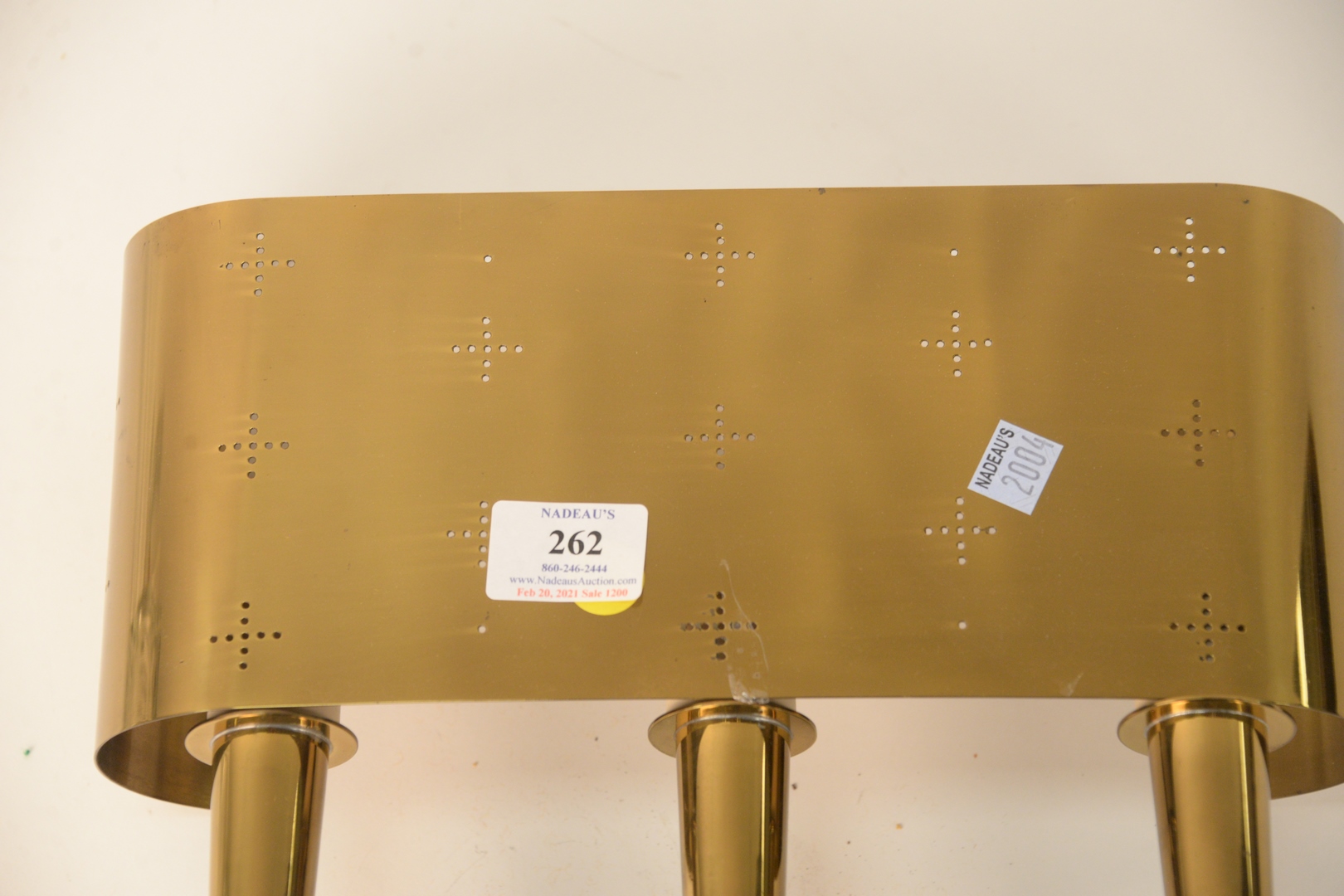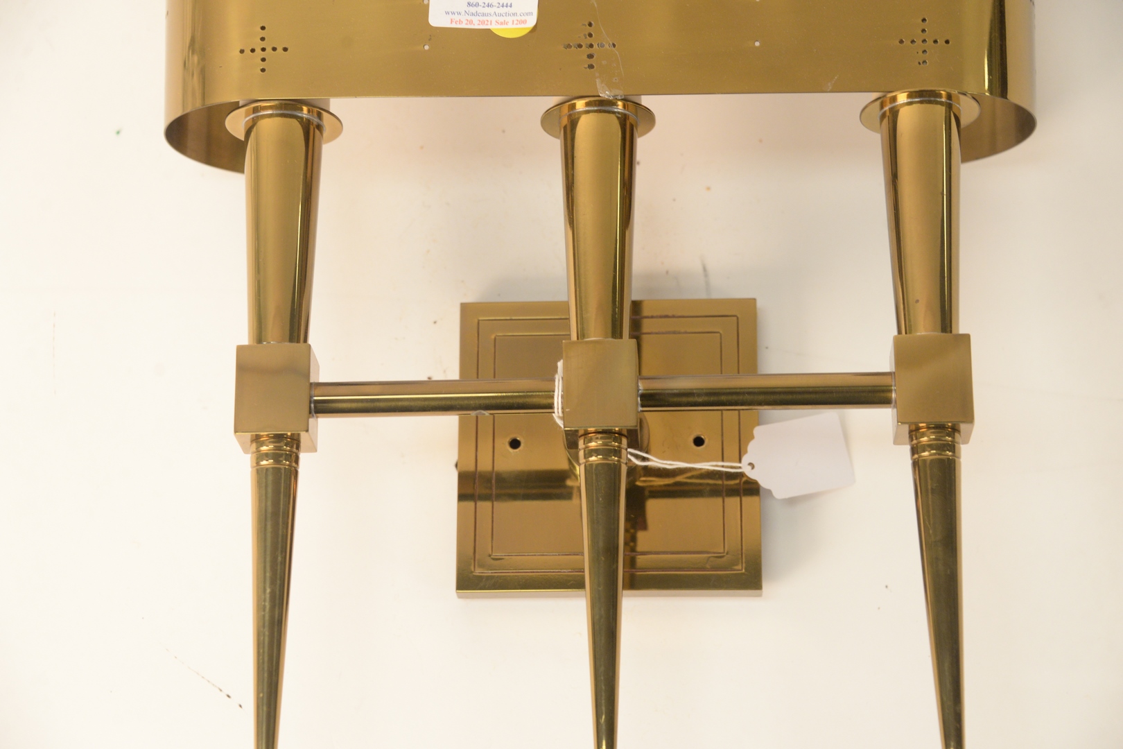 Lot 262: Tommi Parzinger Three-Light Brass Wall Sconce, with pierced brass shade, height 9 inches, width 12 1/2 inches, depth 3 1/4 inches. Provenance: The Estate of Alina Roisen, Park Avenue, New York.