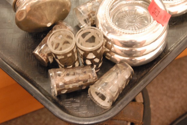 Tray lot of sterling silver overlay, shot glasses, coasters and covered jar.