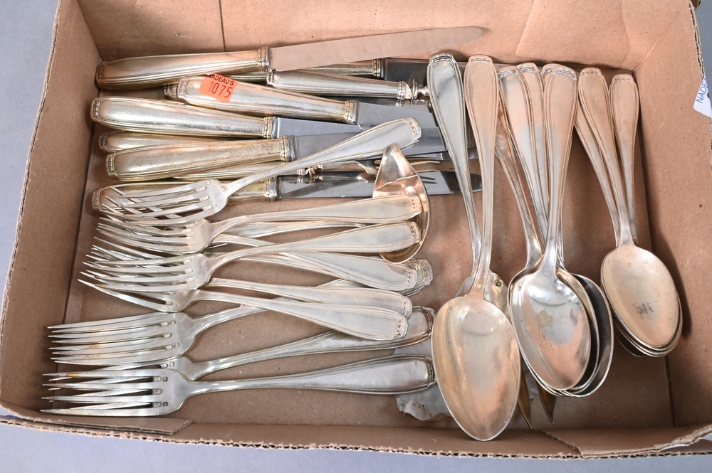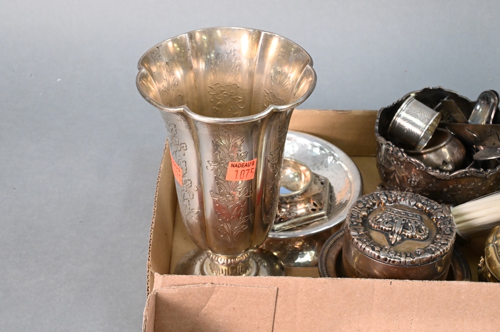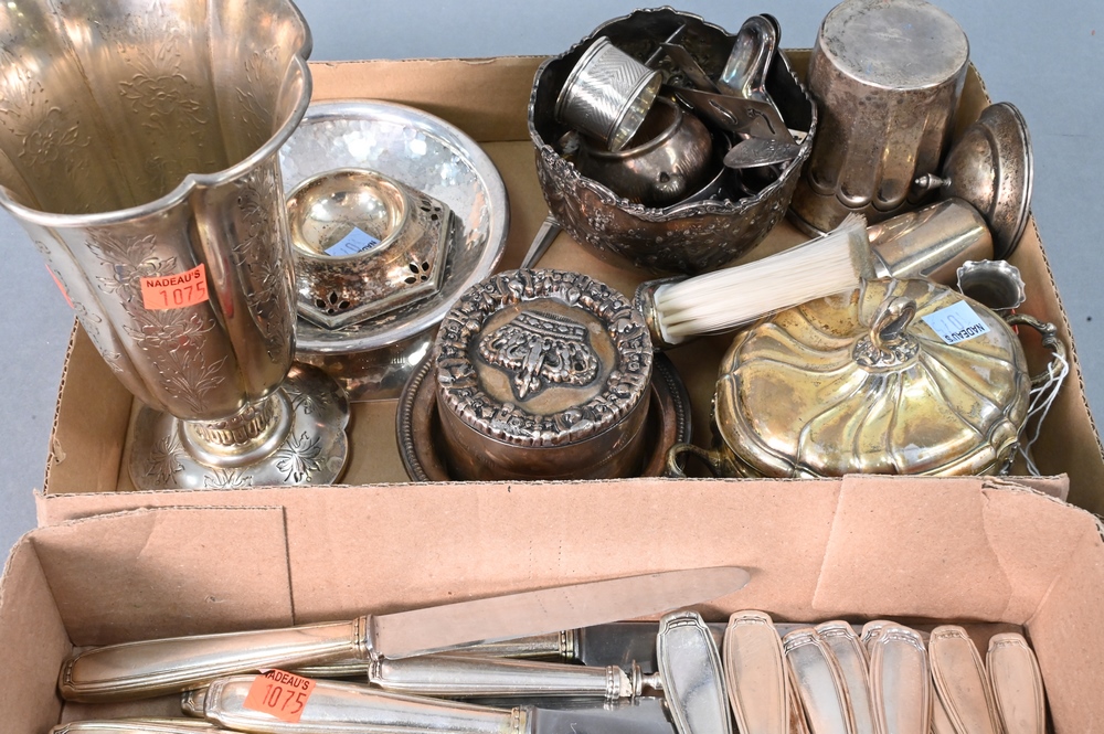 Lot 262: Two Tray Lots of Silver, to include vermeil covered sugar bowls, music plaque, etc., along with silver plated pieces and silver plated flatware, height 8 inches, 43.7 t.oz.