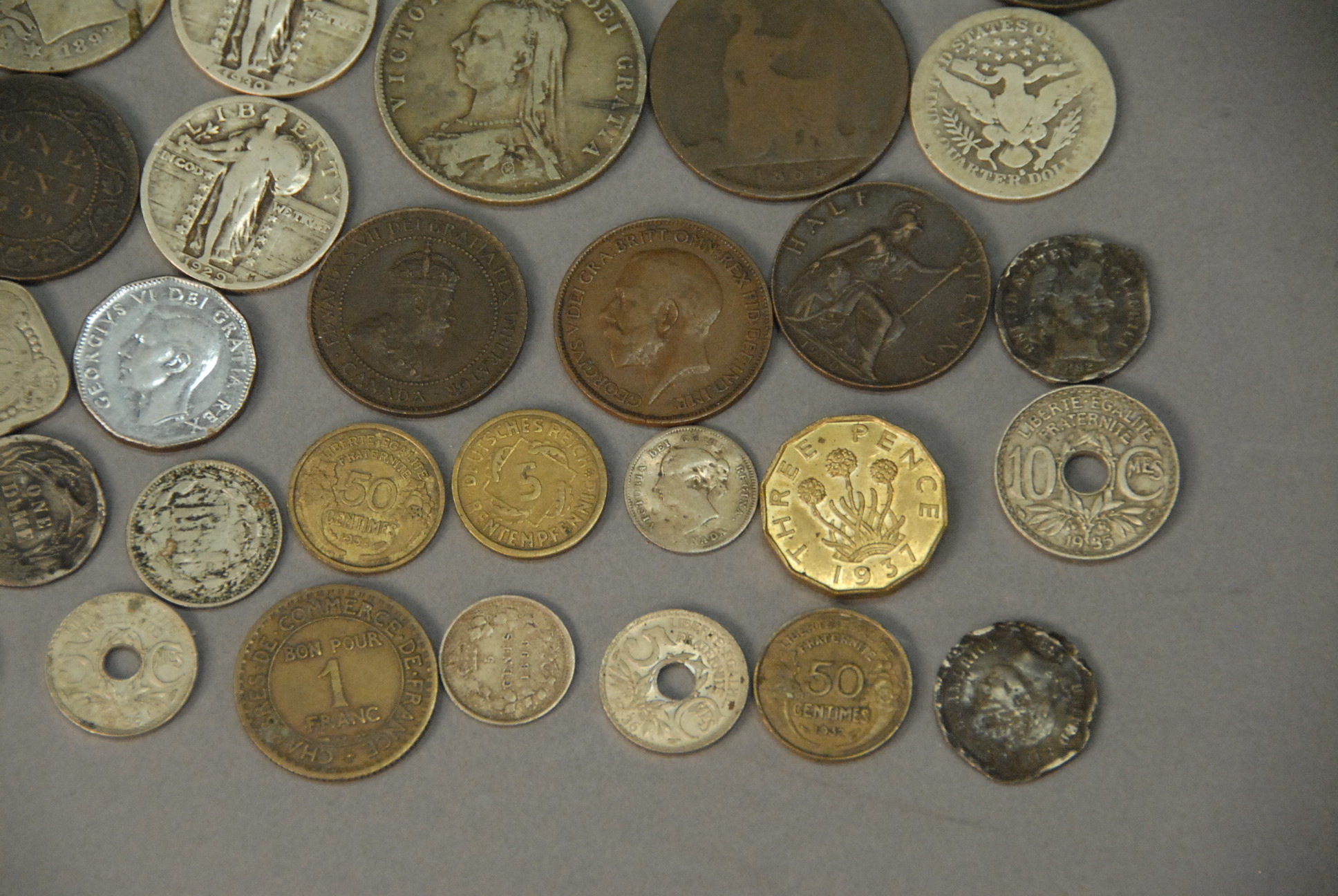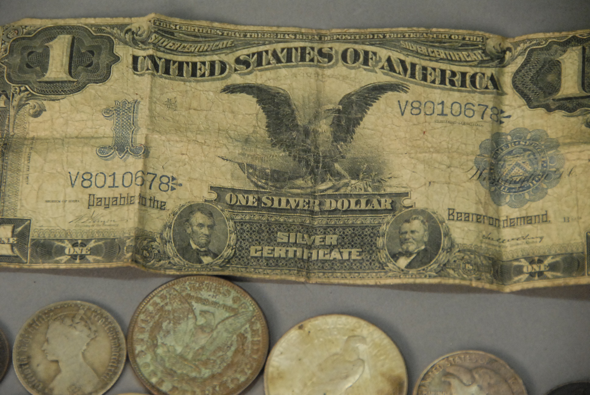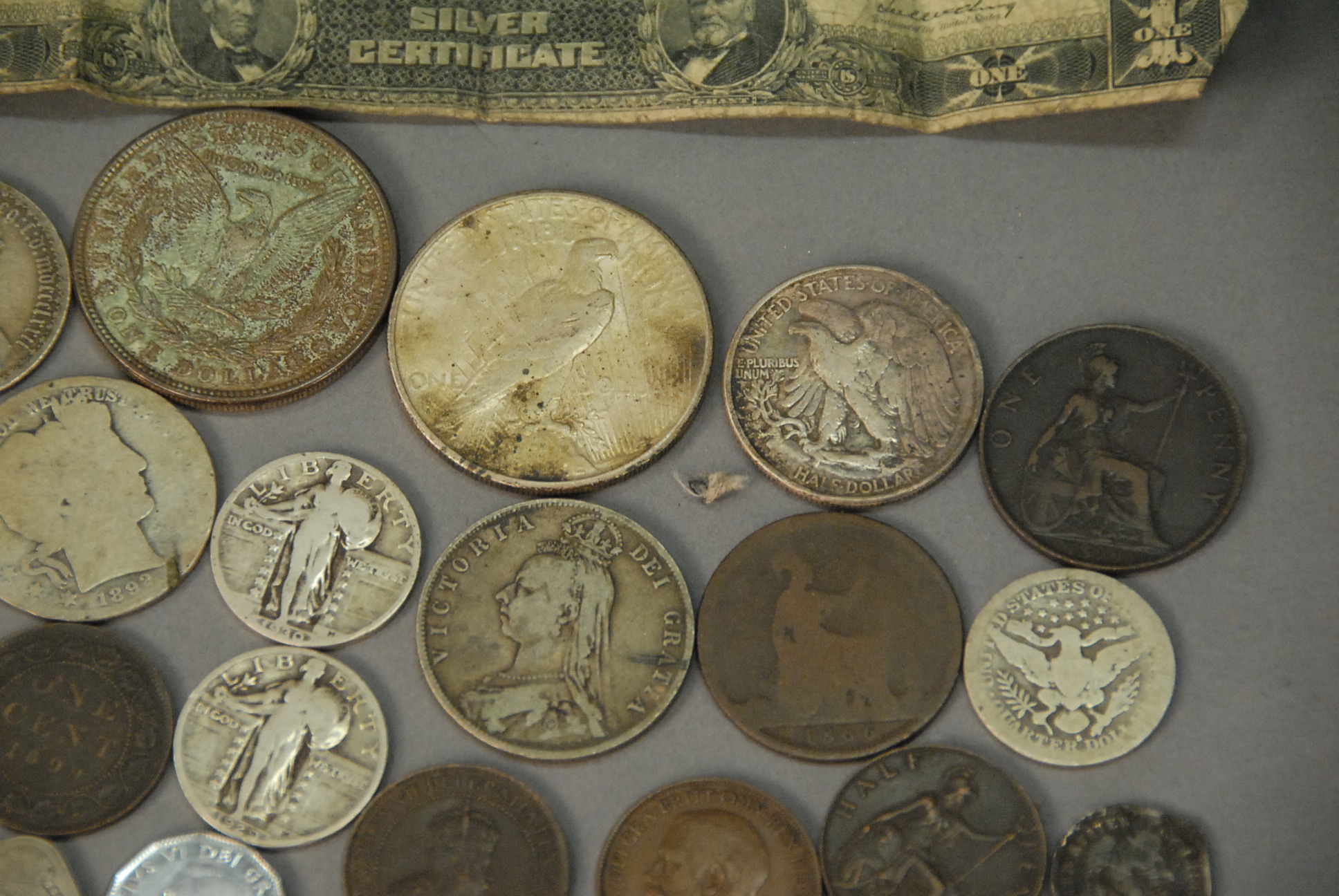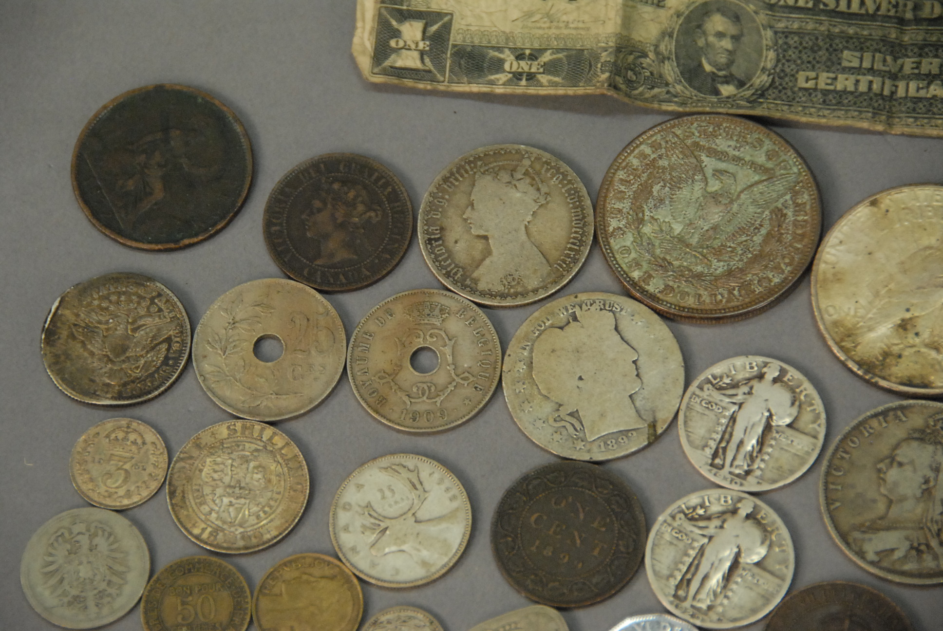 Lot 262A: Group of money to include silver certificate, two Liberty dollars, three large one-cent, 1/2 penny Canadians, etc.