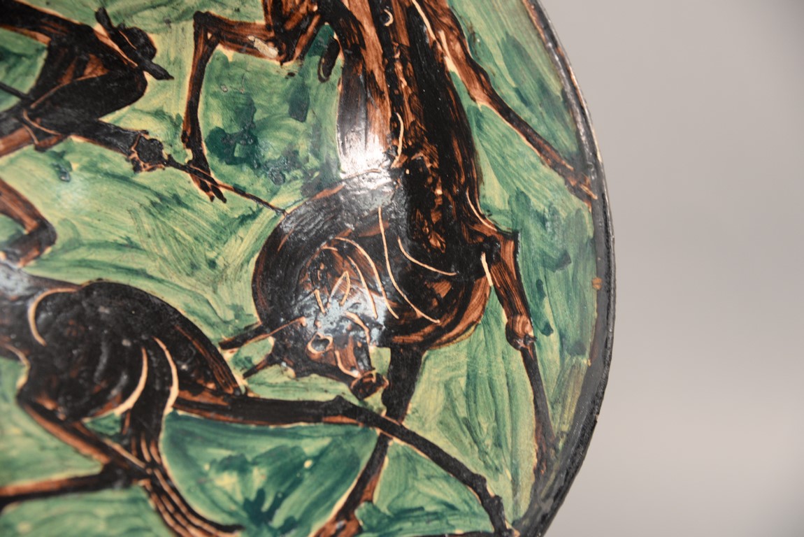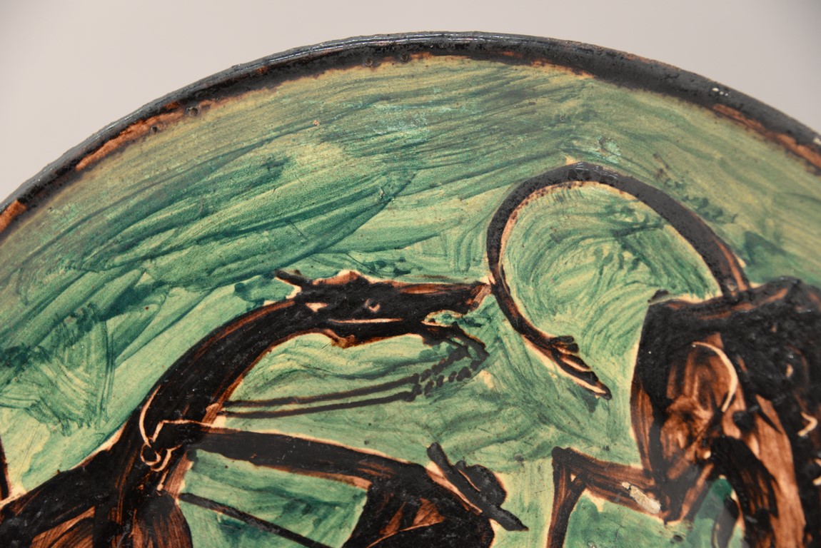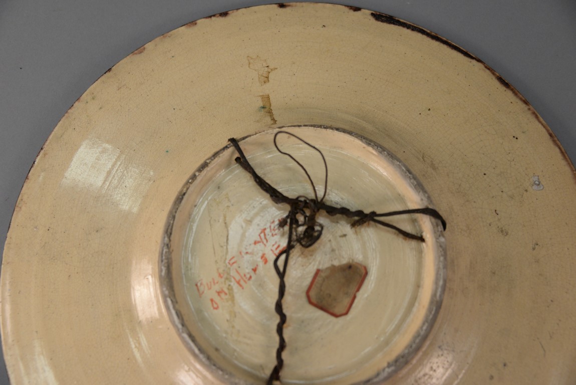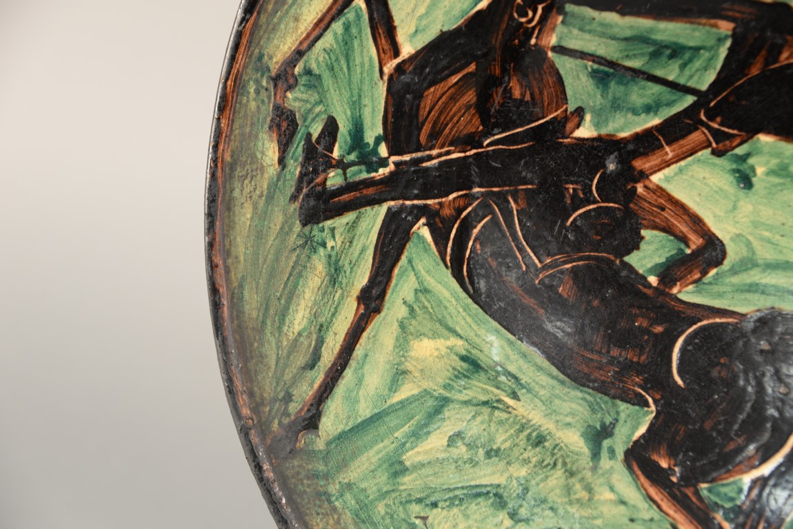 Lot 262A: WILLIAM HUNT DIEDERICH 1884-1953 glazed Faience charger with bull fighter on horseback, signed H. Diederich. dia. 15 in.