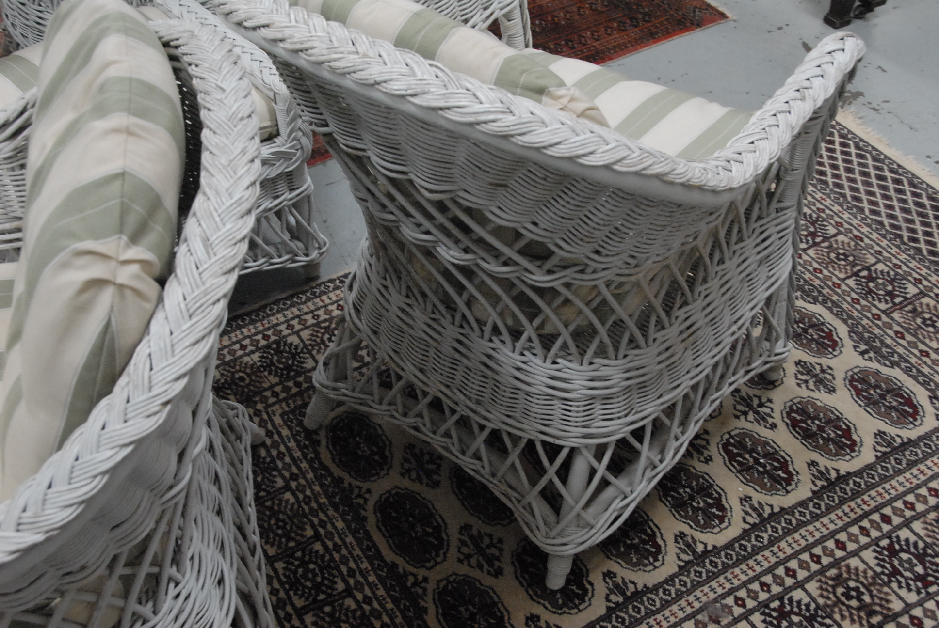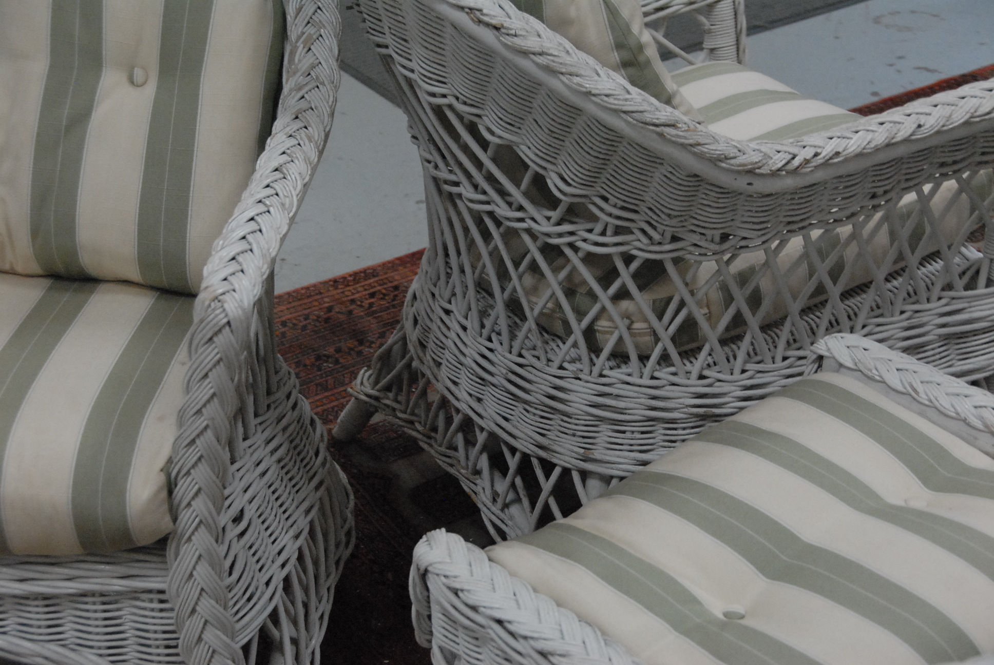 Vintage Bar Harbor five piece wicker set to include four chairs and an ottoman, all with cushions.