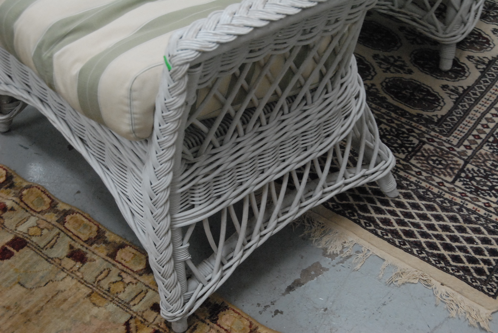 Lot 262D: Vintage Bar Harbor five piece wicker set to include four chairs and an ottoman, all with cushions.
